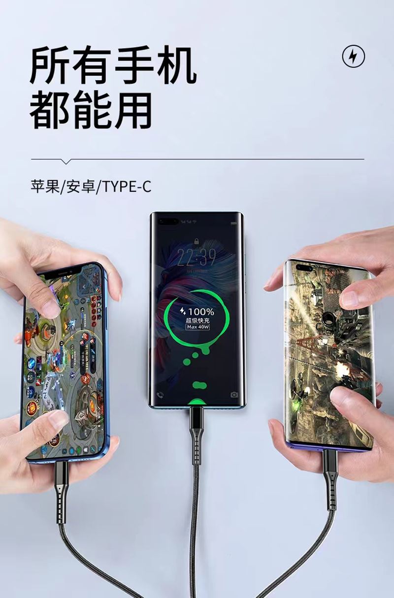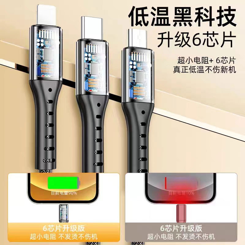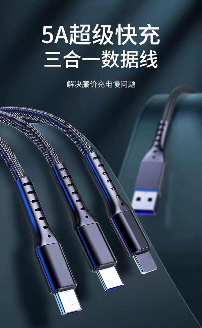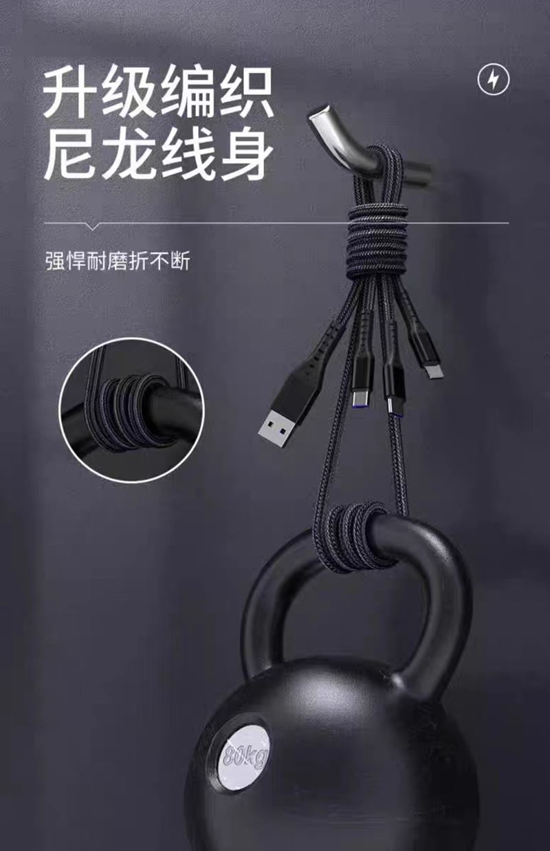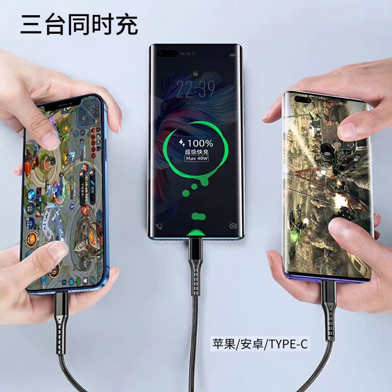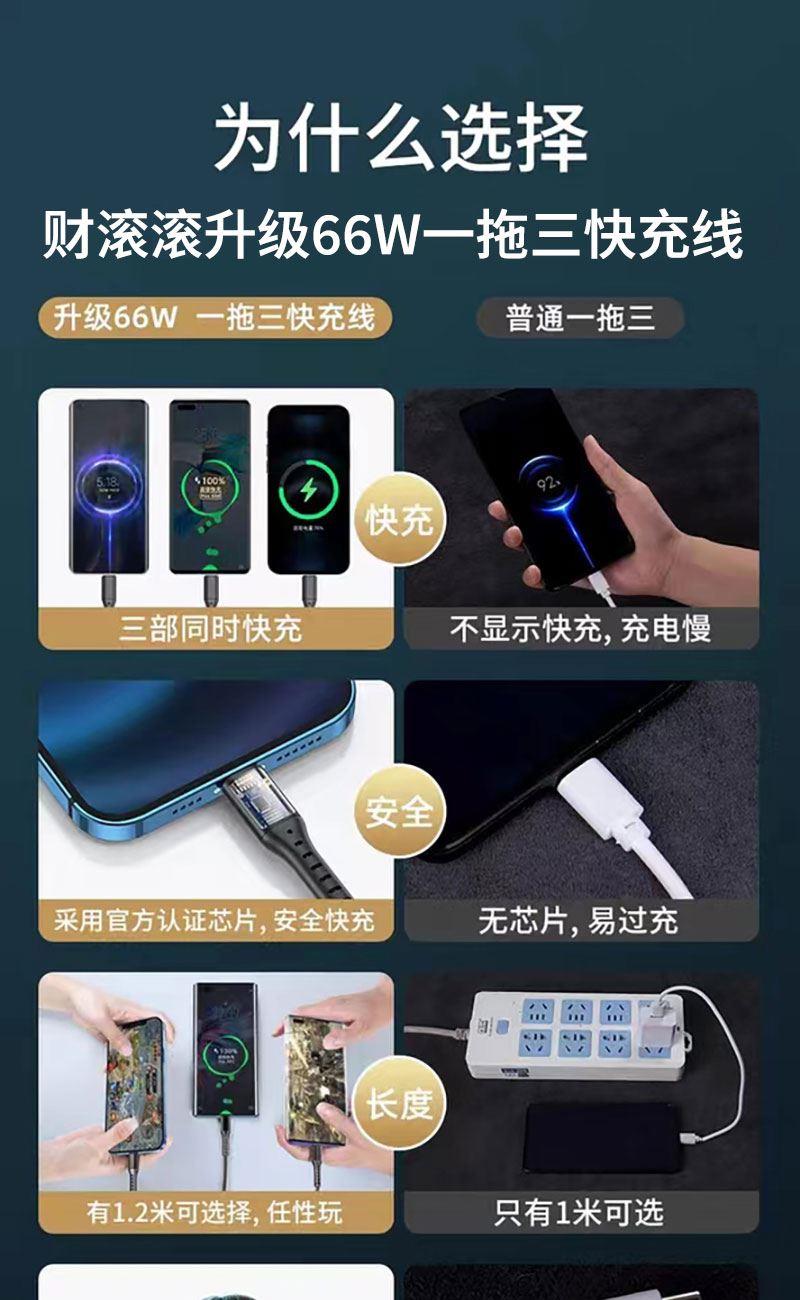 数据线长度:120cm 分线接头数量:一托三 颜色:红色 材料:硅胶+铝金合头 适用机型:苹果/安卓/Type-C • 66W超级快充:可充电任何手机,数码设备接口。 • 定制LOGO宣传 • 经济实用性价比高 出货速度快