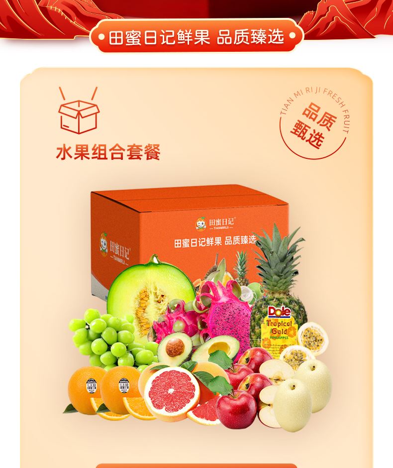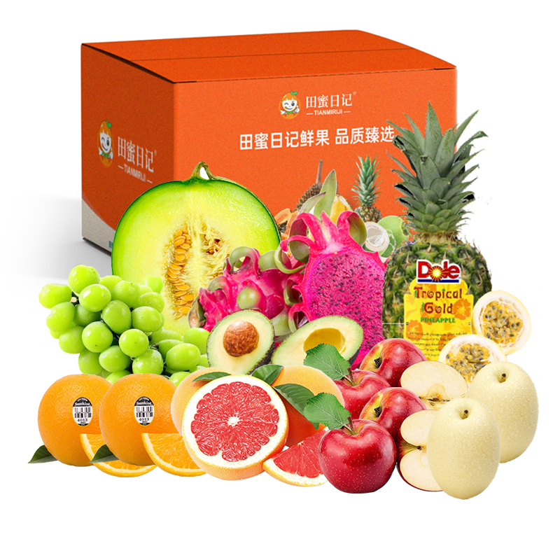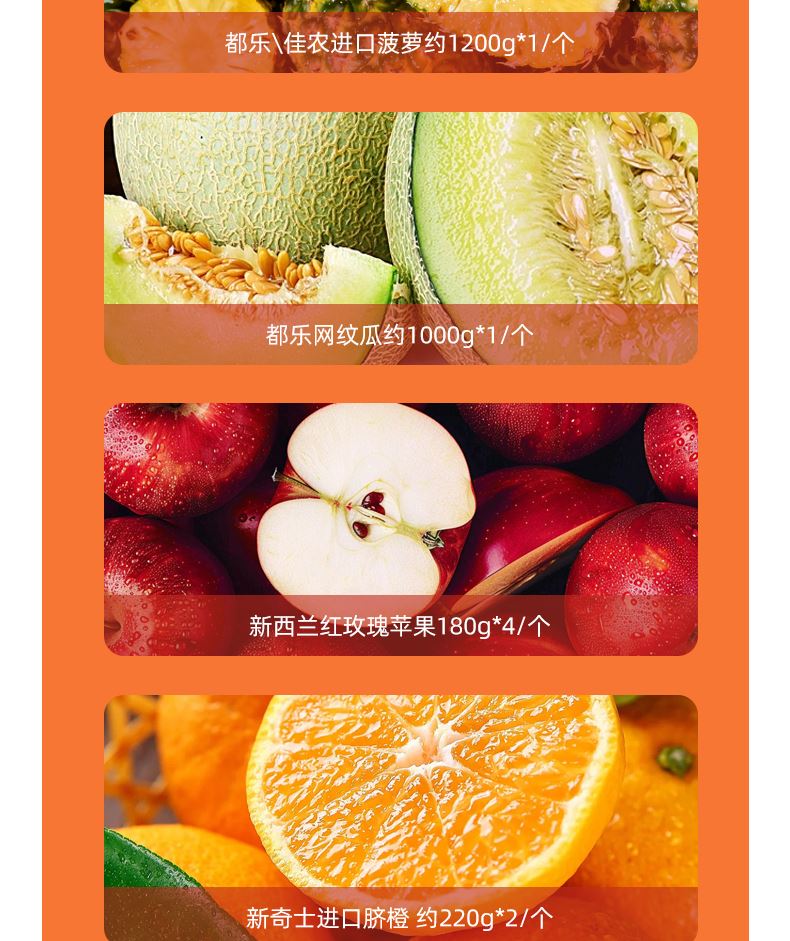 "都乐菲律宾进口菠萝约1200g*1/个 都乐网纹瓜约1000g*1/只 新西兰红玫瑰苹果180g*4/个 新奇士进口脐橙 约220g*2/个 进口牛油果约150g*4/个 精品时令梨 约250g*2/个 都乐百香果约70g*2/个 蜜保火龙果约400g*1/个 进口西柚约300g*2/只 阳光玫瑰葡萄约500g*1盒 ( 时令鲜果单品断档会替换等价单品)"