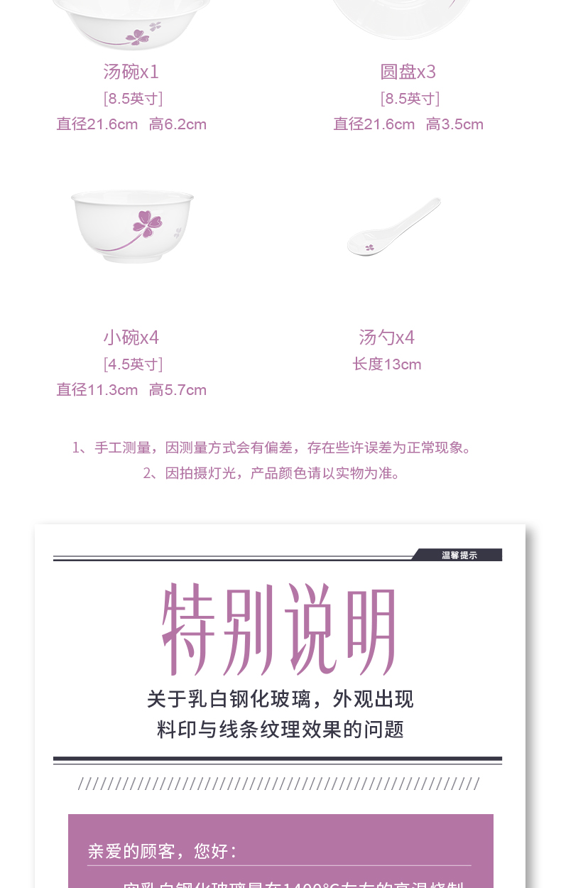 汤碗x1 [8.5英寸] 直径21.6cm 高6.2cm 圆盘x3 [8.5英寸] 直径21.6cm 高3.5cm 小碗x4 [4.5英寸] 直径11.3cm 高5.7cm 汤勺x4 长度13cm