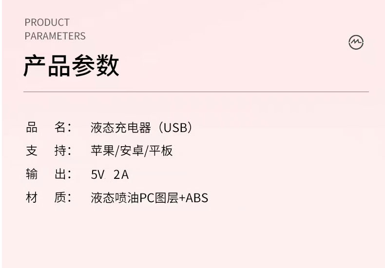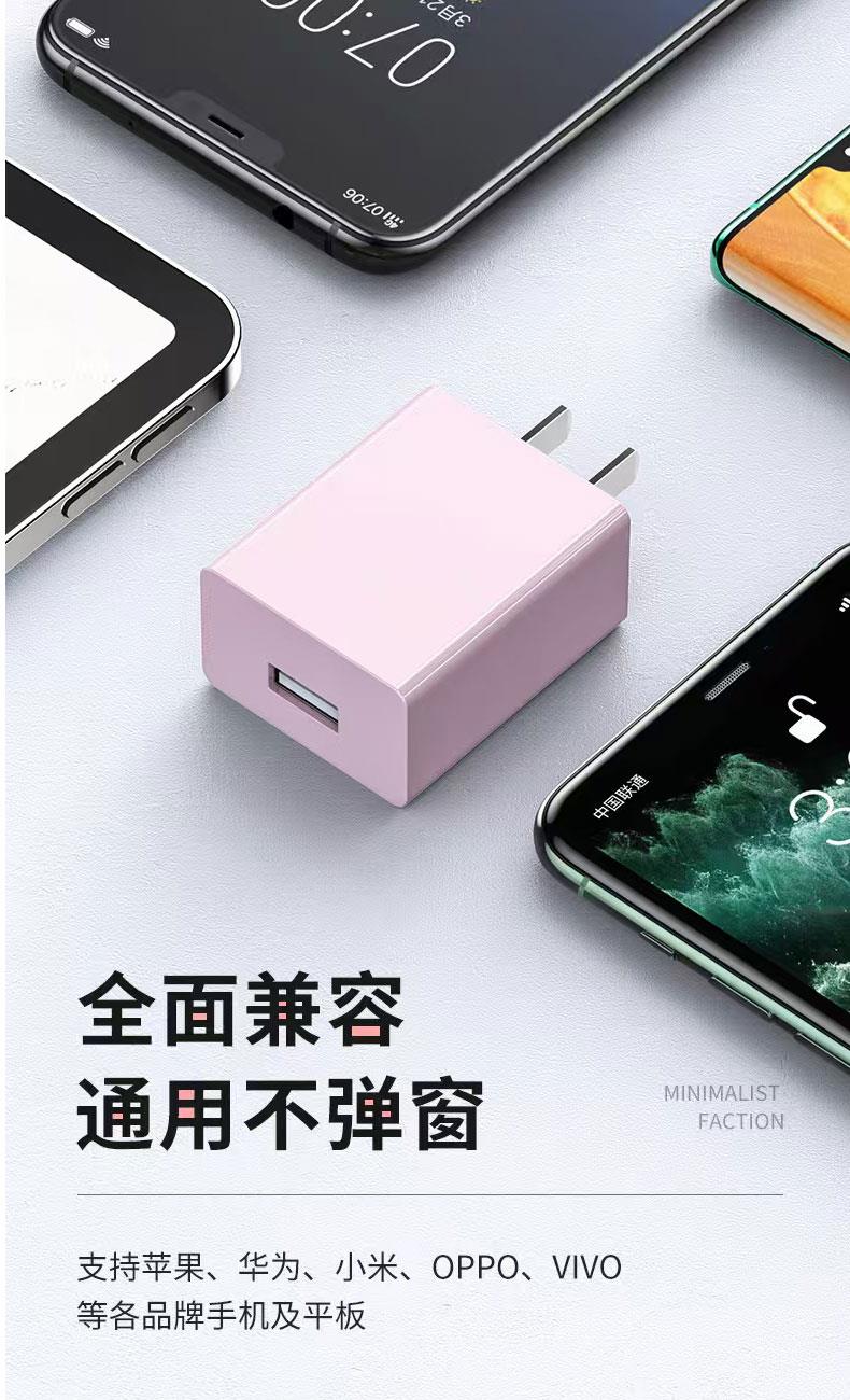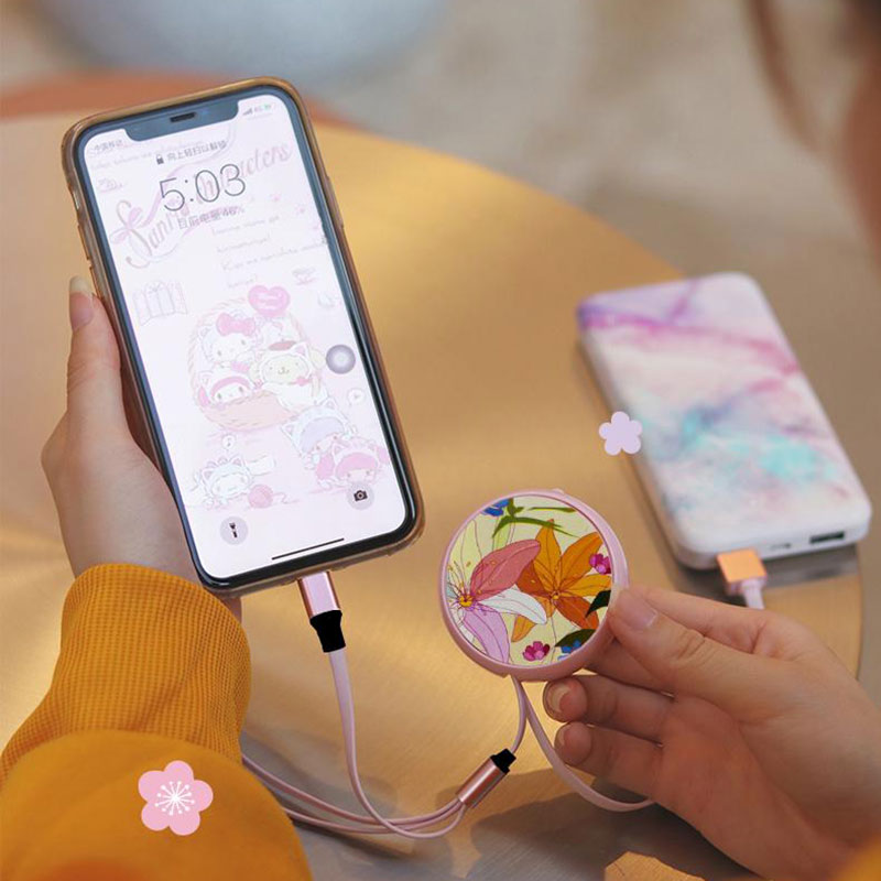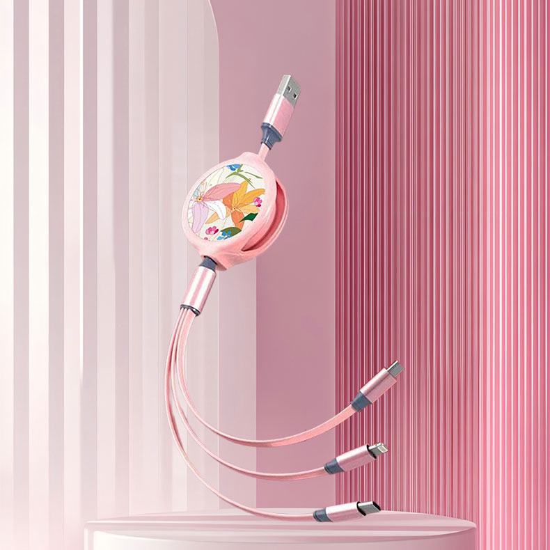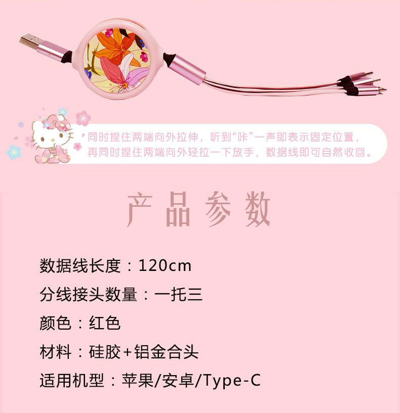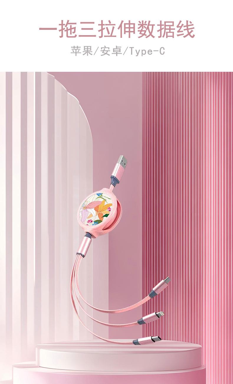 一拖三伸缩数据线 长度:120cm 分接头数量:一托三 颜色:粉色 适用机型:苹果/安卓/Type-C 材料:硅胶+铝金合头 手机充电头 输出口:USB 输入电流:AC100-240、50/60HZ 颜色:粉色 输出电流:5V 2A 材料: PC材质,V0级防火 尺寸:36mm*23mm*63mm • 女神花一拖三拉伸数据线:美好寓意,马上好运,好运连连。可充电任何手机,数码设备接口。 自由伸缩,小巧便携。 • 手机充电头:USB口,方便实用,3C安全认证。
