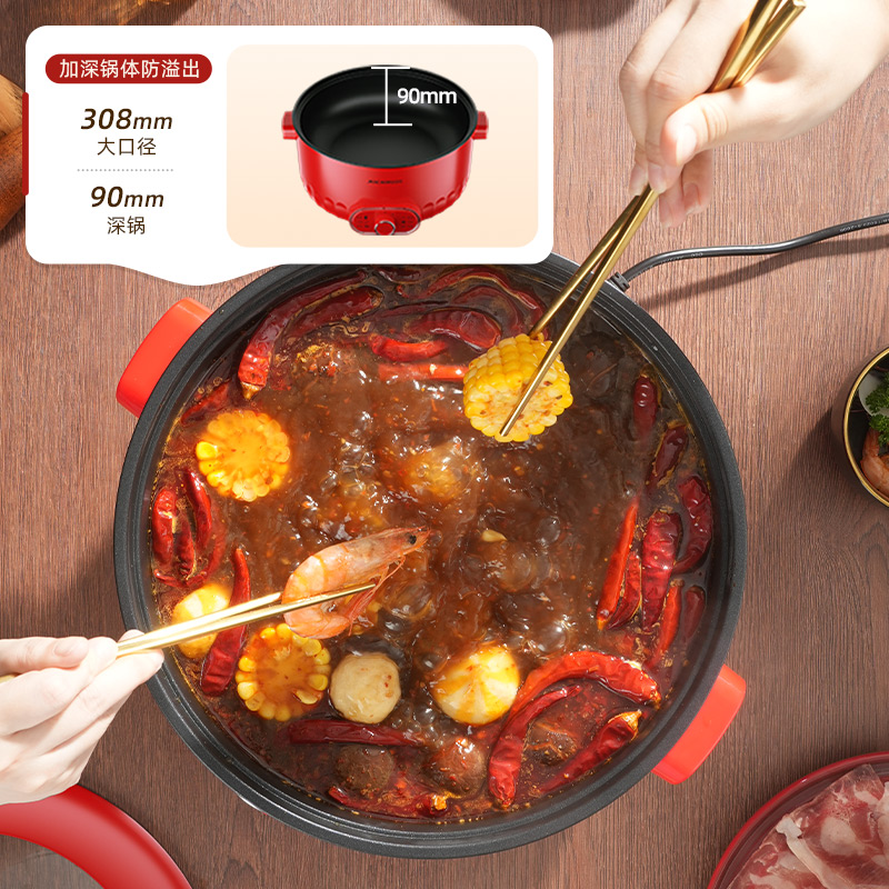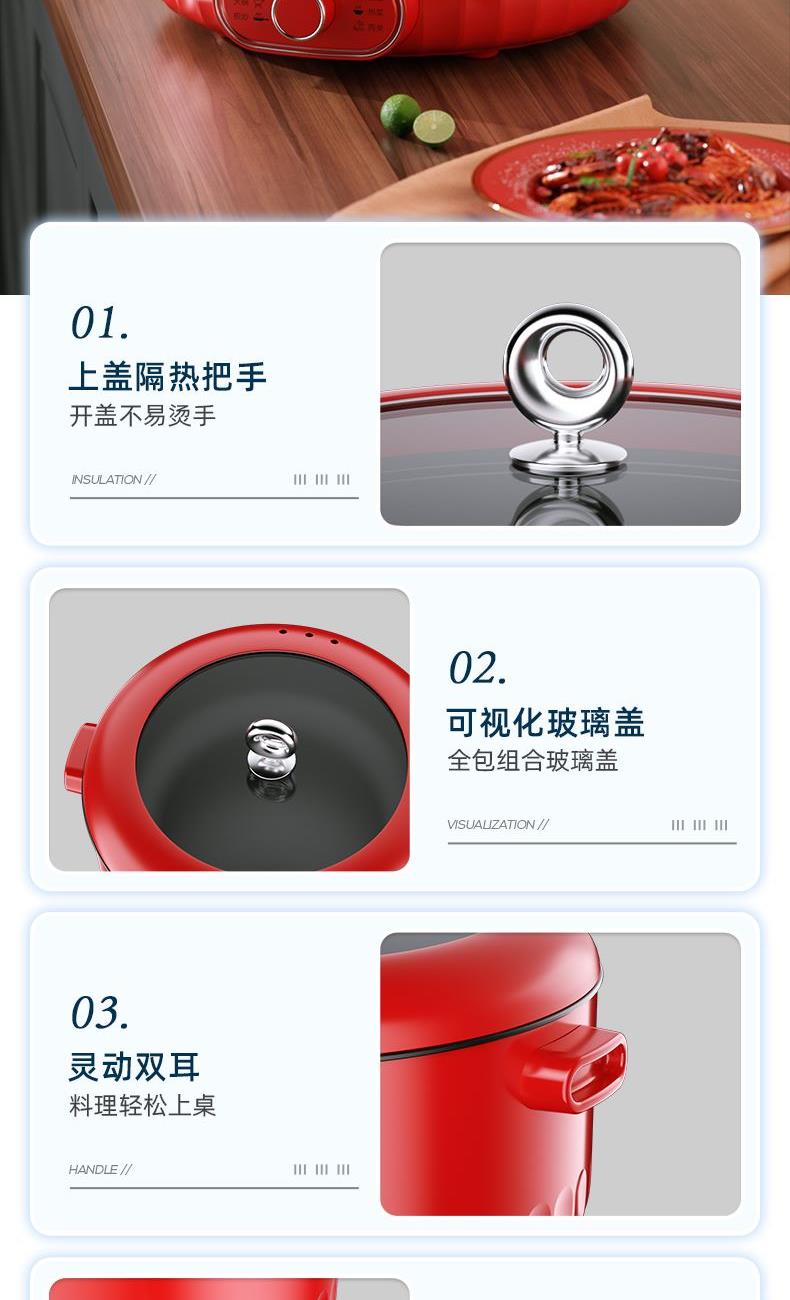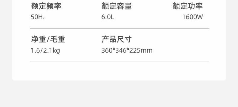 额定功率:1600W 额定容量:6.0L 额定电压:220V~ 额定频率:50Hz 产品净重:1.48kg 产品毛重:1.70kg 整箱重量:15.1kg 装 箱 数:8台/箱 一锅多用&火力调节煎/煮/涮/焖/炖一锅多用,两档火力调节,满足不同烹饪; 超大容量6L大容量锅胆,大口径和锅体足够深,适合聚餐用; 大功率1600W大功率,快速沸腾,开涮更尽兴; 不粘锅胆&组合盖可煎/可煮不粘锅胆,易清洗;全包组合玻璃盖。