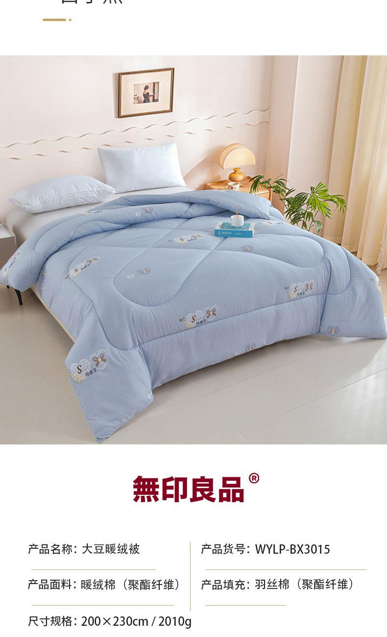 规 格:200×230cm 克重:2010g 面 料:暖绒棉(聚酯纤维) 填 充:羽丝棉(聚酯纤维) “無印良品”大染无印,优良品质的产品是年轻人喜欢的,设计, 优雅 , 质朴 , 自然 , 是無印良品的初心与追求。让体验更舒适。享受简约健康生活,走进無印,上善若水,大爱无疆,创新让生活更精彩。