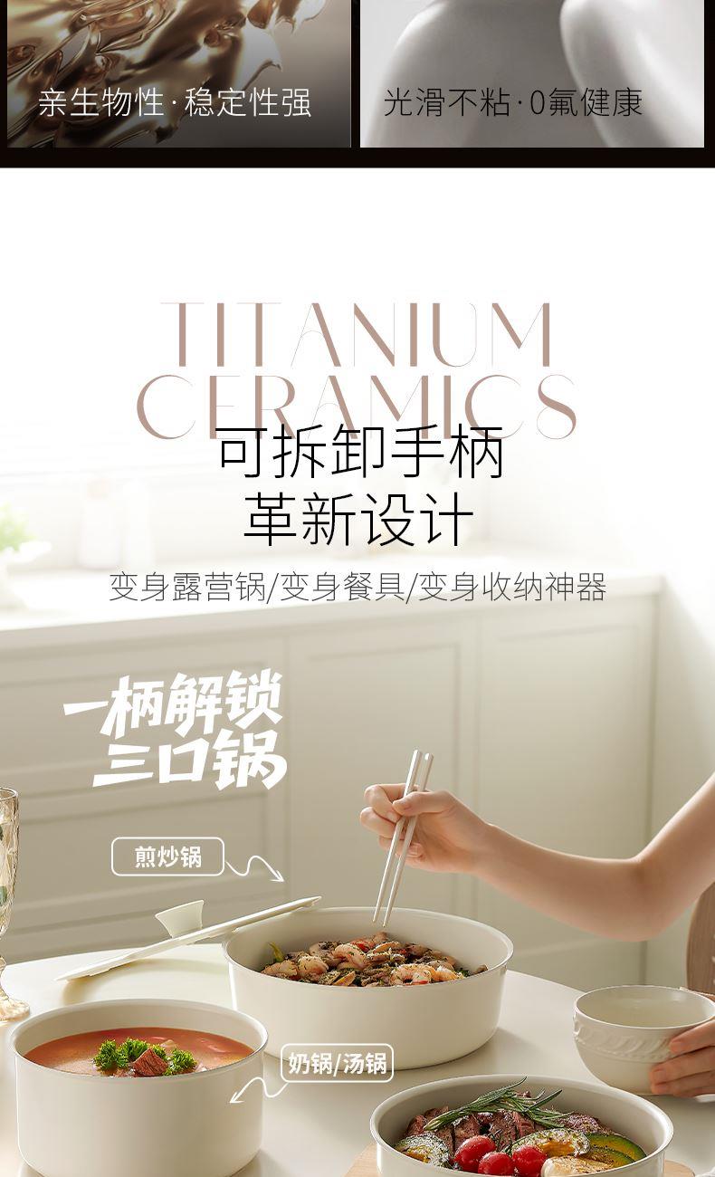 产品配置:24cm煎炒锅、20cm煎锅(无盖)、18cm奶锅、可拆卸手柄、保鲜盖*3