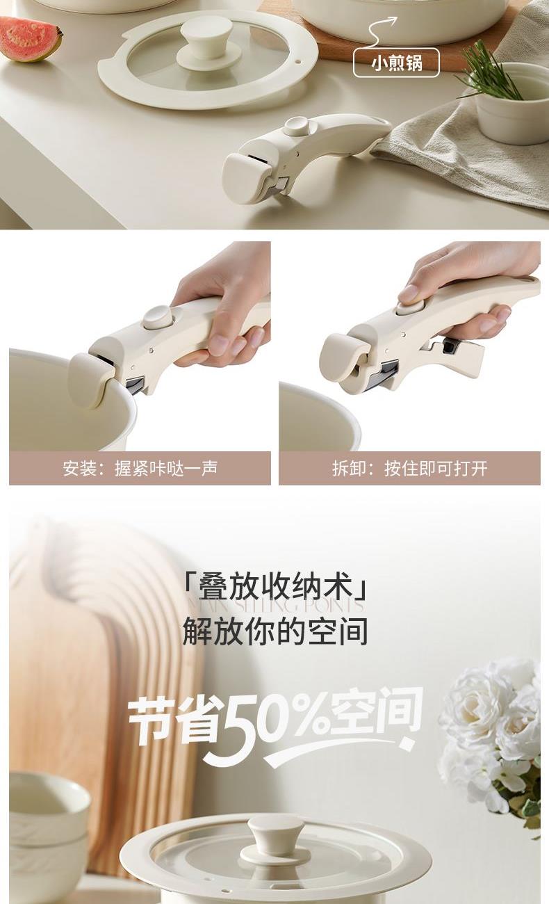 3、简约防烫手柄,按压拆卸,轻松操作,叠放收纳不占空间;