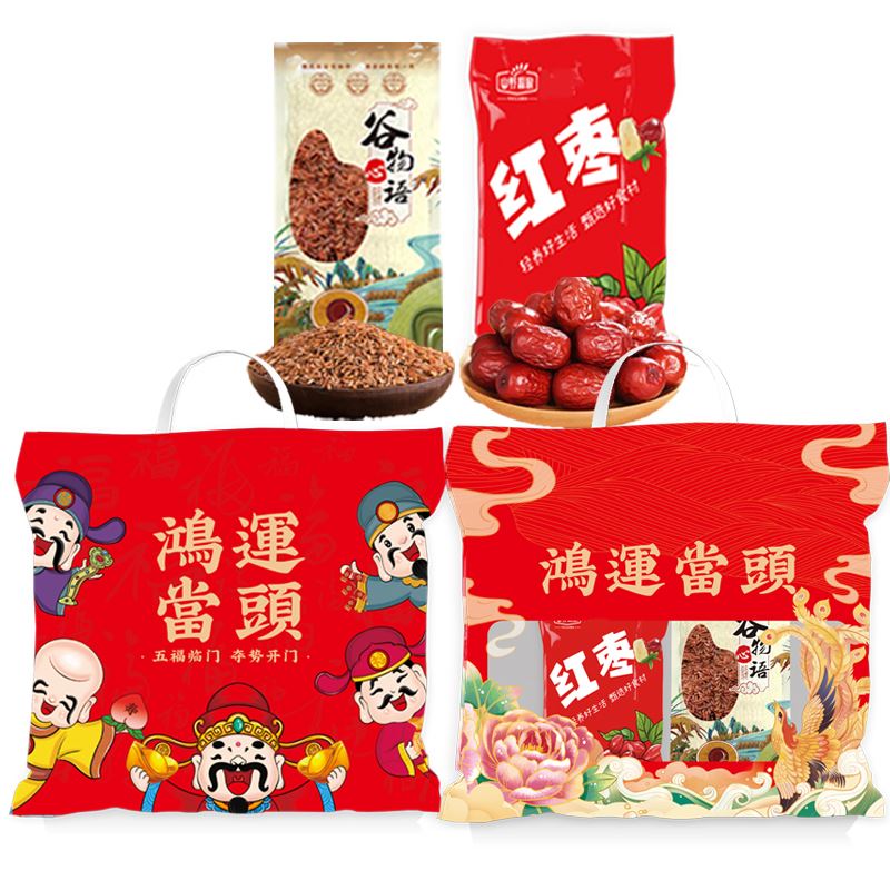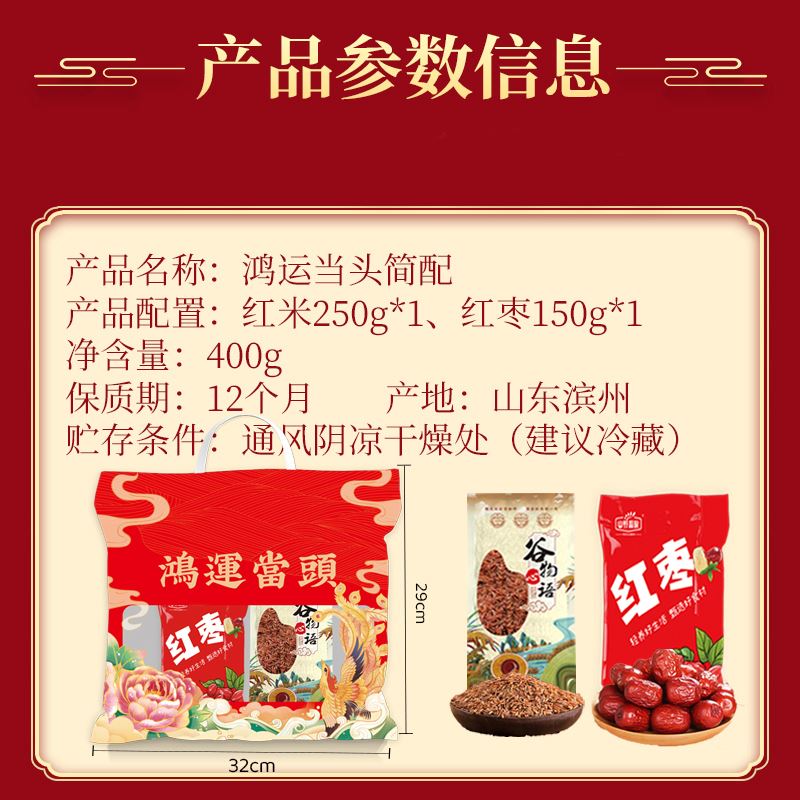 鸿运当头(简配款) 净含量:400g 产品规格配置:红枣150g、红米250g 袋尺寸:29cm*32cm 箱体积:0.077方 箱尺寸:60*43.5*30 箱重量:18.75kg