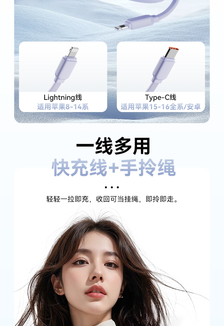 Type-c线输出: 5V-3A 9V-2.22A 10V-2.25A 12V-1.67A(22.5W) lightning线输出:5V-2A