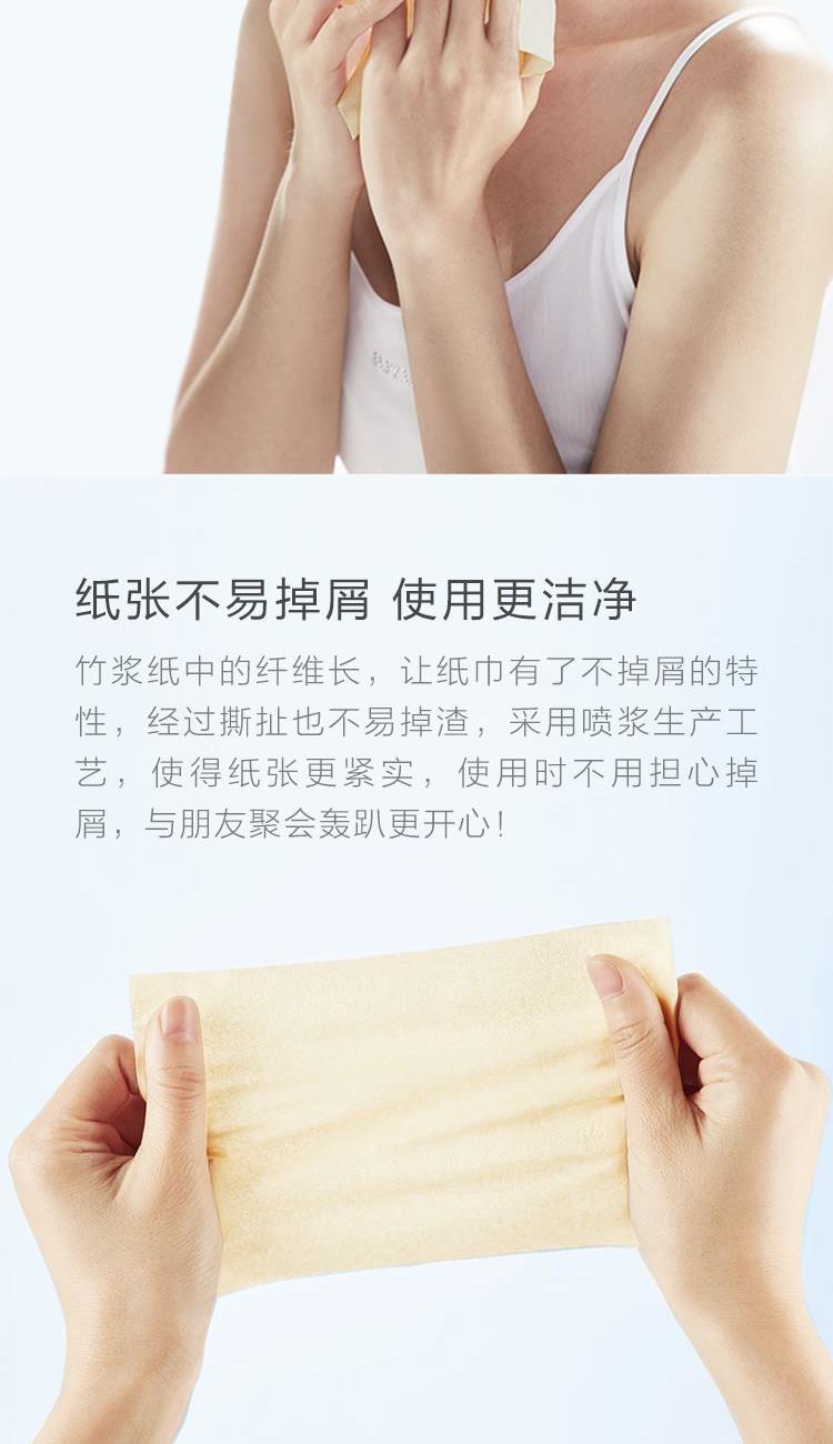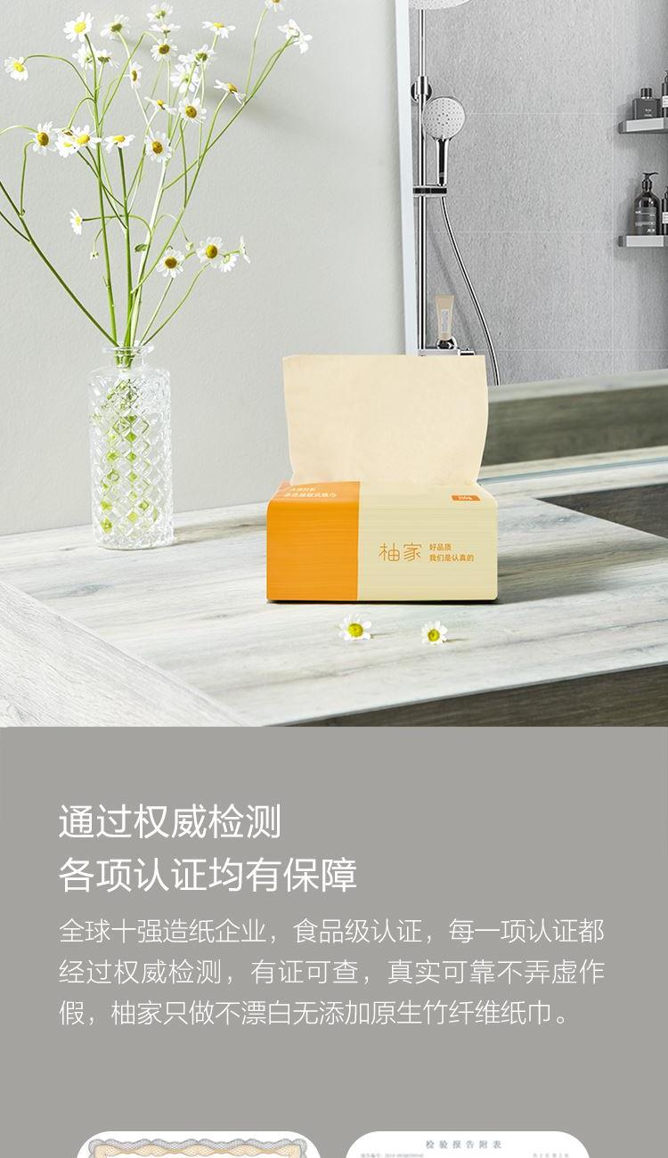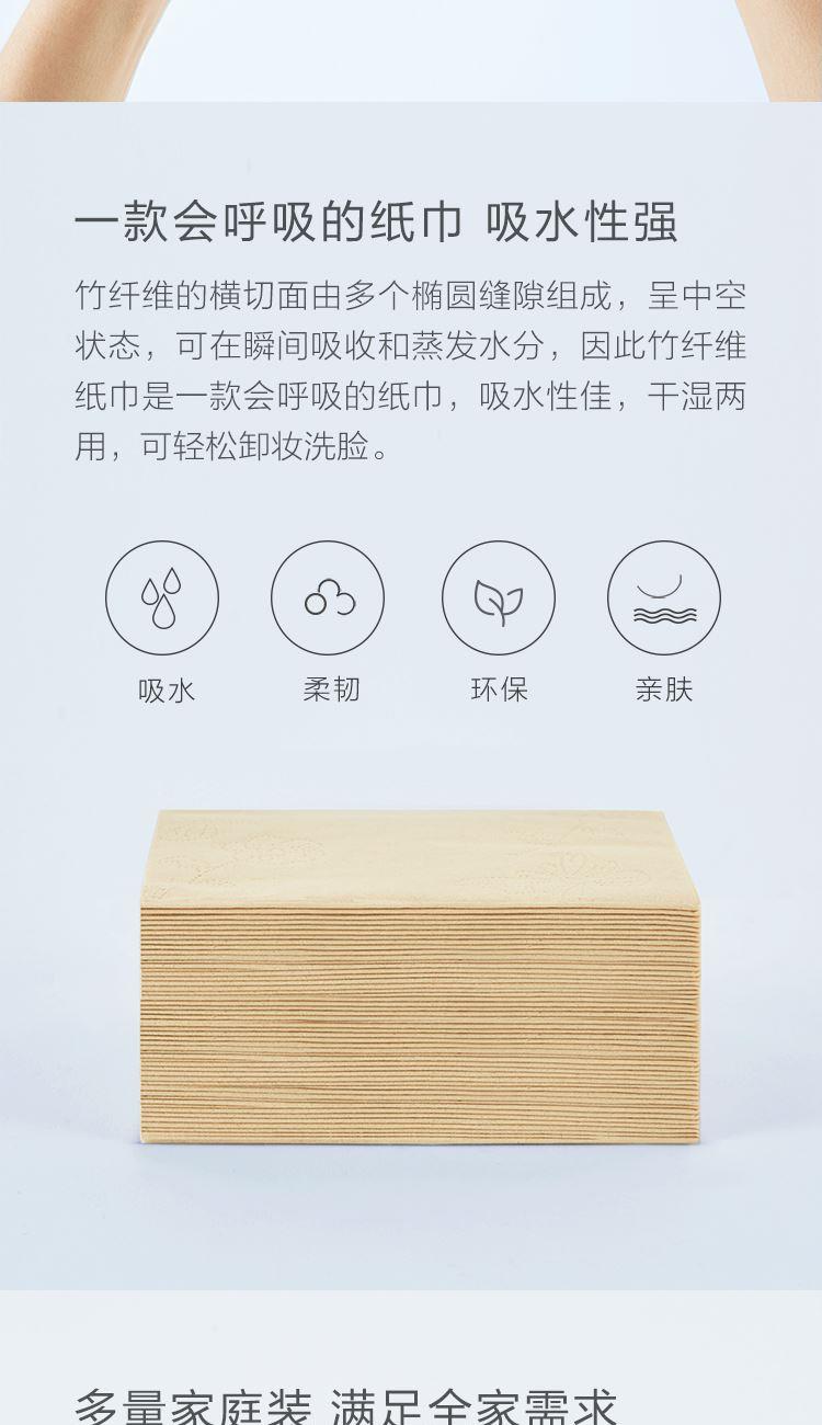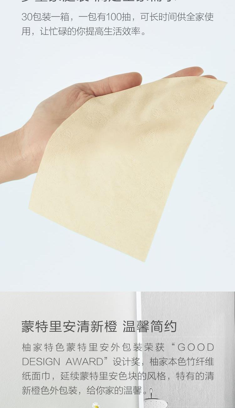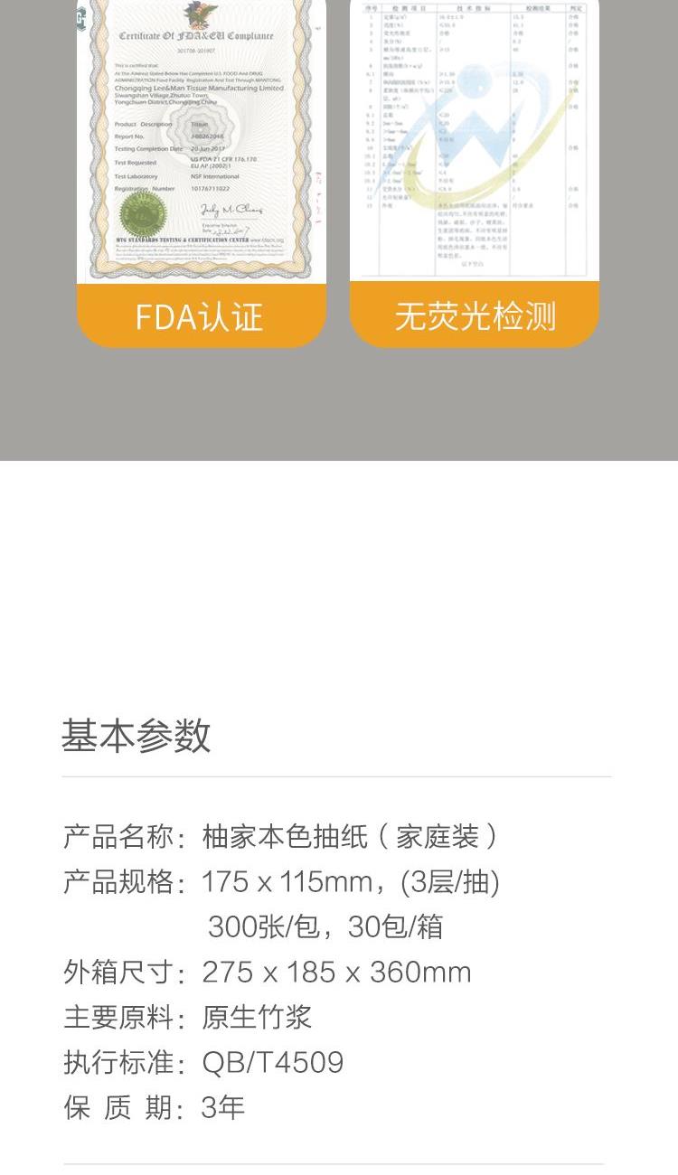 产品货号:174094 纸面规格:175*115mm(3层/抽) 单包规格:115*85*55mm(100抽/包) 外箱尺寸:275*185*360mm 主要原料:原生竹浆 保 质 期:3年