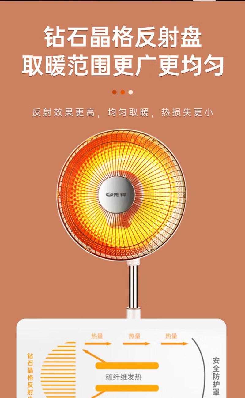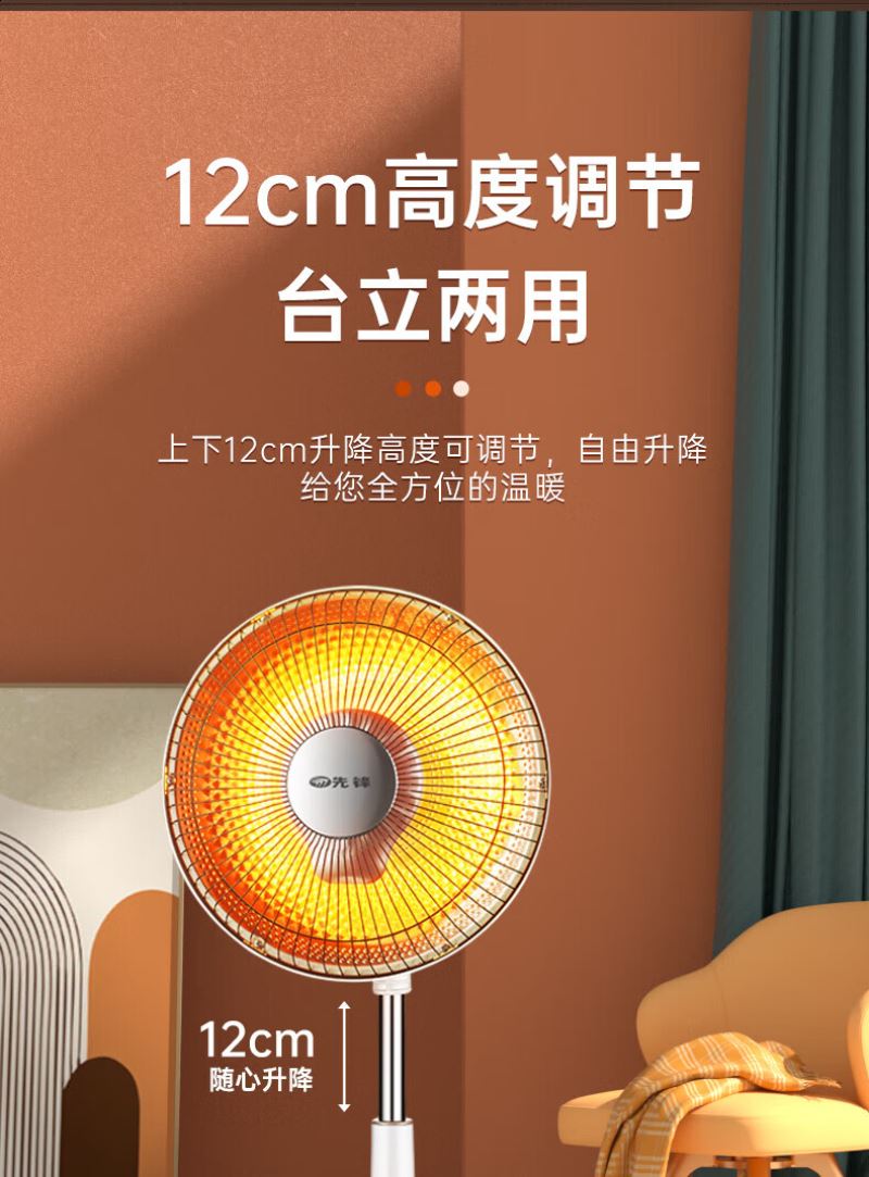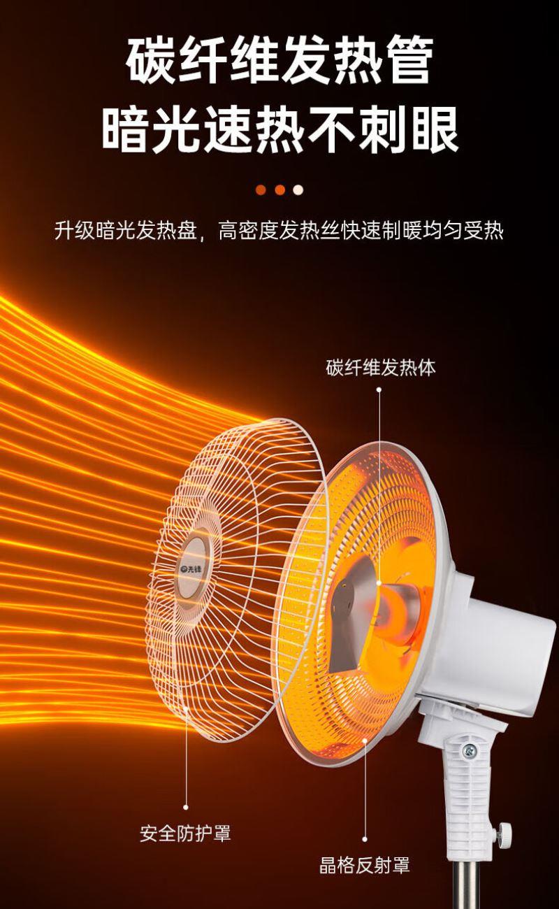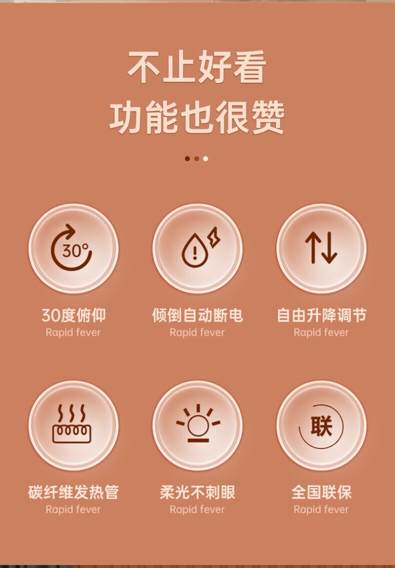 产品特点:采用碳纤维发热管,升温迅速,热量分布均匀。配备智能温控系统,可自动调节温度。高度可自由调节,适应不同使用场景,底部有万向轮,移动方便。此外,还采用了安全防倾倒设计,运行噪音低,且带有定时开关功能,使用安全又贴心。