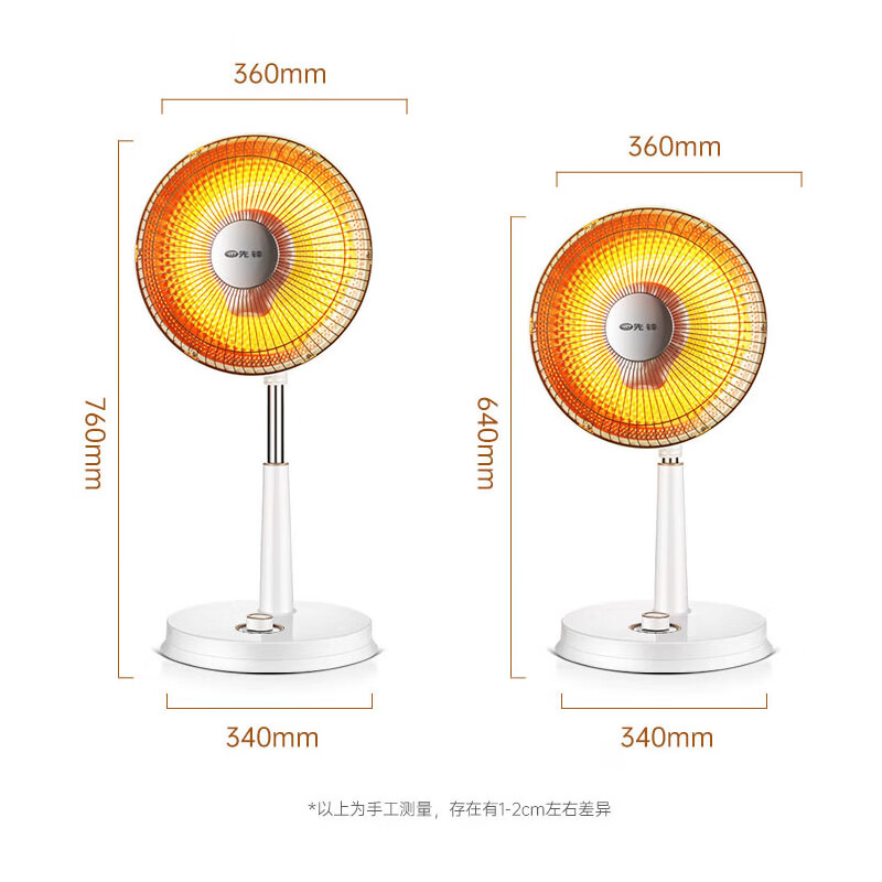 基本参数:产地为中国浙江宁波,发热管材质为碳纤维,产品尺寸 340mm×360mm×760mm,重量约 2kg,颜色多为白色,温控方式为机械温控,摆放方式为立式。