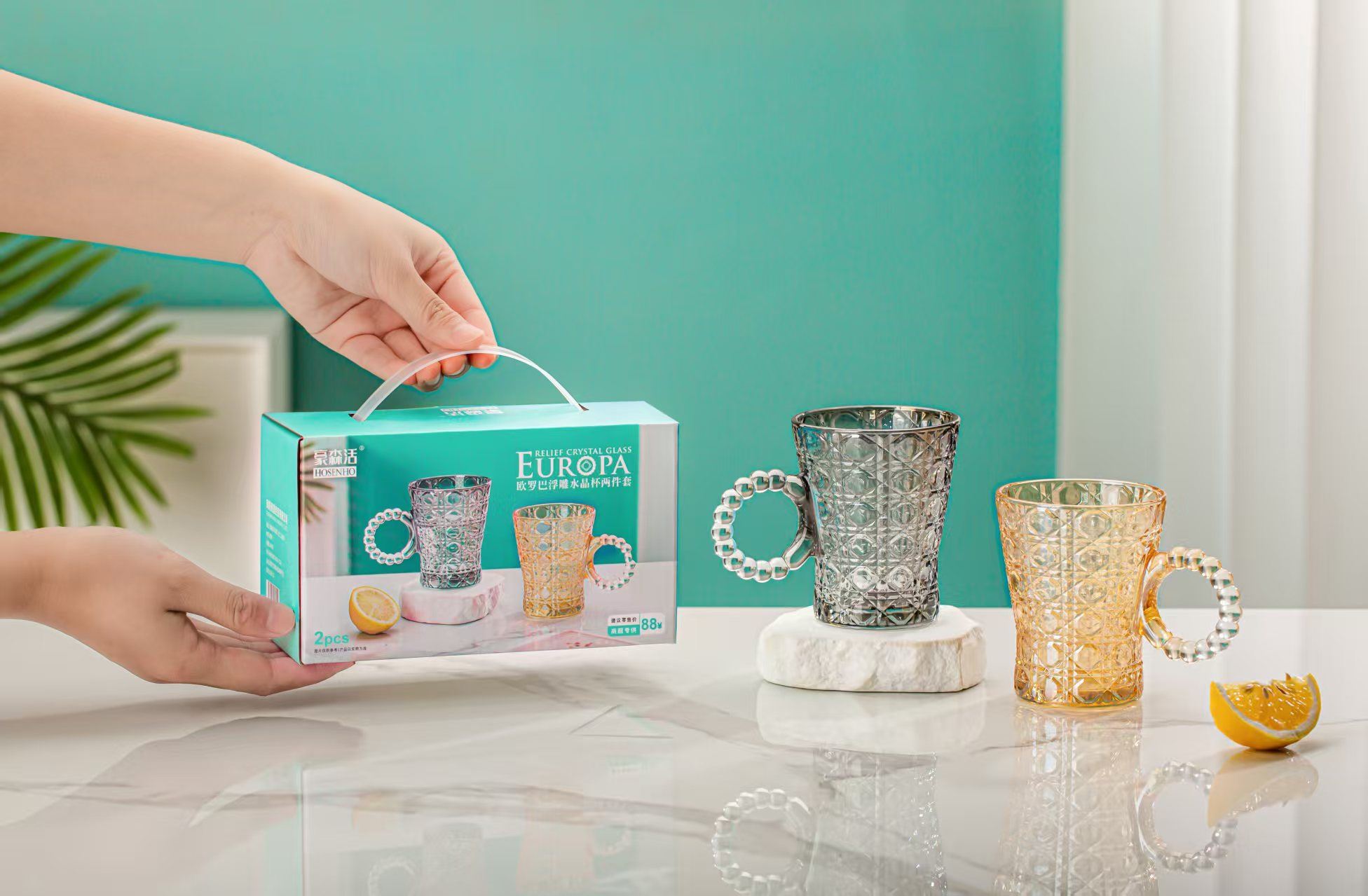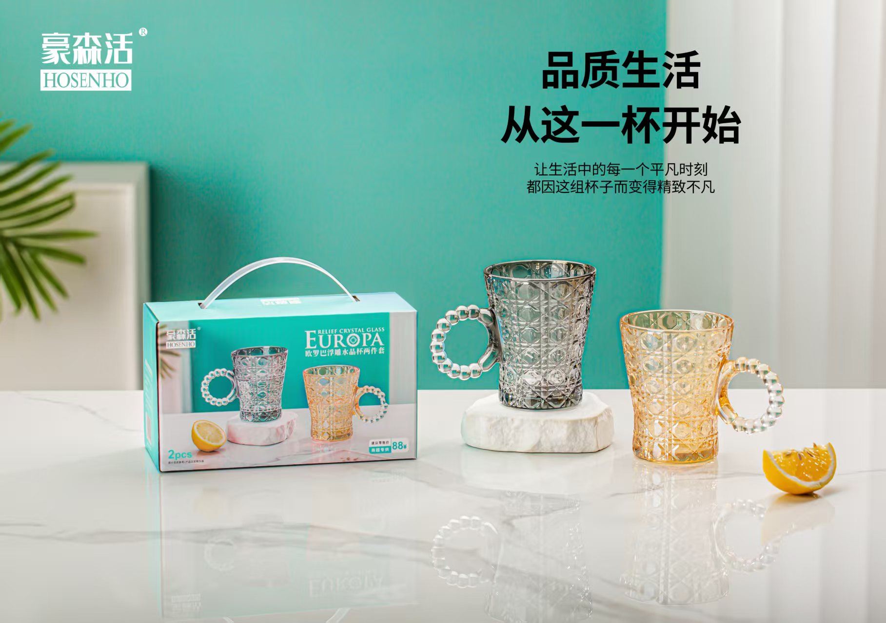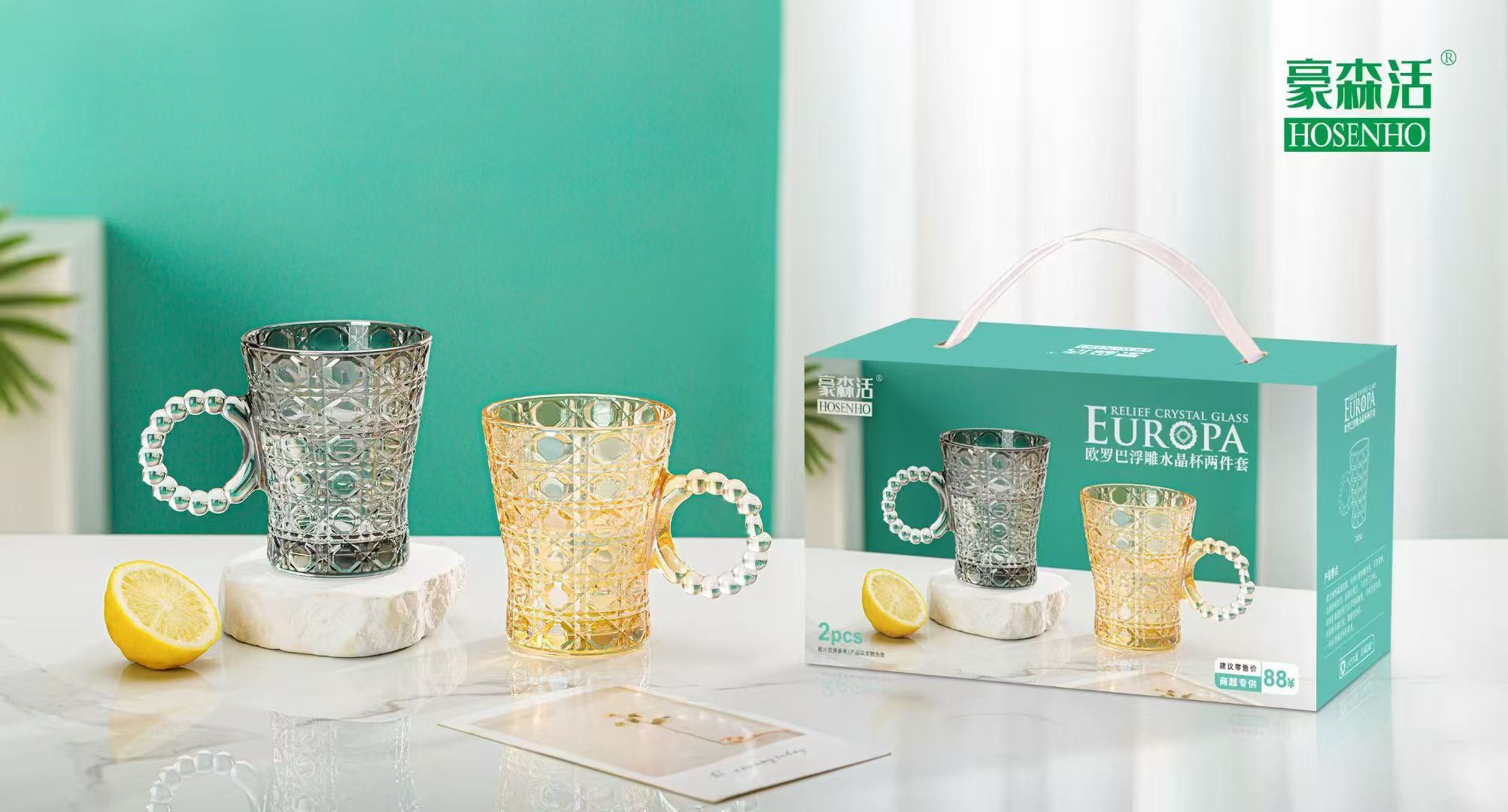 货号:OLB-L2 规格:1*36套 容量:杯:240ml*2 彩盒尺寸:17.2*8.2*10.5cm 外箱尺寸:50.4*27.6*41.6cm 条 码:6976254570559 产品卖点 欧式棱格高透质感,杯身外壁浮雕效果,尽享高贵加厚环保材质,防潮,不变色无异味。细致打磨圆润杯口如珍珠般触感,尽享舒适体验创意珍珠链手柄,拿握更舒适。一杯多用满足各种需求。实用方便,是促销、商务、会议和福利礼品之优选。