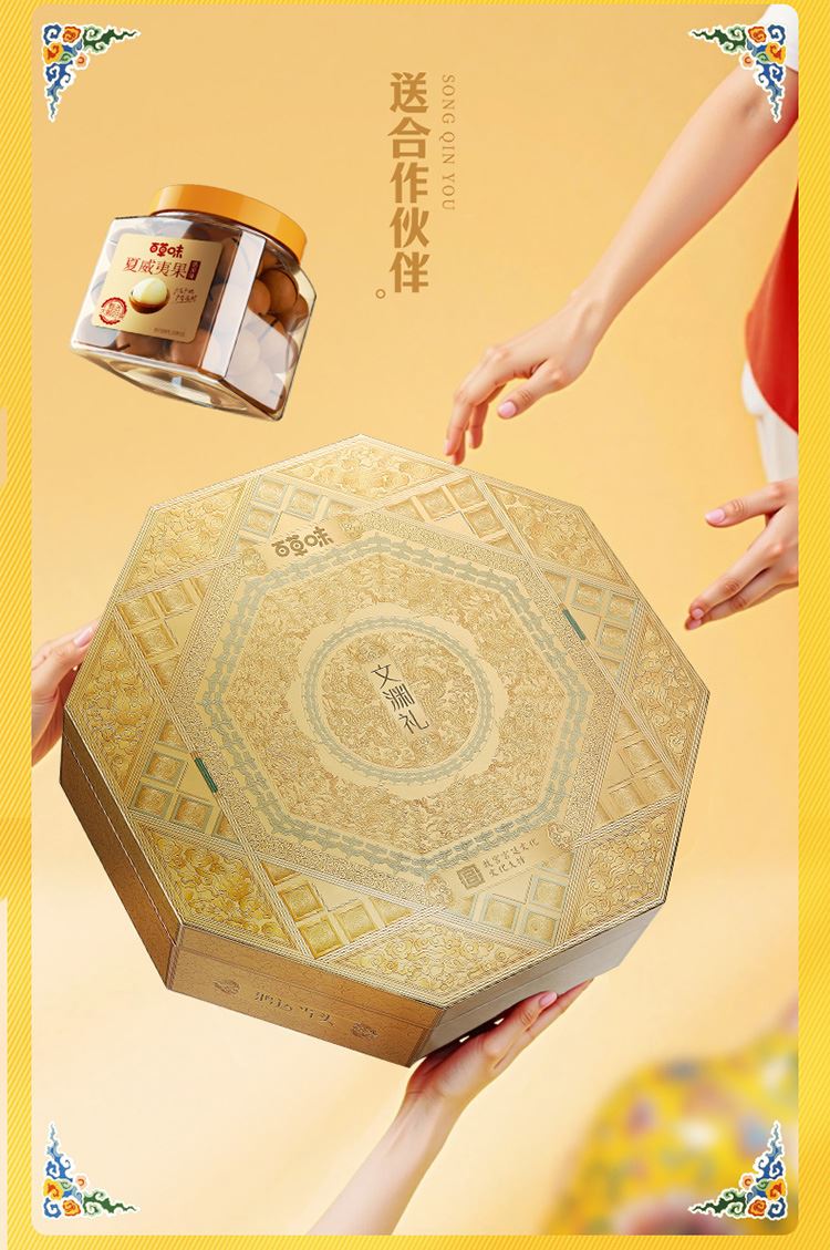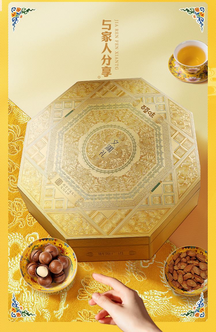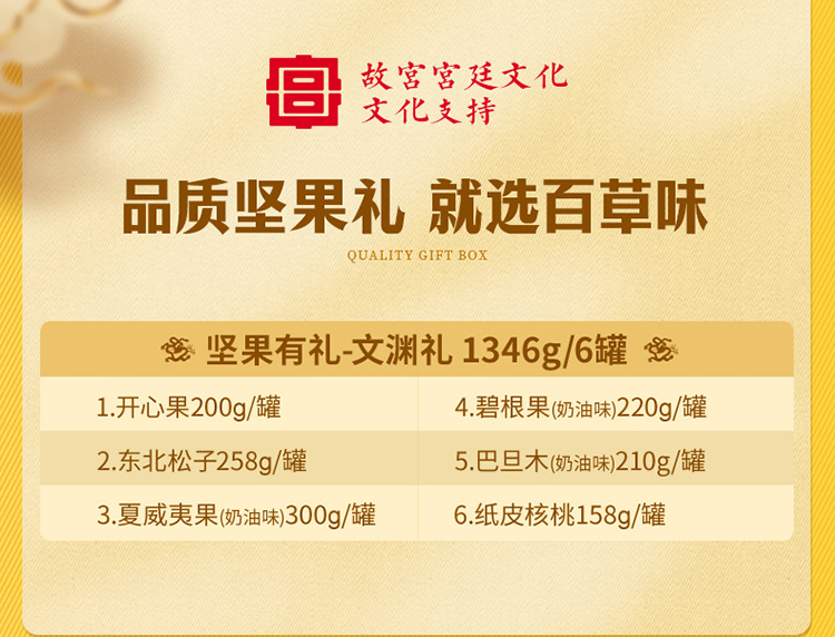礼盒尺寸mm(长*宽*高):433*117*433 开心果 200g(方罐-金卡) 东北松子 258g(方罐-金卡) 夏威夷果(奶油味)300g(方罐-金卡) 碧根果(奶油味) 220g(方罐-金卡) 巴旦木(奶油味)210g(方罐-金卡) 纸皮核桃 158g(方罐-金卡)