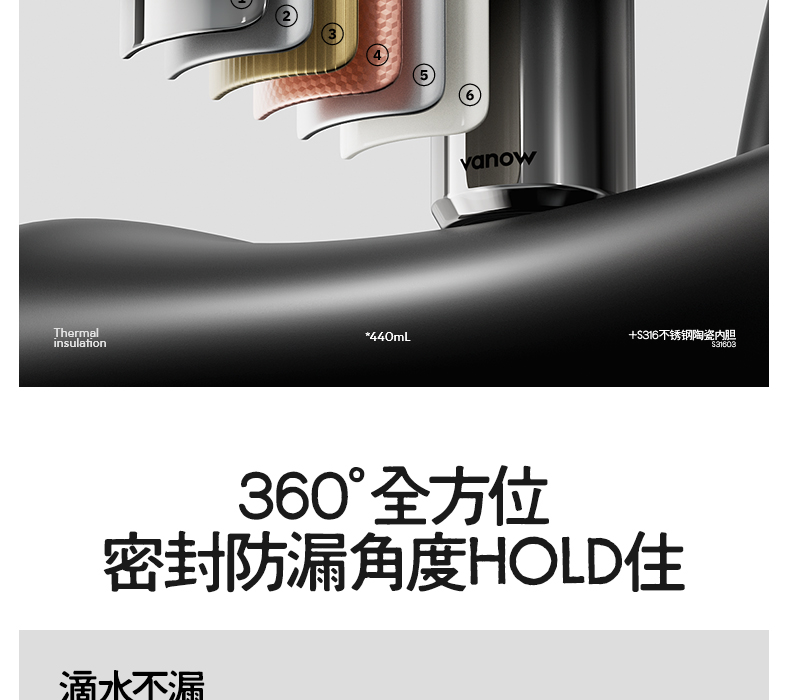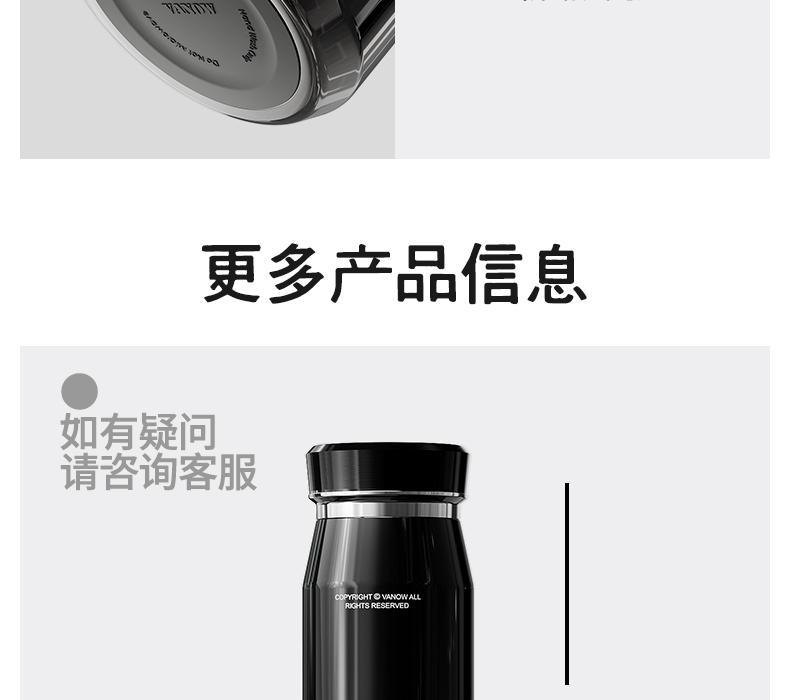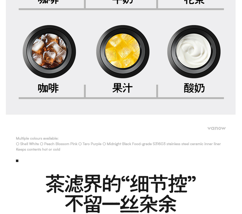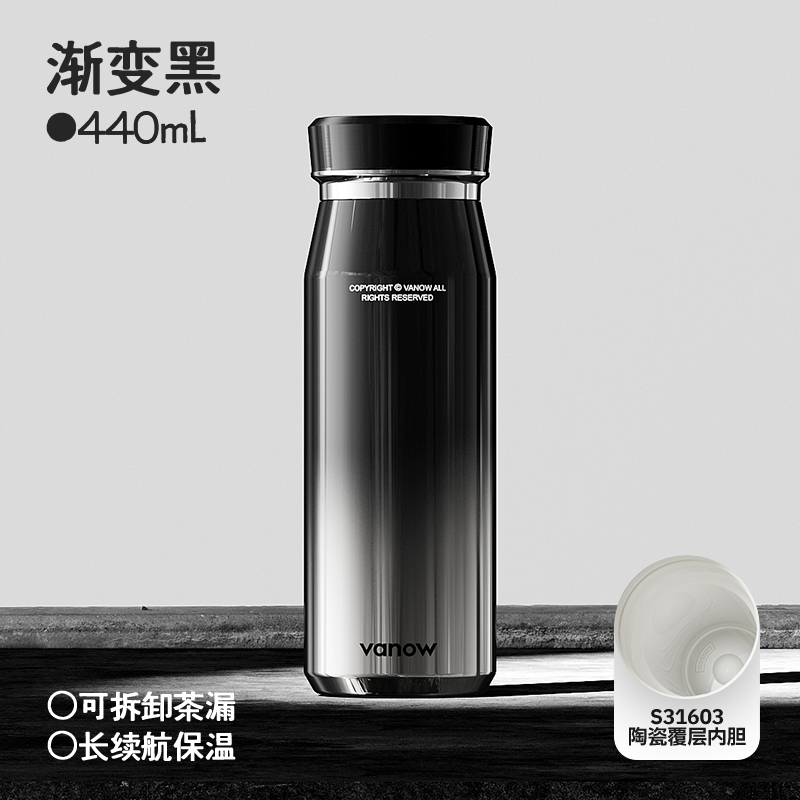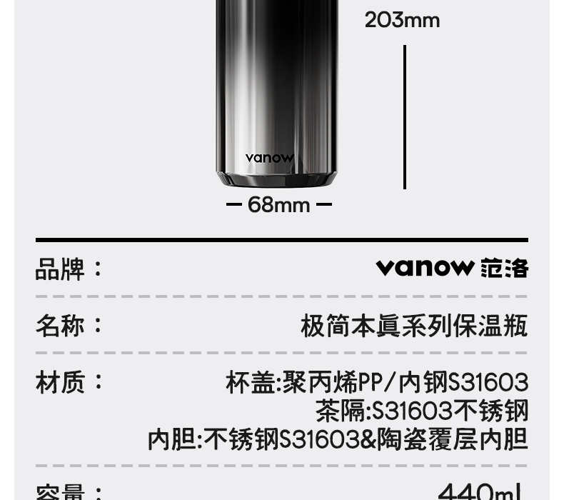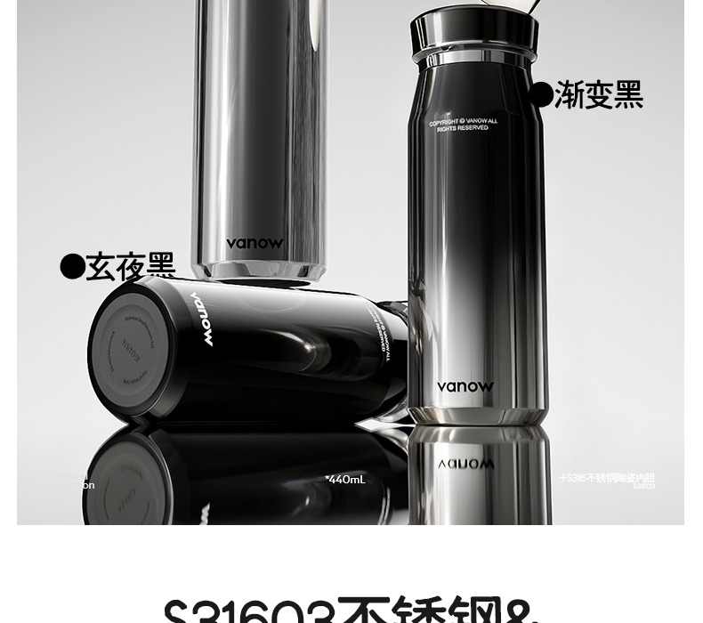 型号:VO-JZ44JBW-C 颜色:渐变黑, 纯净白, 金属银, 玄夜黑 容量:440ml 尺寸:203*68mm 材质:316不锈钢陶瓷覆层内胆覆层,聚丙烯pp