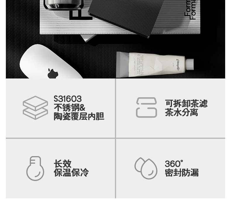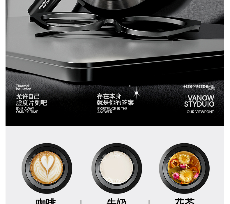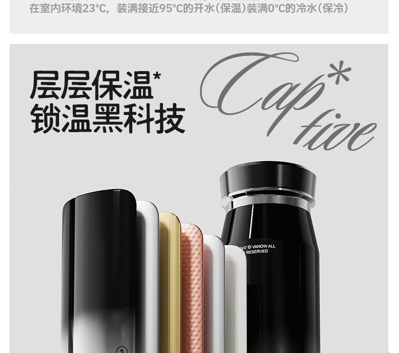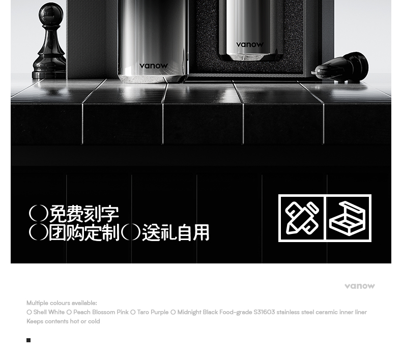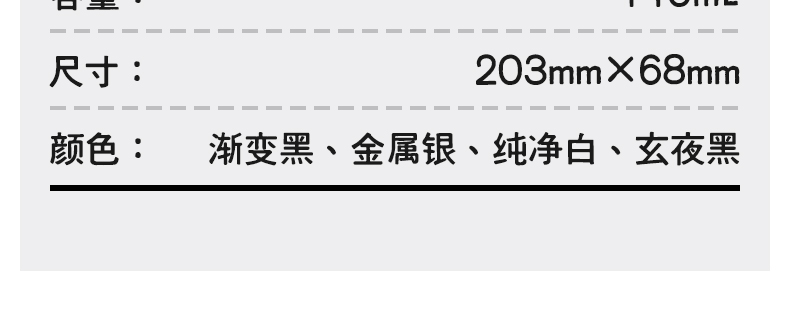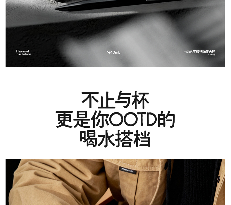 型号:VO-JZ44JBW-C 颜色:渐变黑, 纯净白, 金属银, 玄夜黑 容量:440ml 尺寸:203*68mm 材质:316不锈钢陶瓷覆层内胆覆层,聚丙烯pp