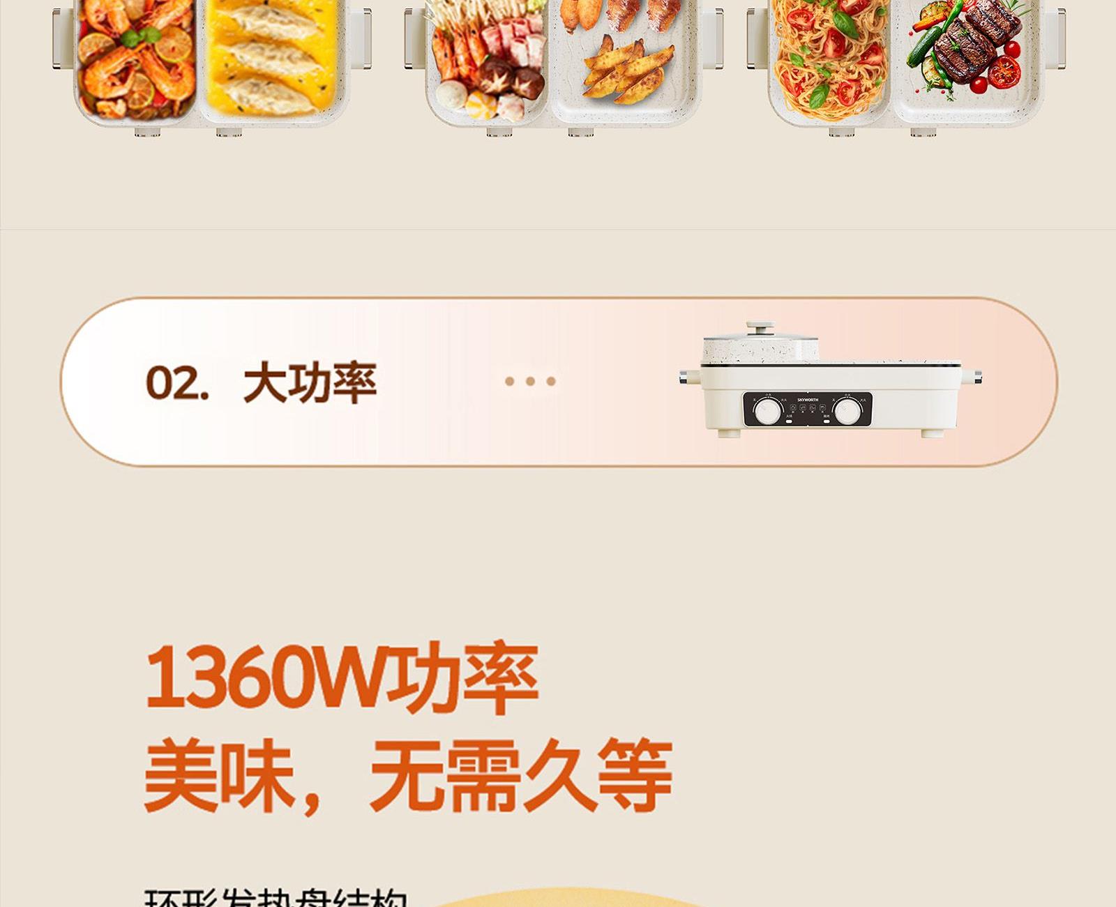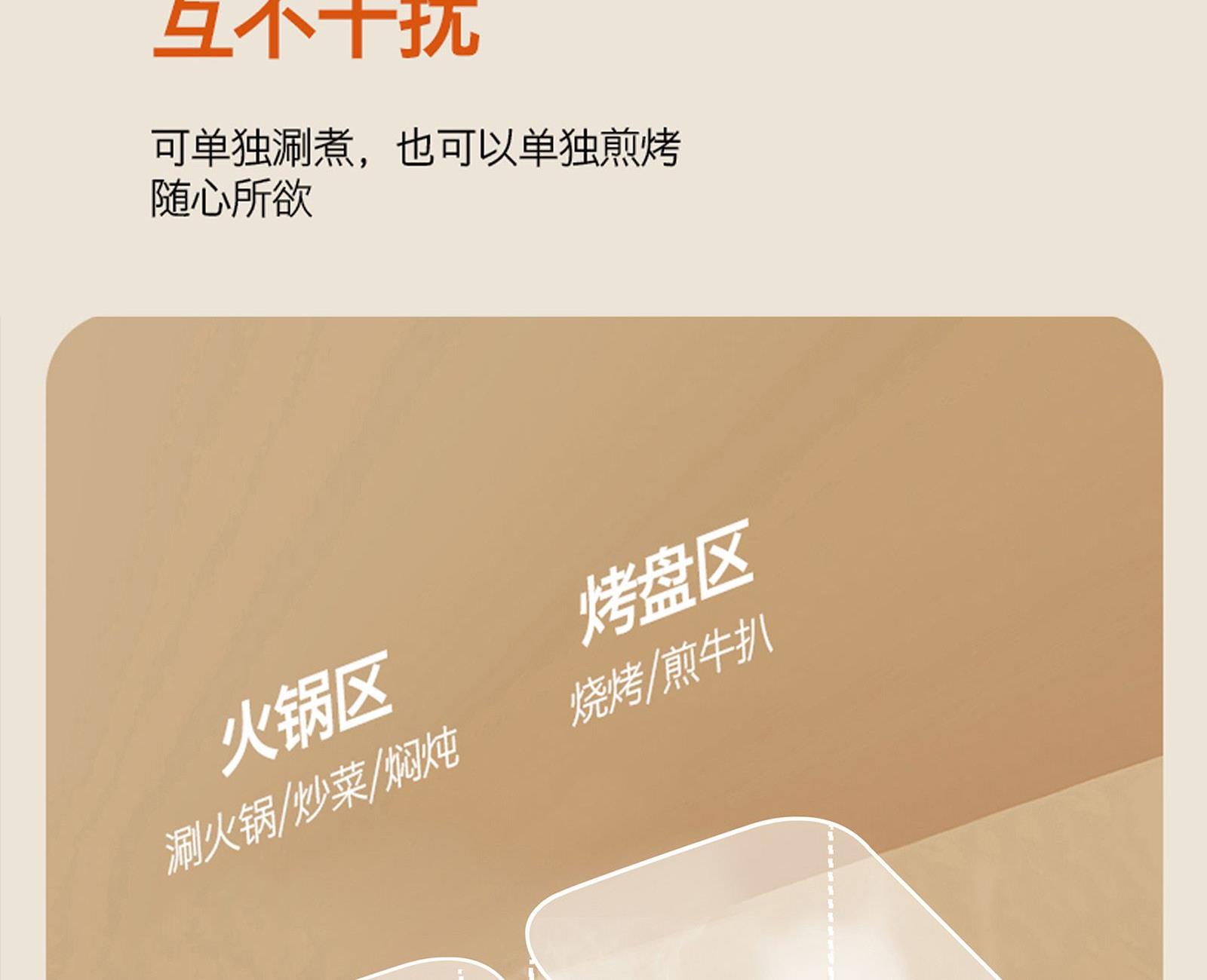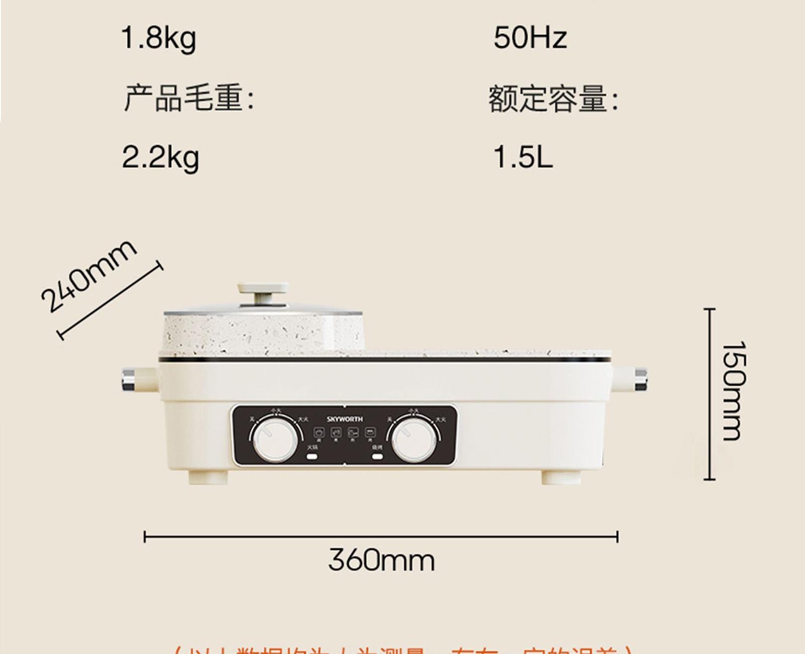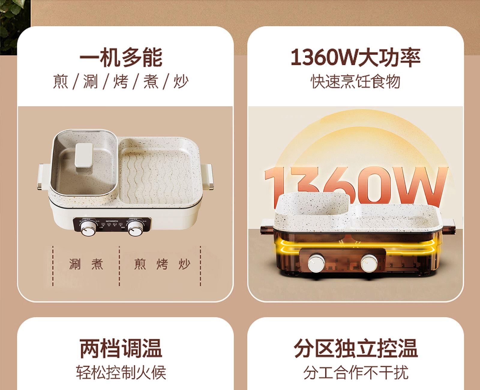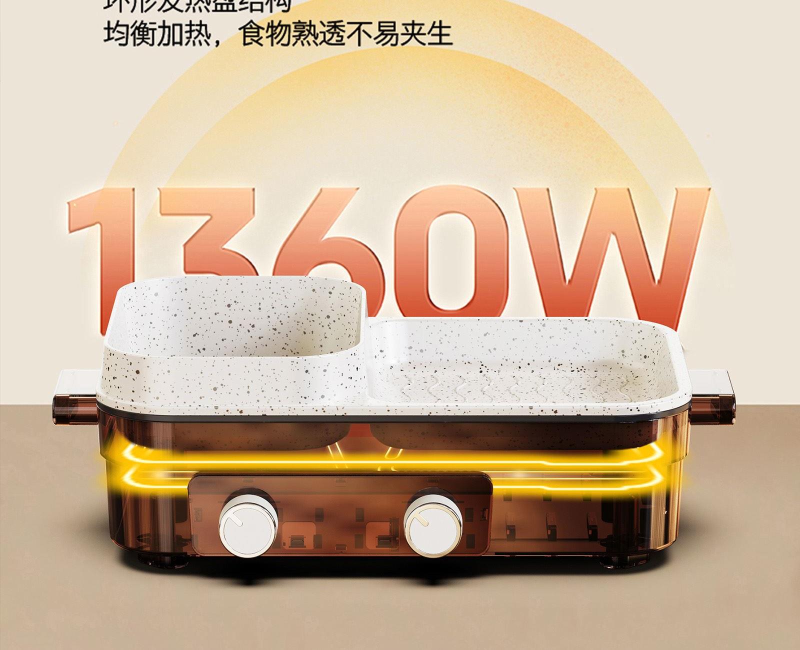 额定电压:220V~ 额定频率:50Hz 额定功率:1360W 容 量:1.5L • 涮烤一体双区,搭配两大功能,双倍快乐; • 双旋钮开关,单独控制,随意大小火; • 1360W大功率,火力全开,即享美味; • 大容量大满足,轻松应对各种食材; • 食品级麦饭石不沾涂层,清洗更加便捷。