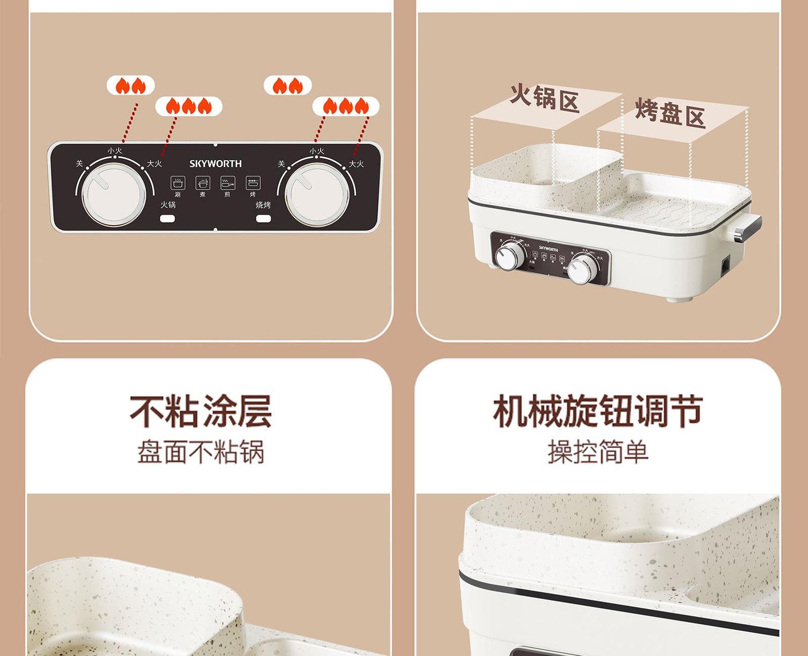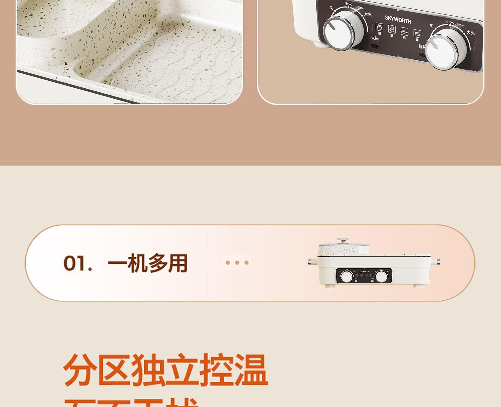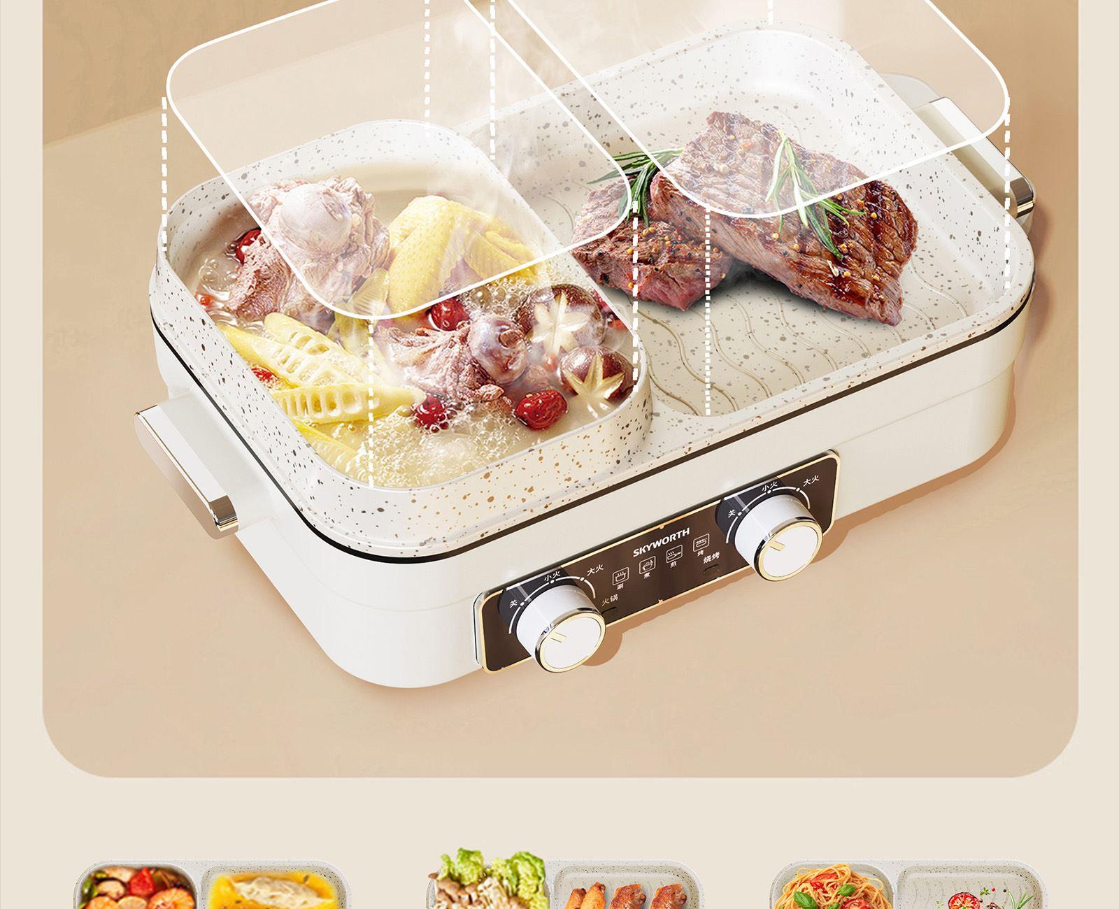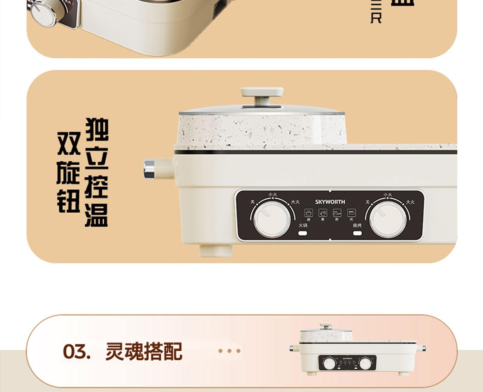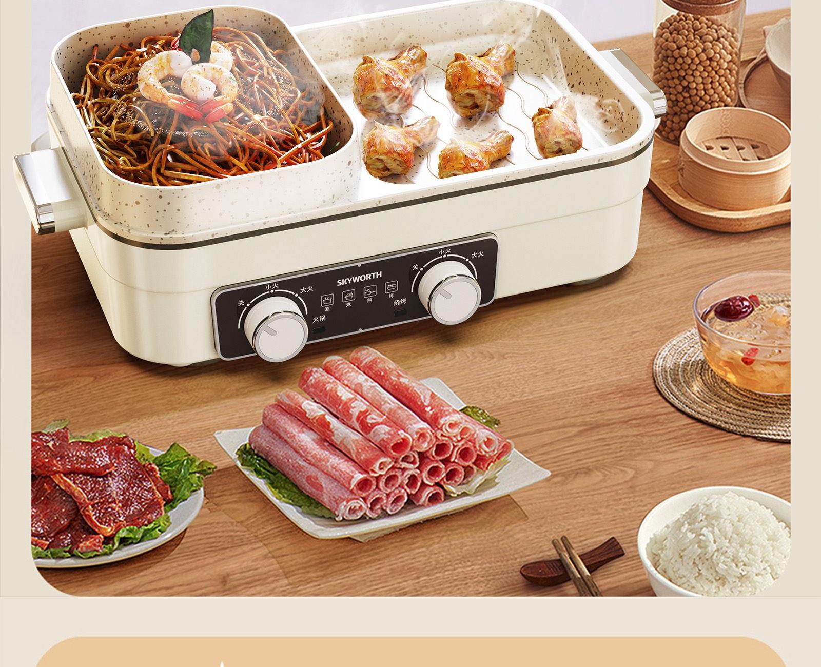 额定电压:220V~ 额定频率:50Hz 额定功率:1360W 容 量:1.5L • 涮烤一体双区,搭配两大功能,双倍快乐; • 双旋钮开关,单独控制,随意大小火; • 1360W大功率,火力全开,即享美味; • 大容量大满足,轻松应对各种食材; • 食品级麦饭石不沾涂层,清洗更加便捷。