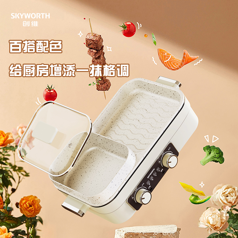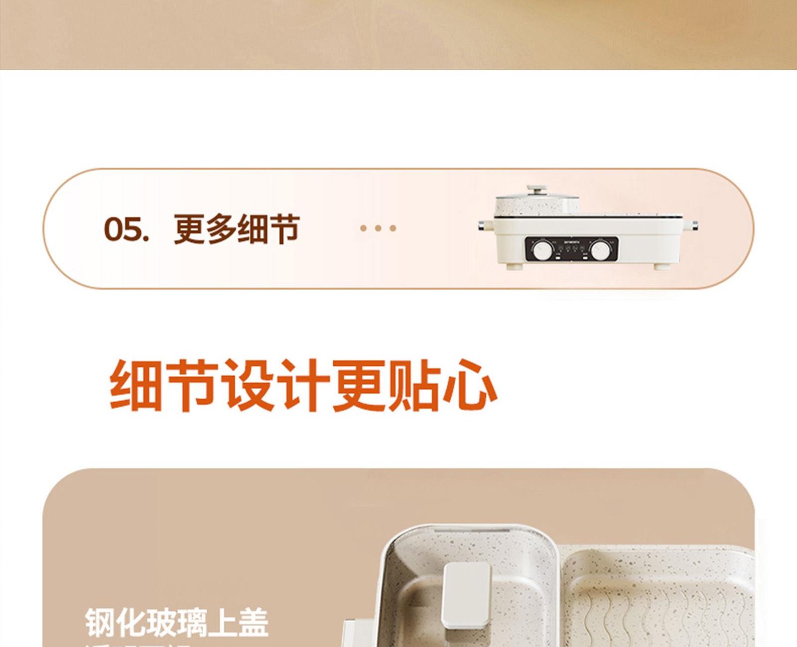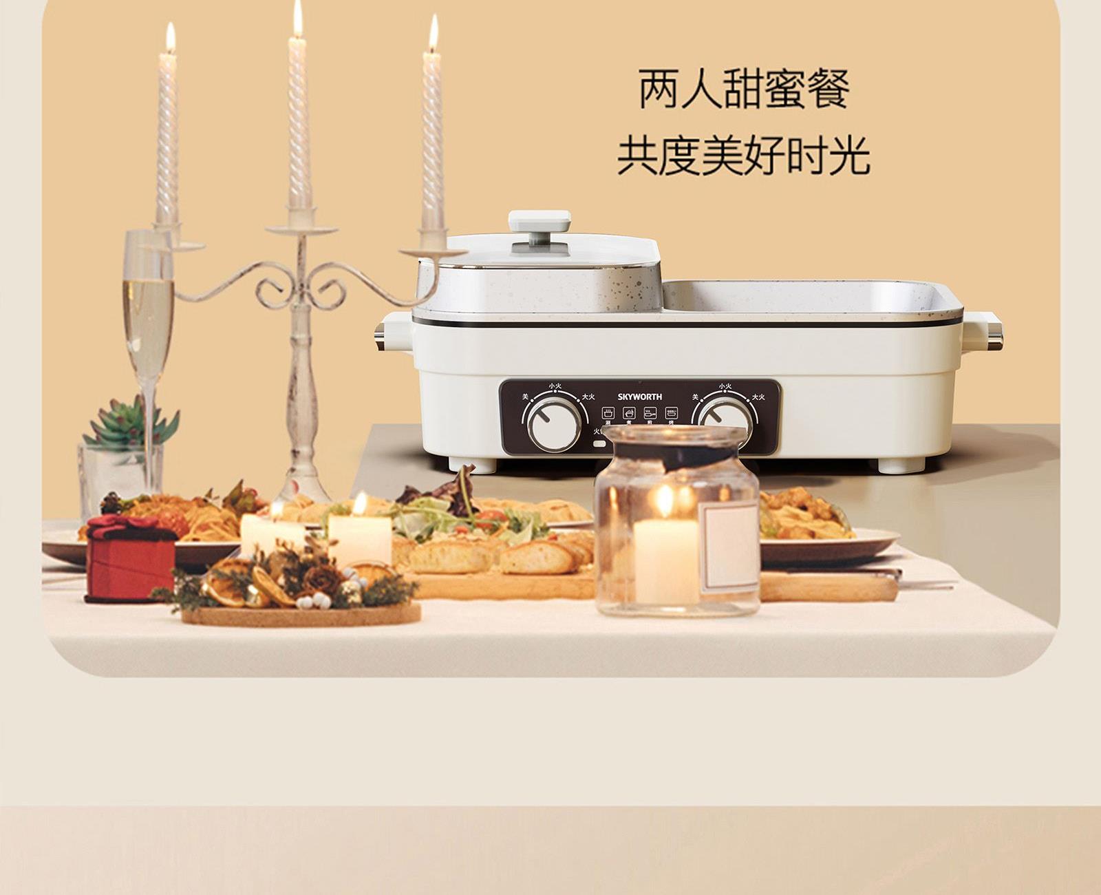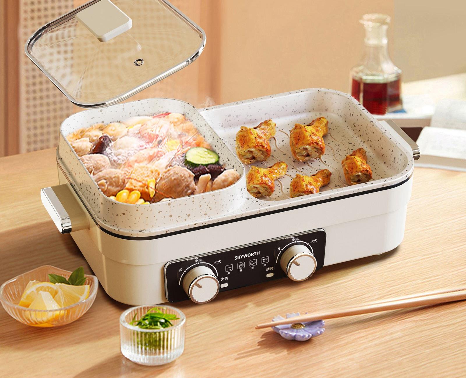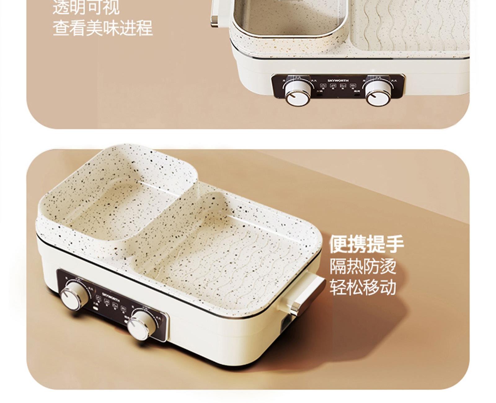 额定电压:220V~ 额定频率:50Hz 额定功率:1360W 容 量:1.5L • 涮烤一体双区,搭配两大功能,双倍快乐; • 双旋钮开关,单独控制,随意大小火; • 1360W大功率,火力全开,即享美味; • 大容量大满足,轻松应对各种食材; • 食品级麦饭石不沾涂层,清洗更加便捷。