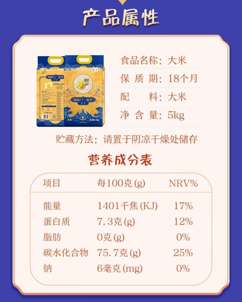 净含量:5kg 条形码:6944910368505 开票税率:9% 产品卖点: 央企品质,一级米质:中粮全产业链把控,执行 GB/T 1354 标准,一级米质安全放心。 香糯弹韧,米香浓郁:颗粒饱满晶莹,熟饭软糯不粘,自带自然稻香,煮饭煮粥皆适配。 5kg 实用装,便捷耐储:家庭适配规格,常温储存可达 12-18 个月,日常食用、节庆囤货皆适宜。