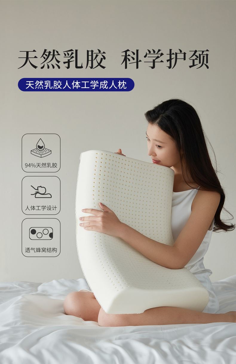 条码:6946592153349 规格:60*40*10/12cm 枕套:99.9%聚酯纤维 内枕套:99.9%聚酯纤维 内芯:94%天然乳胶,6%发泡助剂 箱子尺寸:63*42*86cm 基本特性:泰国进口乳胶原料,国内工艺制造,锁定94%天然乳胶,舒适清新。 1. 94%泰国天然乳胶枕,工学护颈,好眠不过敏。 2. 泰国乳胶+人体工学,柔软支撑,敏肌鼻炎党闭眼入。 3. 天然乳胶成人枕,透气护颈还防螨,一夜安睡到天亮。