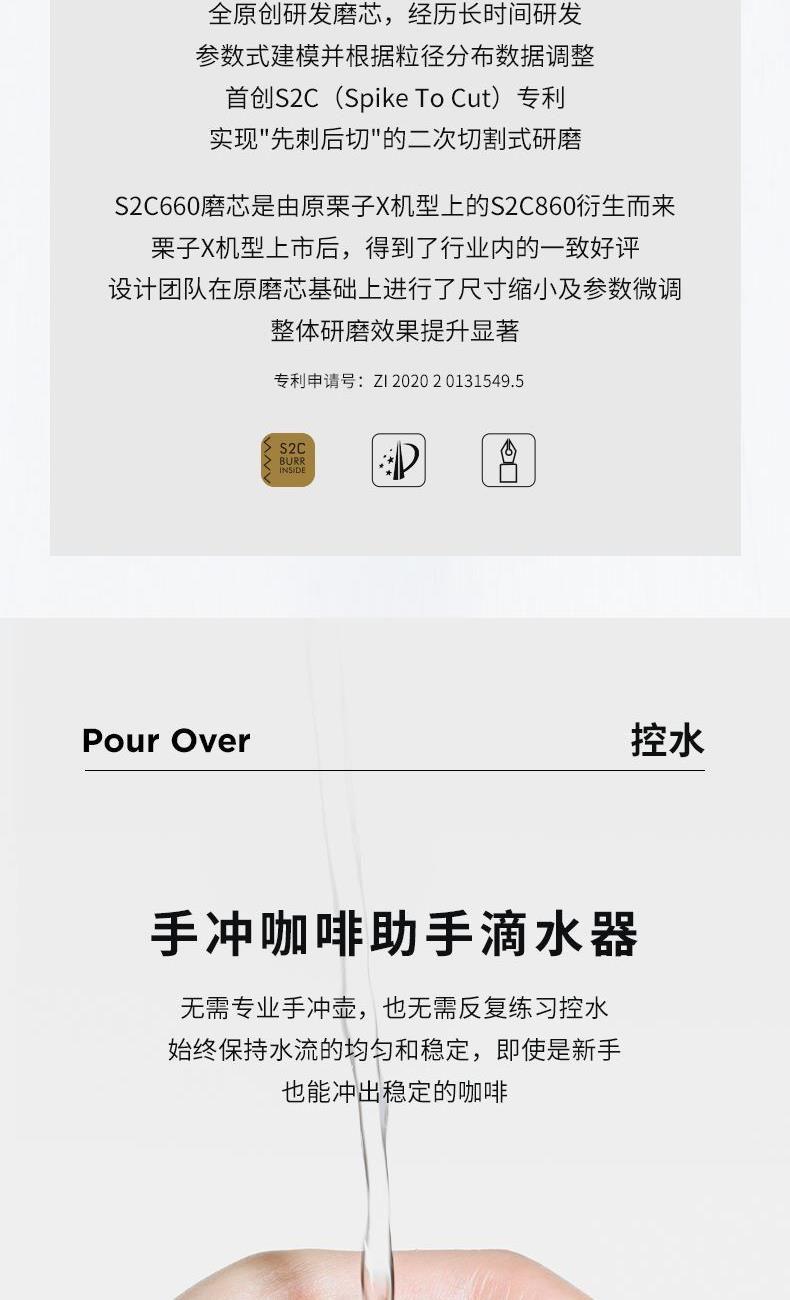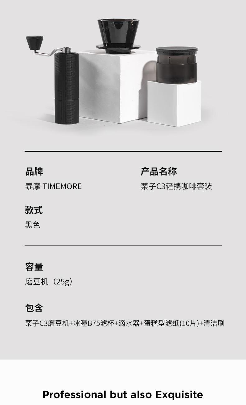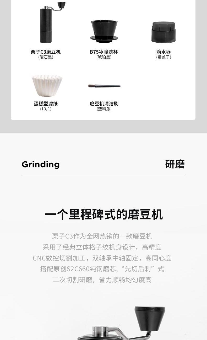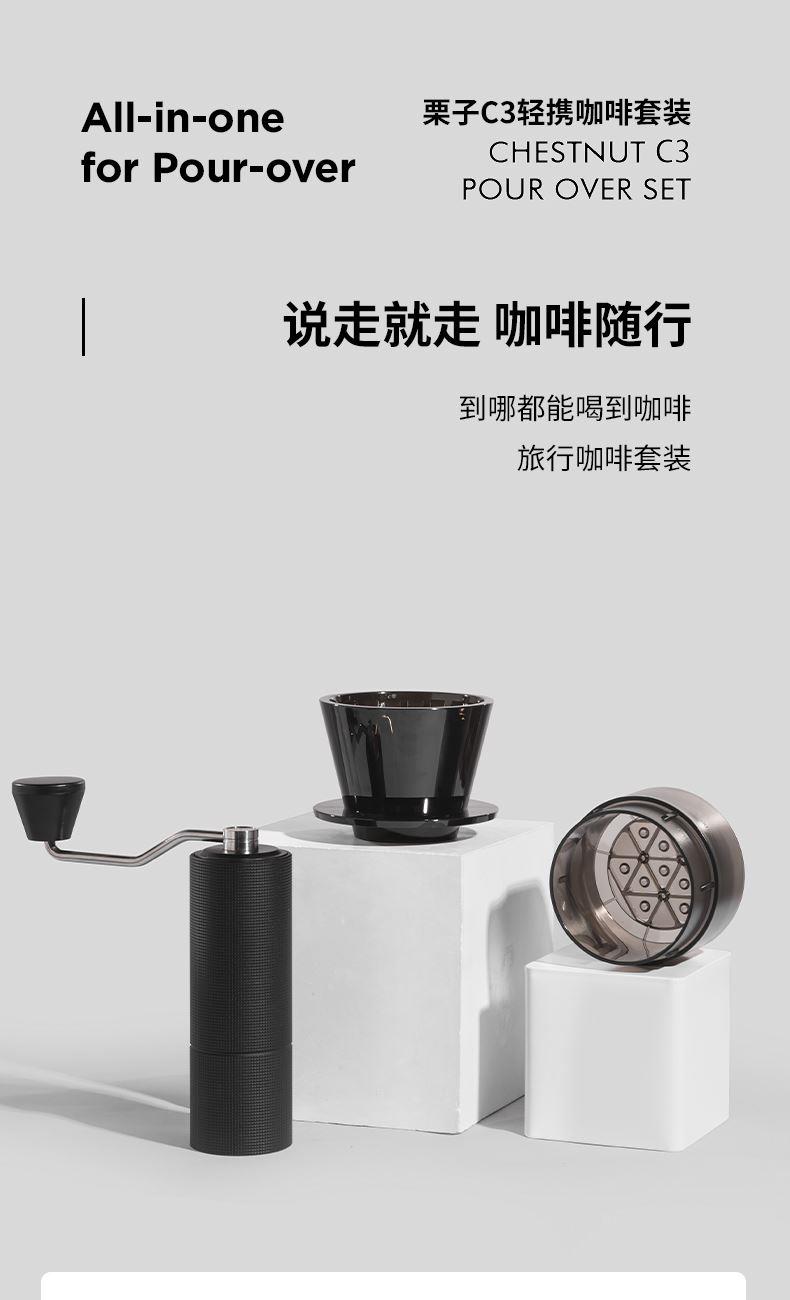 产品:栗子C3轻携咖啡套装 款式:黑色 容量:磨豆机(25g) 磨豆机尺寸 机身:147mm×52mm 手柄:159mm 磨豆机磨芯:原创S2C660磨芯 包含: 栗子C3磨豆机+冰瞳B75滤杯+滴水器+蛋糕型滤纸(10片)+清洁刷 说走就走 咖啡随行 到哪都能喝到咖啡旅行咖啡套装