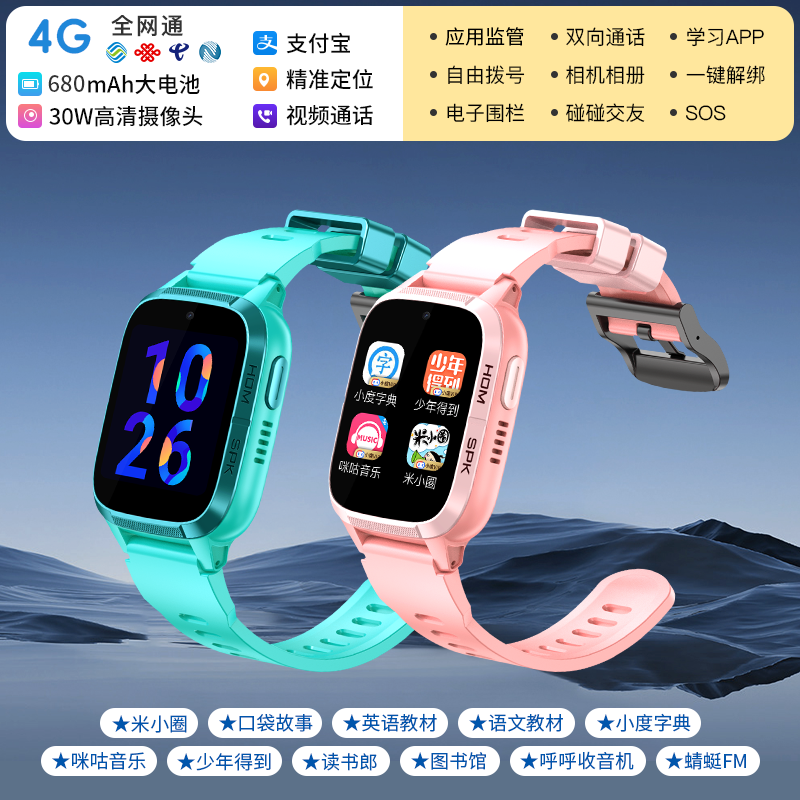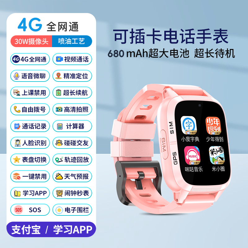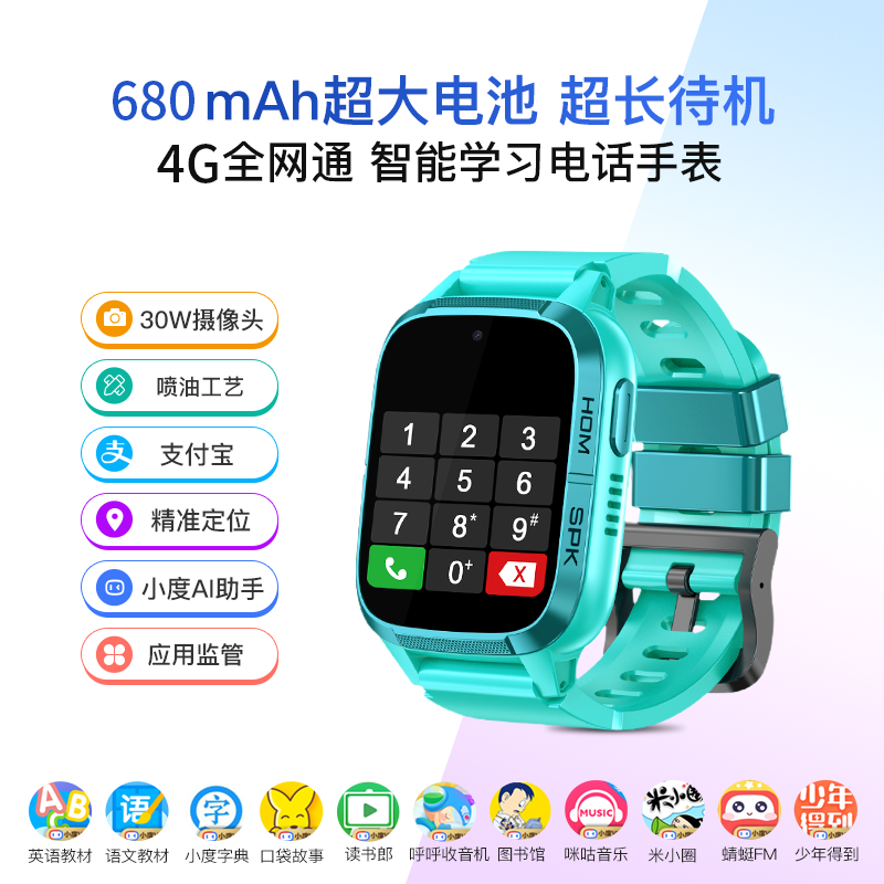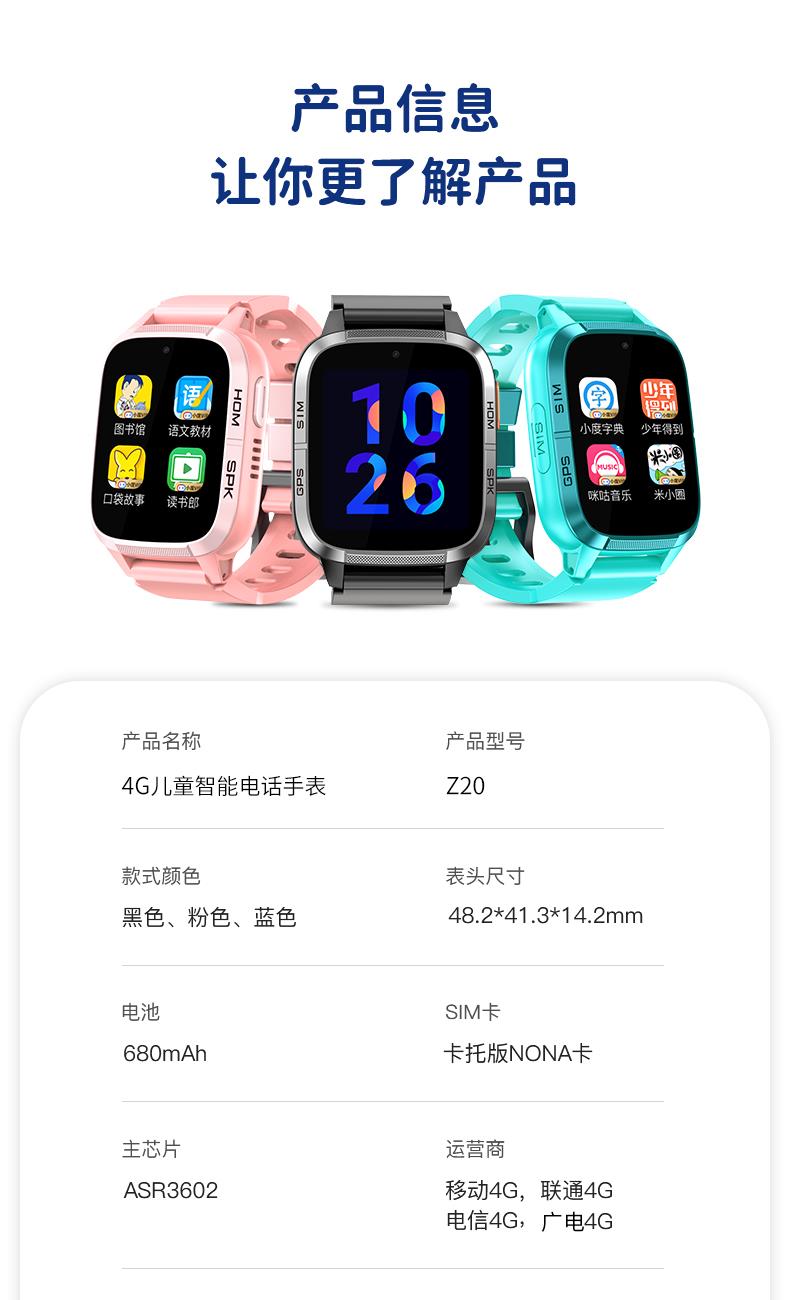 清单:Z20电话手表+充电线+配件+包装盒 表带材质:硅胶 屏幕尺寸:1.4英寸 屏幕分辨率:240*240像素 摄像头像素:30万 充电方式:磁吸式充电 内存容量(ROM):128MB 电池:680mAh 定位方式:GPRS+LBS+WIFI定位 APP:小度APP 4G全网通:支持移动、联通、电信,广电卡 支付宝付款、多重定位、碰碰交友、SOS报警、小度助手、读书郎、米小圈、自由拨号、电子围栏、人脸识别、上课禁用、小度字典、呼呼收音机、蜻蜓FM、视频通话、应用监管、天气预报、通话记录、语文教材、图书馆、少年得到、语音微聊、闹钟、历史轨迹、计算器