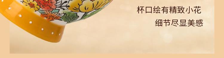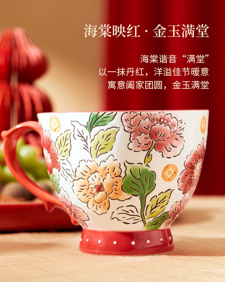 3.喜庆的红杯,以海棠谐音“满堂”,寓意阖家团圆,金玉满堂;尊贵大气的黄杯,以芙蓉谐音“富荣”,祝愿财富与荣耀兼得。