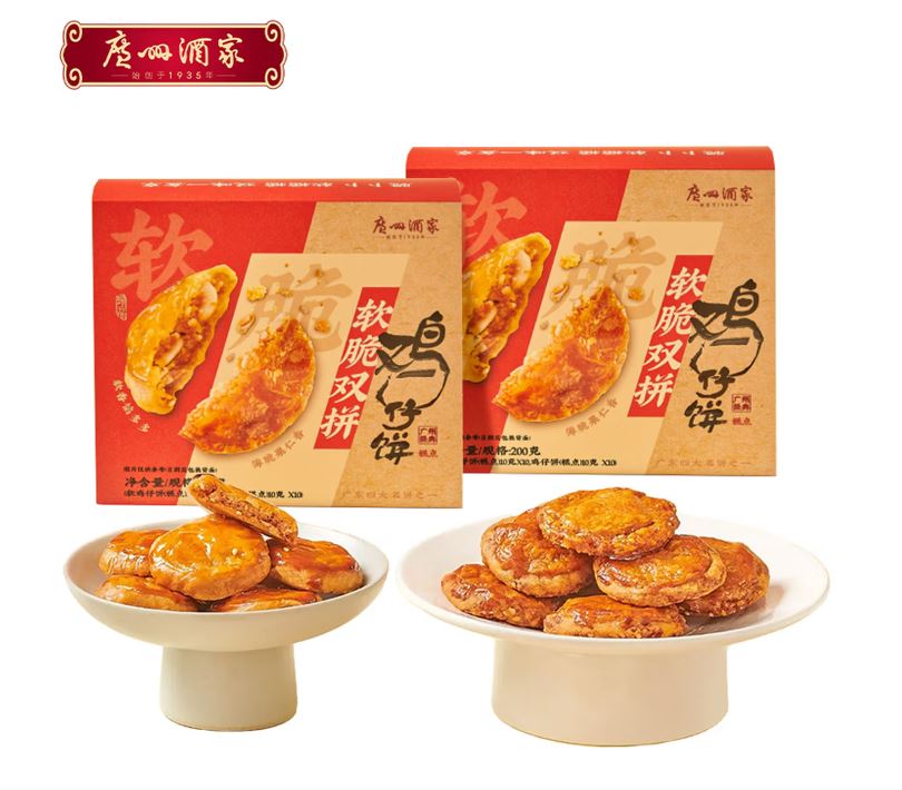 软脆双拼鸡仔饼(糕点) 内容物/主要原料 软鸡仔饼10g*10 脆鸡仔饼10g*10 产品规格:1*16*200g(16盒/箱) 产品卖点 一盒双味,软硬皆可 软鸡仔饼,馅料超足,占比>55%,满口嘴香; 脆鸡仔饼,经典焕新,薄脆升级,咬下去咸香 “咔滋” 响; 广东四大名饼之一,1次解锁2种广府经典风味,双拼更过瘾! 日常追剧嚼着解闷、午后茶歇配茶刚好、朋友小聚分享够味,多场景都适配的广府美味!