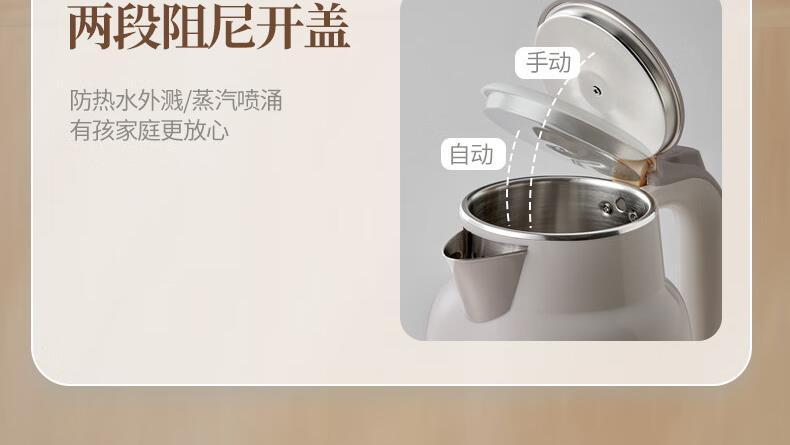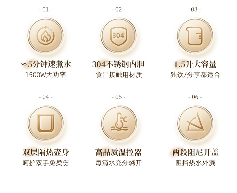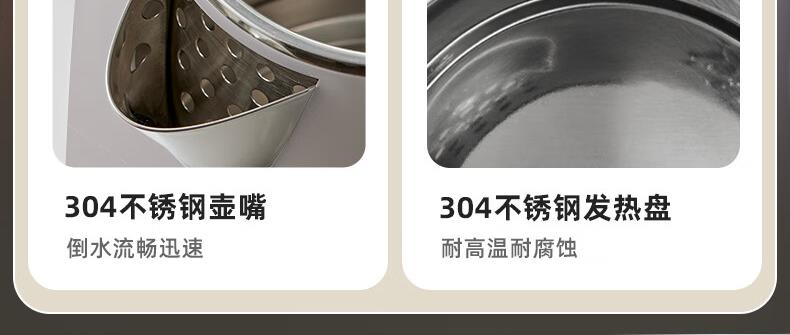 容量1.5L 电源线长0.83m 额定电压220V 额定功率1500W 304不锈钢守护,一键煮纯净好水 1500W大功率 双层防烫隔热 体贴呵护每次斟倒