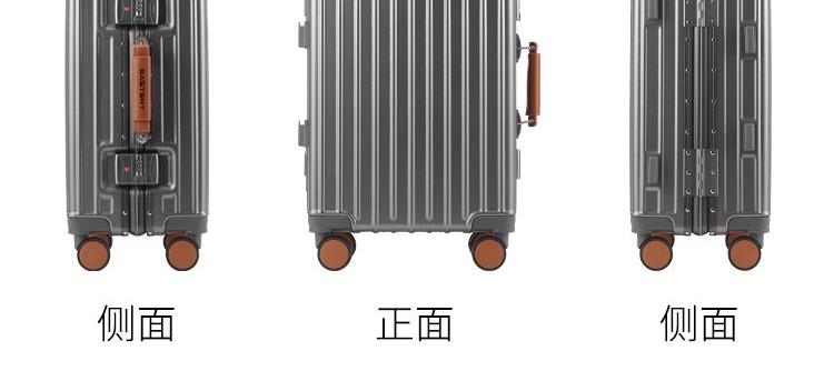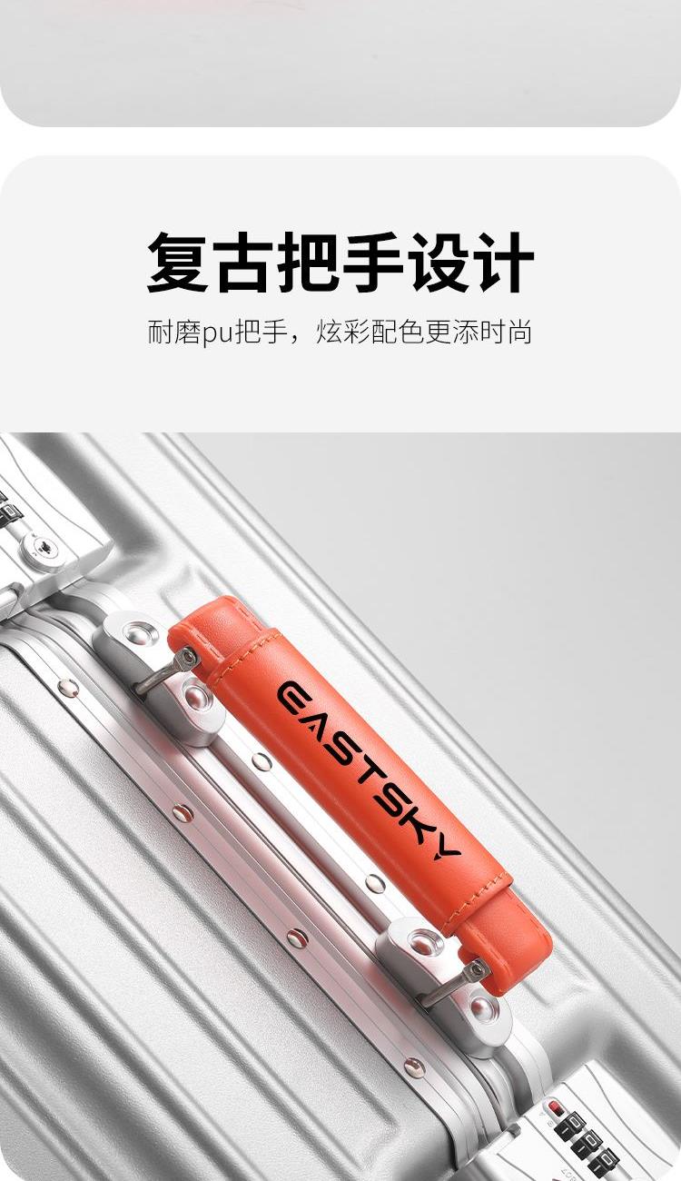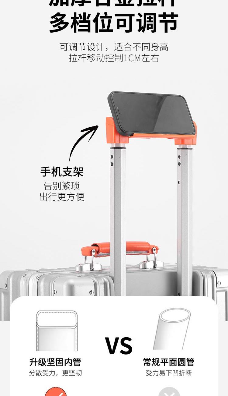 型号:EKX-6026 材质:ABS+PC(合金料) 尺寸:20英寸 净重:约3.2kg 颜色:灰色 规格尺寸:约38*58*24cm 1.合金顺滑拉杆,管壁厚实,经久耐用。 2.采用ABS+PC(合金料)材质铝框加固箱壳,比传统材质更为坚固,抗震。 3.灵活飞机八轮,360°旋转,稳定顺滑,让旅途更省心。 4.内里干湿分离。 5.杯架及手机支架功能设计,出行更为便捷。