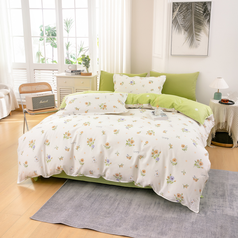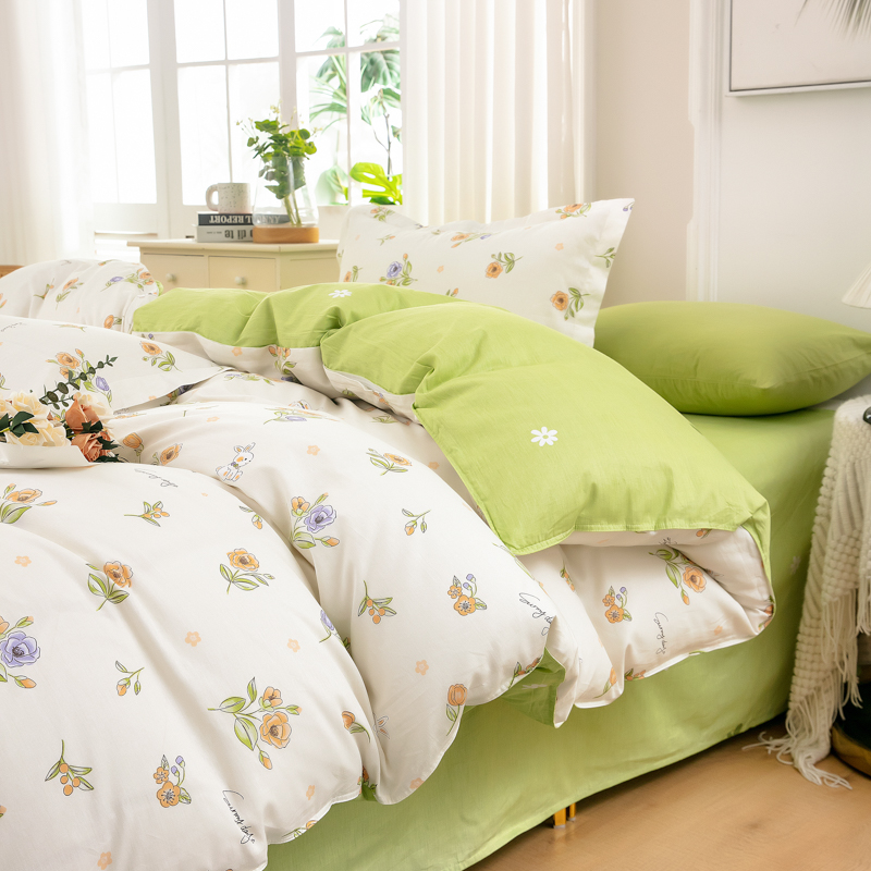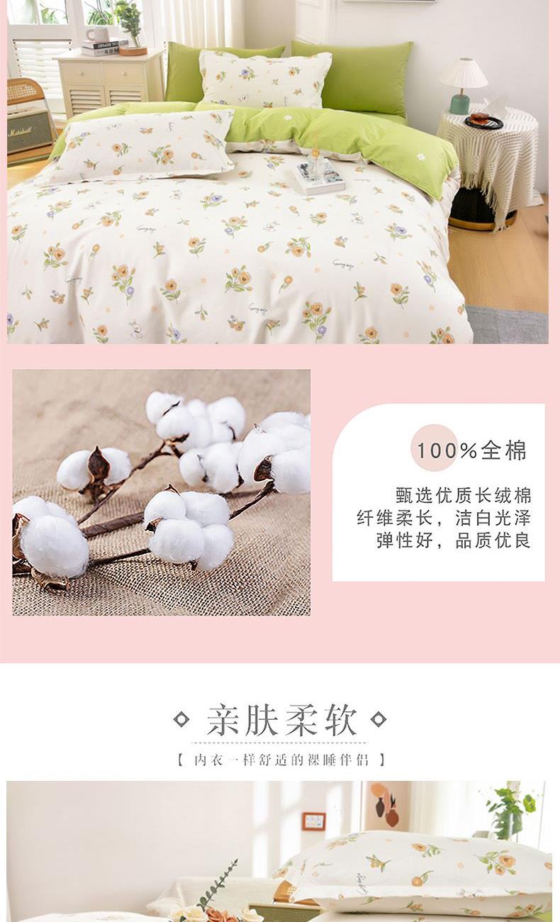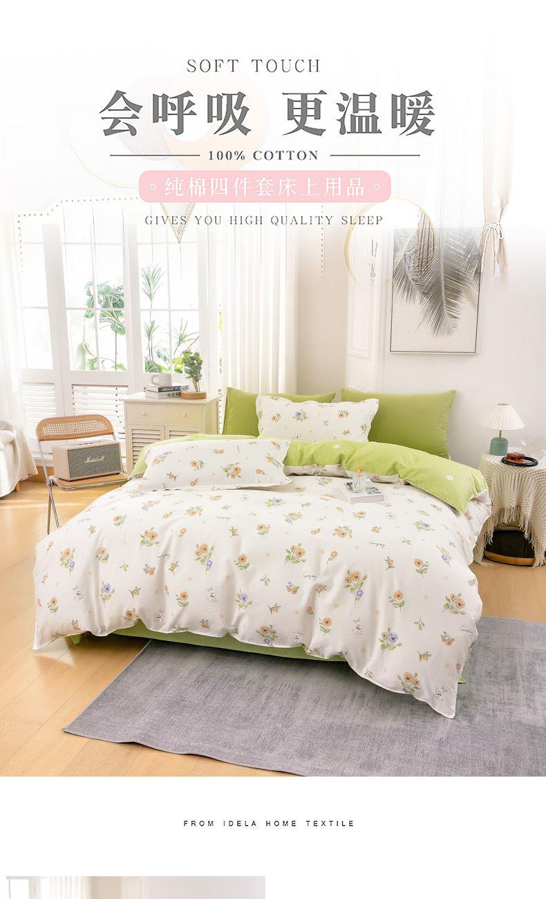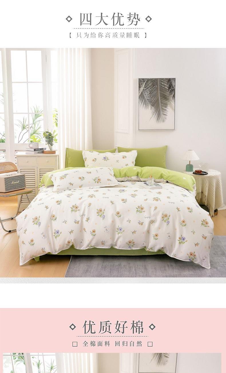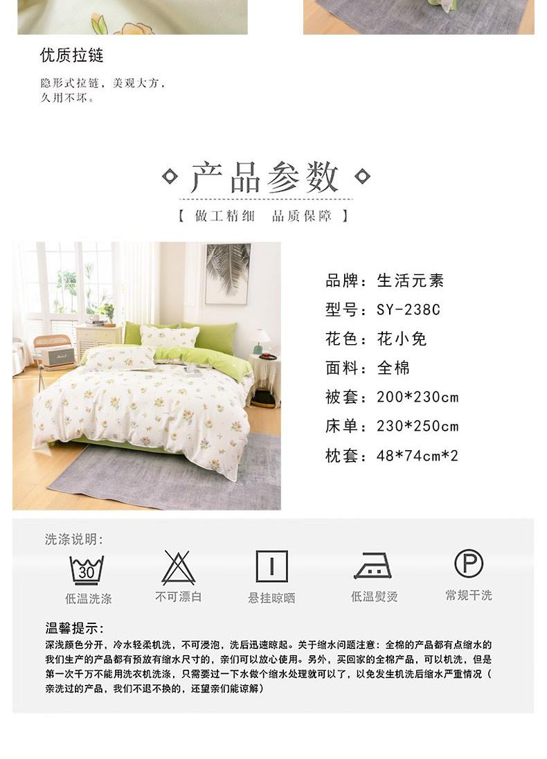 花色:花小免 面料:全棉 被套:200*230cm 床单:230*250cm 枕套:48*74cm*2 包装方式:彩盒 包装尺寸:50*35*7cm 1、全棉活性印花面料,绿色环保,色泽自然靓丽,久用不掉色,细腻柔润舒适,亲肤性好,吸湿透气,让您享受一种清馨自然的舒适睡眠。 2、历经多道印染工艺,经精梳后纺织而成,贴身舒适,柔软亲肤质感。