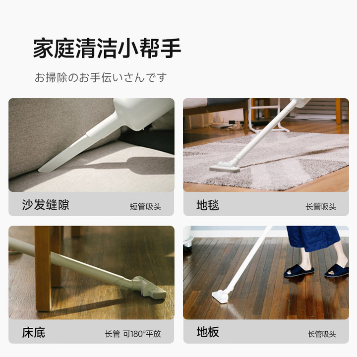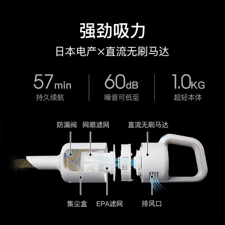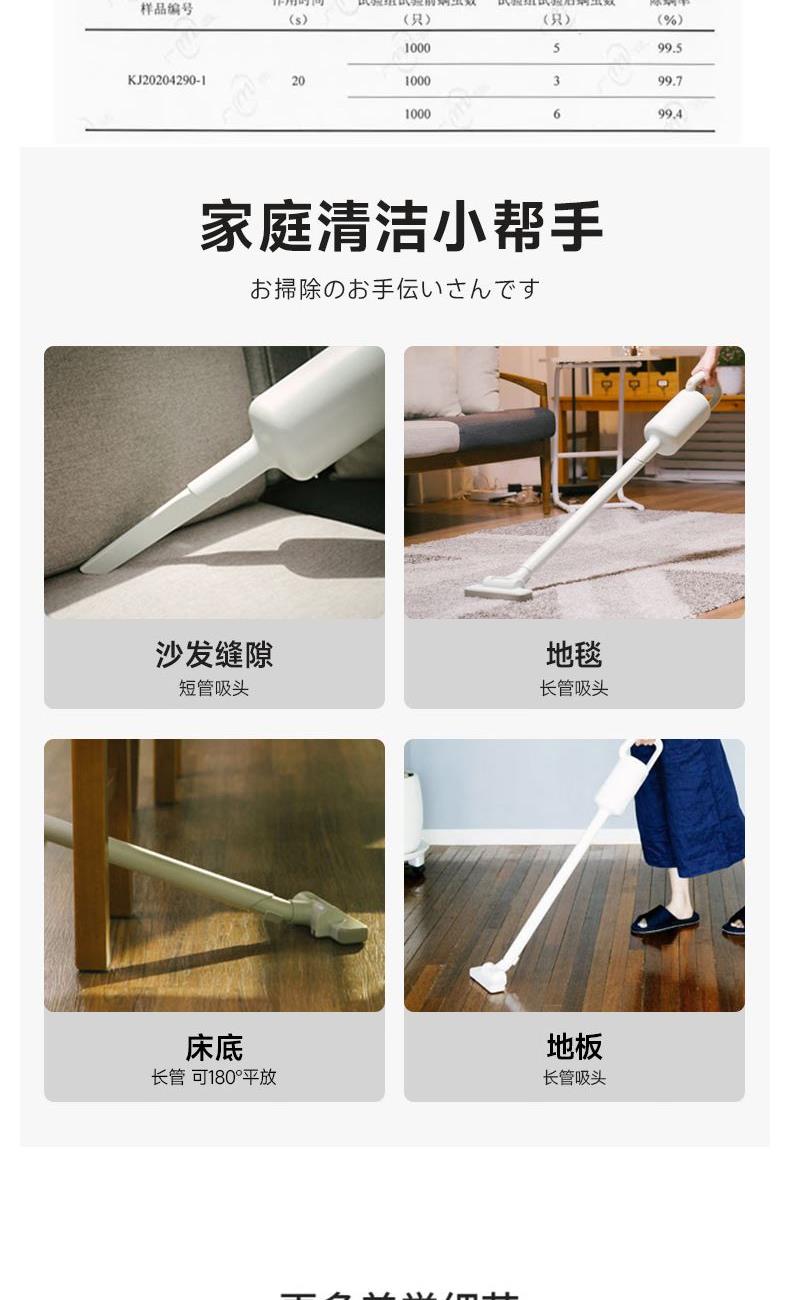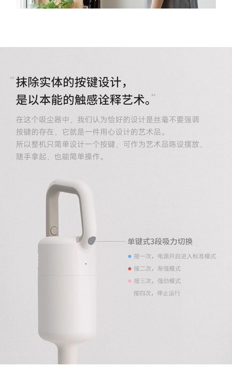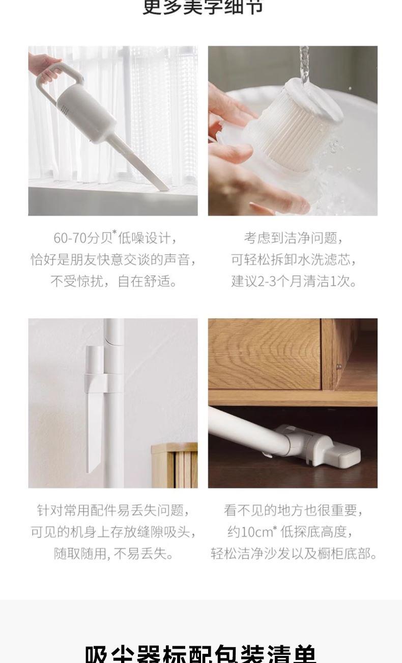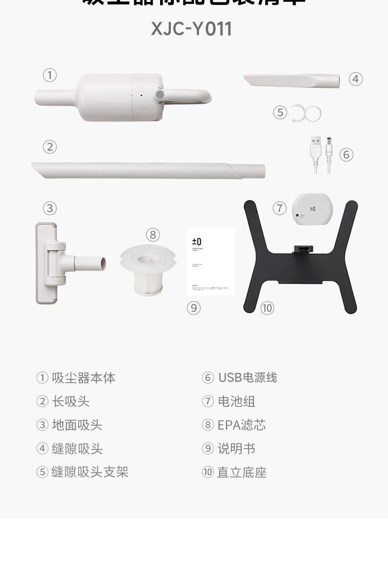 型号:XJC-Y011 充鼋時間:約 3.5 小時 連績使用時間:強カ約 17 分鐘 強約 25 分鐘 標準約 50 分鐘 集麈盒容量:約 0.6L 额定功率:70 W USB 充電規格:5.0V 2.0A 重量:手提組件 約 1.0 kg 恰到好處的極簡風 超輕量設計,單手輕鬆用 高等級的直流馬達 超長電力設計 兩種充電方式 360度方位清潔