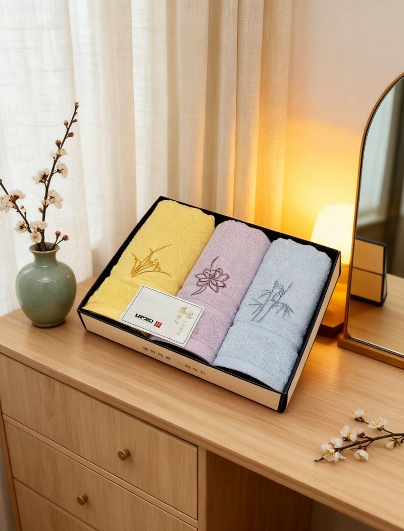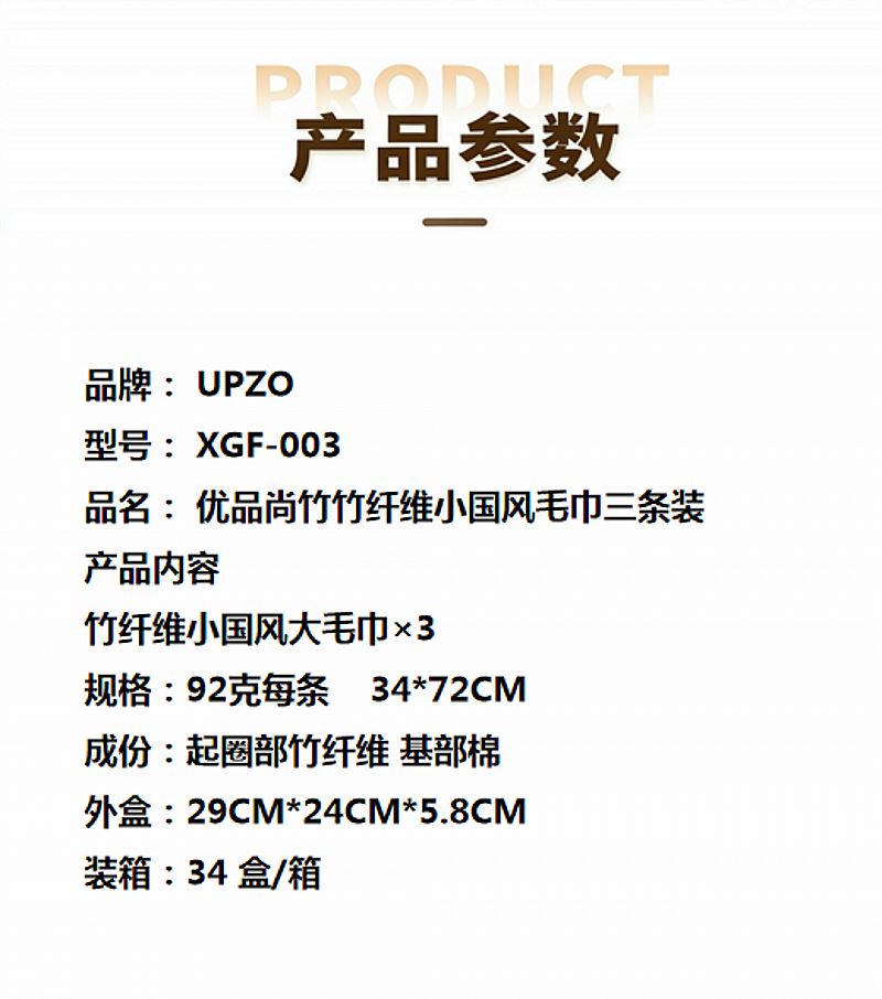 型号: XGF-003 产品内容 竹纤维小国风大毛巾×3 规格:92克每条 34*72CM 成份:起圈部竹纤维 基部棉 外盒:29CM*24CM*5.8CM 精选竹纤维材质 结合国风刺绣 优质好礼