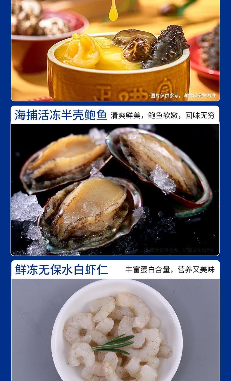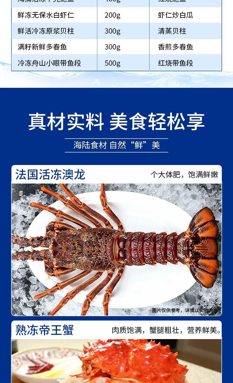 法国活冻澳龙350g-400g 法国活冻澳龙350g-400g 智利熟冻帝王蟹800g-1000g 越南活冻黑虎虾仁300g 冷冻去壳带黄扇贝肉300g 速冻全家福海鲜什锦300g 阿拉斯加鳕鱼块300g 海味金汤佛跳墙260g 海味金汤佛跳墙260g 海捕活冻半壳鲍鱼400g 鲜冻无保水白虾仁200g 鲜活冷冻原浆贝柱300g 满籽新鲜多春鱼300g 冷冻舟山小眼带鱼段500g