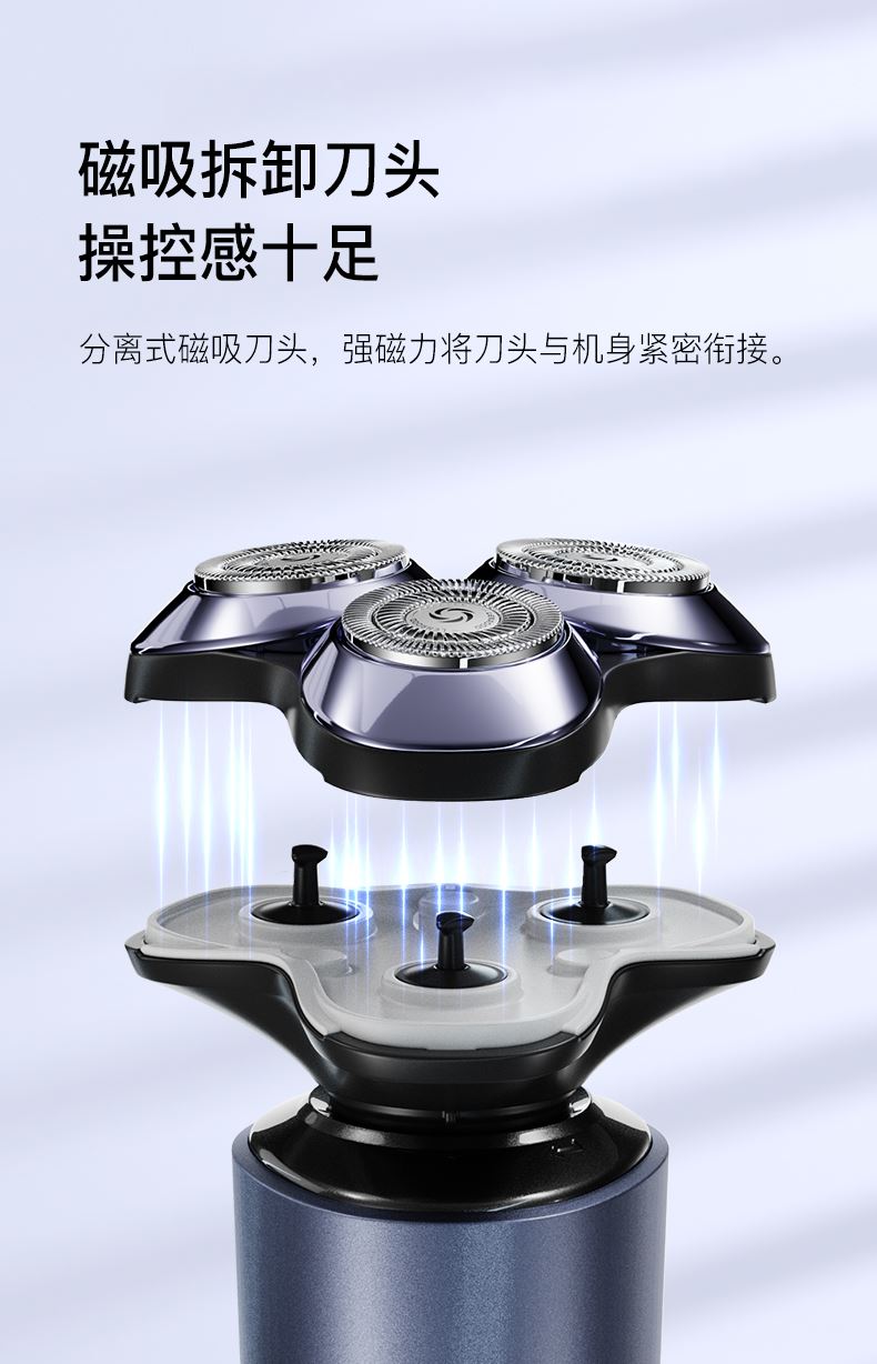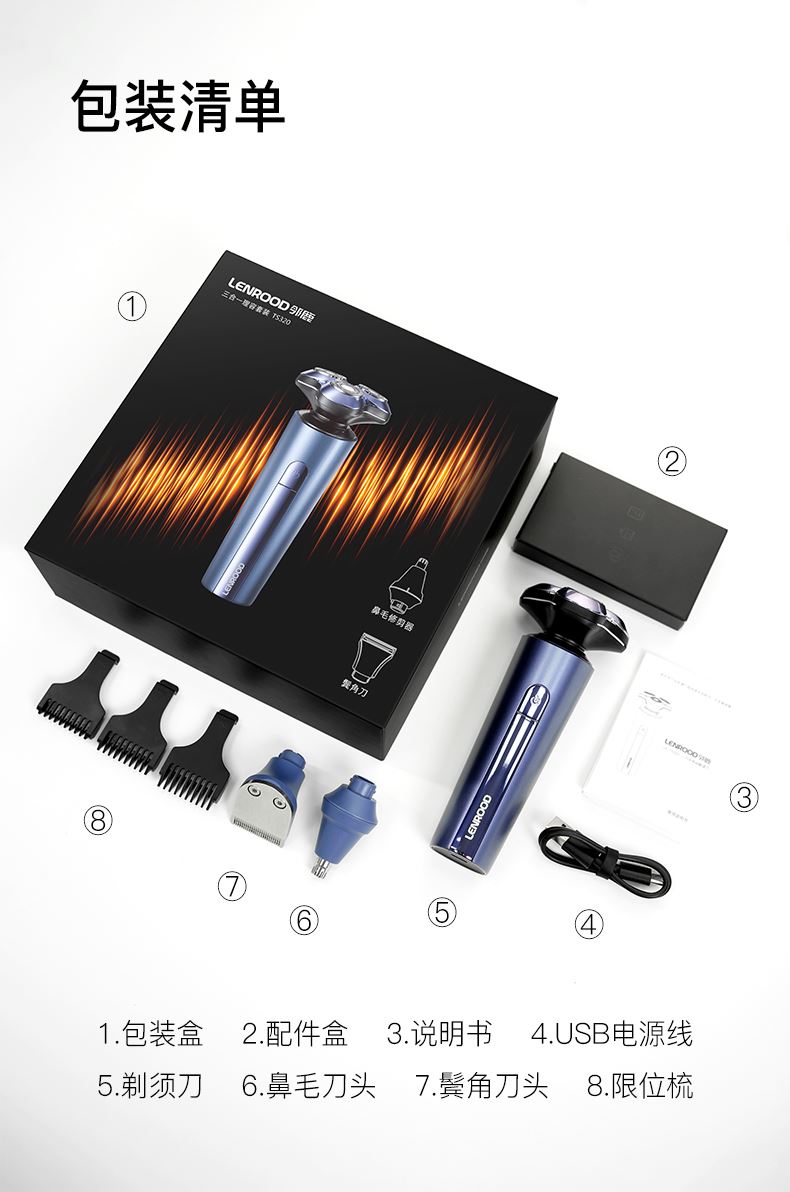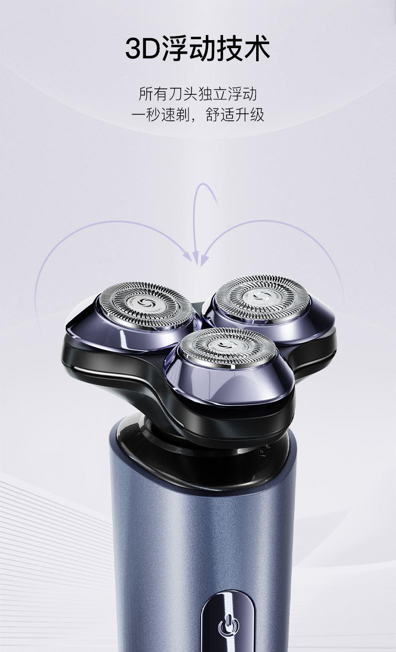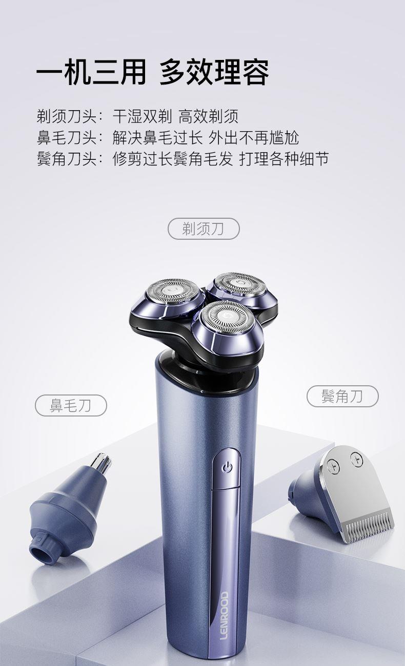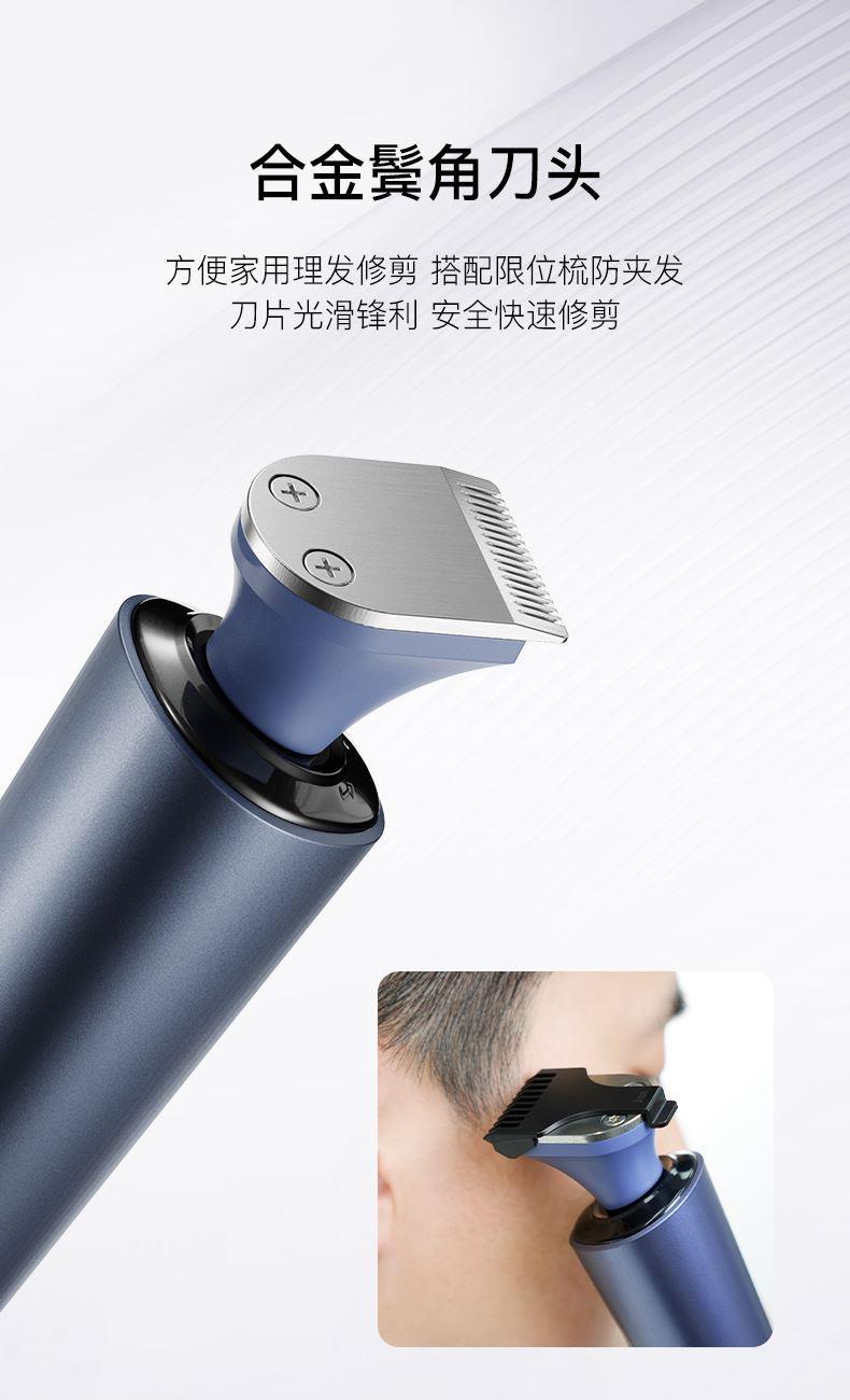 1.鬓角刀,剃须,鼻毛修剪器三合一套装 2.IPX7 全身水洗,干湿双剃 3.1 小时快充,60 分钟超长放电时间 4.环保恒压锂电池,Typec-C充电,即插即用5.3D 浮动刀头,智能防夹须 6.3D浮动刀头,智能防夹须 7.3300+次/分钟,超强动力,高速切剃 8.自妍磨刀片,切剃更锋利, 60db-低分贝工作 .剃须不嘈杂