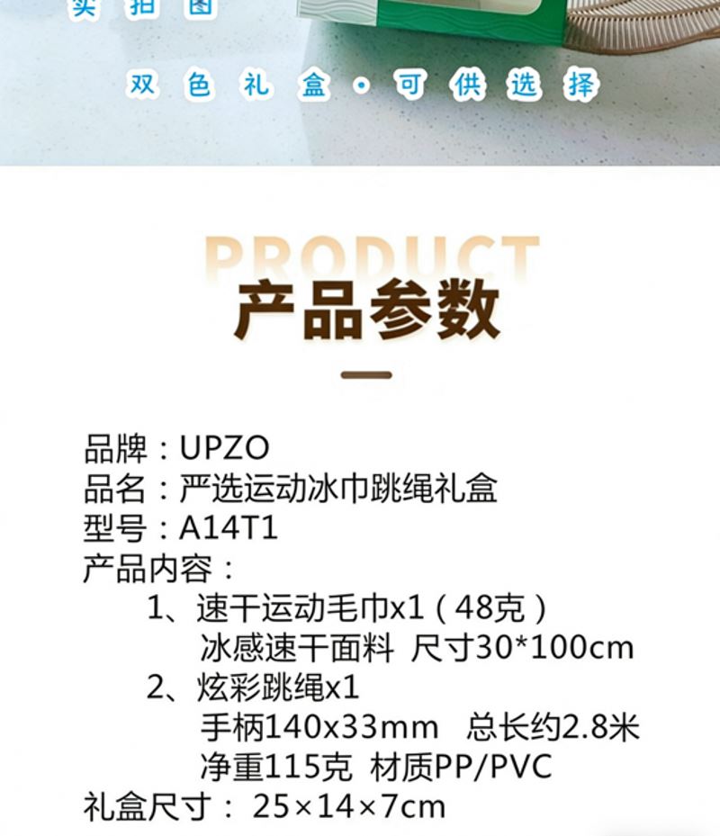 型号: A14T1 产品内容 1、 速干运动毛巾×1 冰感速干面料 规格: 30cm×100cm 48 克 2、 炫彩跳绳×1 手柄尺寸:140*33mm 跳绳总长:约2.8米 产品净重:115克 产品材质:PP/PVC 外盒: 25×14×7cm 跳绳双层手柄设计 体感更好 设计清爽 材质优异 运动冰巾采用整版数码印工艺 色彩靓丽 产品面料优质 做工精良