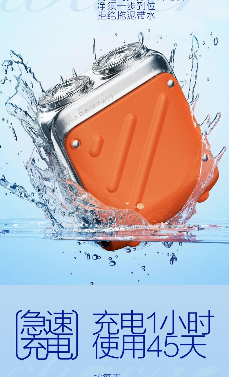 电机转速:9000转/min 刀头材质:精钢 刀头数量:2个 产品尺寸:长53mm;宽28.5mm;高63mm 产品净重:0.1kg 电压:5V 防水等级:IPX7,可全身水洗 充电时间:1小时快充 续航:60天 1、设计轻奢便携,超高颜值; 2、省级双环弧面刀网,3D浮动刀头,智能防夹须; 3、9000转高速静噪电机,够性能才够快; 4、顺滑贴肤,干湿两剃; 5、IPX7级防水等级,可全身水洗;