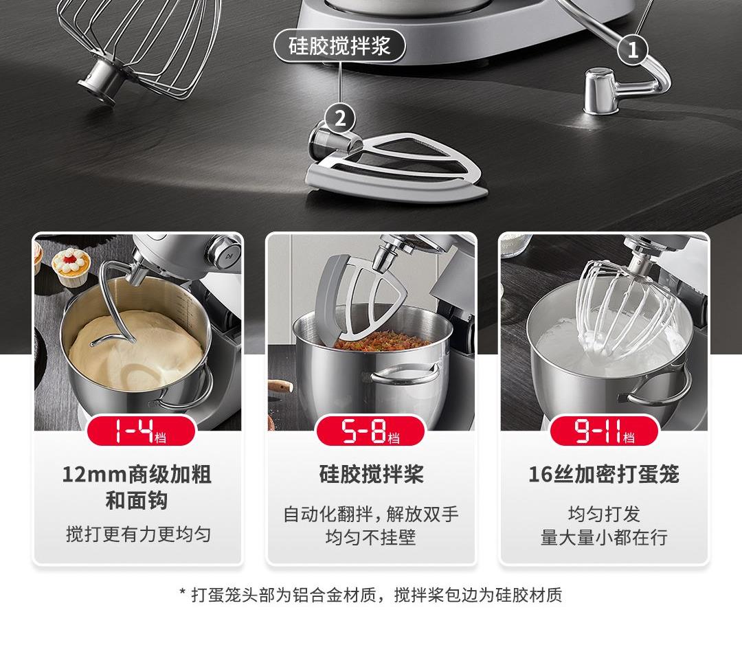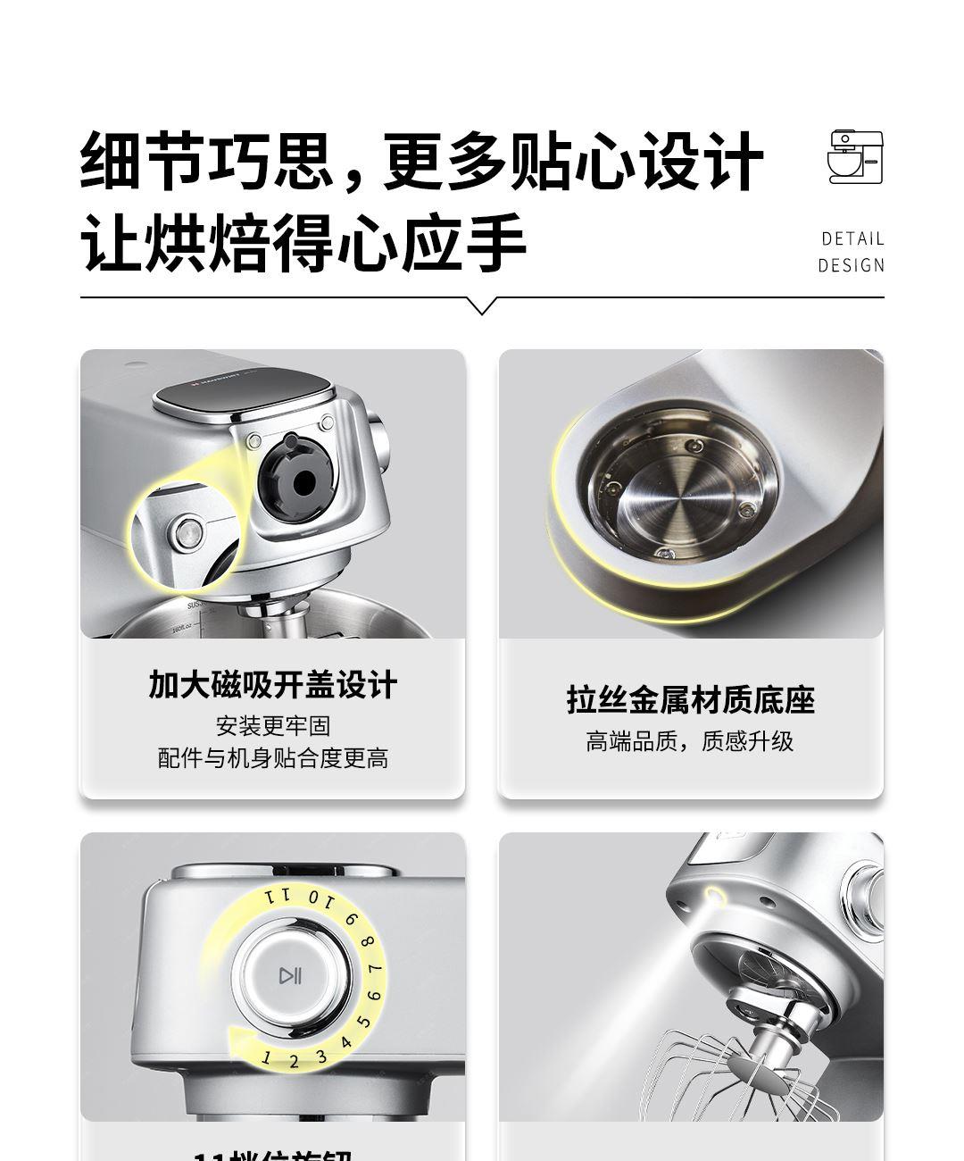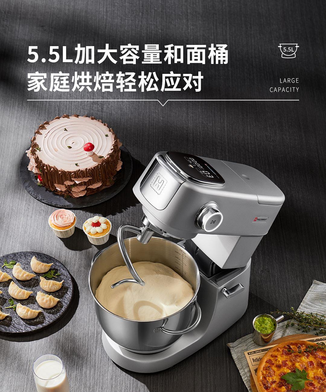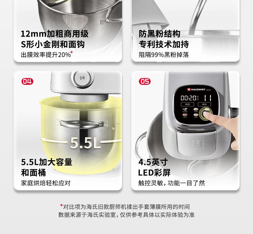 产品容积:5.5L 额定电源:220V~50HZ 功率:800W 时控区间:0-30分钟 产品档位:0-11档 9KG加厚铸铝机身+金属加宽底座设计,稳固机身高速不晃动 12mm加粗商用级,S形小金刚和面钩,出膜效率提升20% 防黑粉结构,阻隔99℅黑粉掉落 5.5L加大容量和面桶,家庭烘焙轻松应对 升级4.5英寸彩色触控屏,五大智能菜单+自定义双模式调控 顶置触控彩屏+侧方位旋钮调节,无需弯腰设定参数 升级专业降噪设计,独享安静烘焙空间