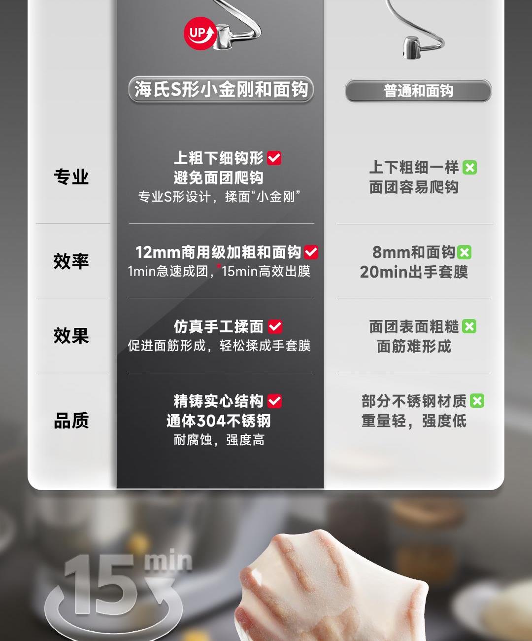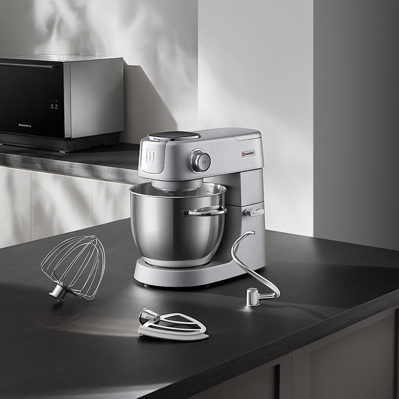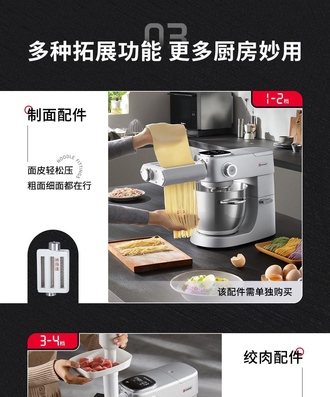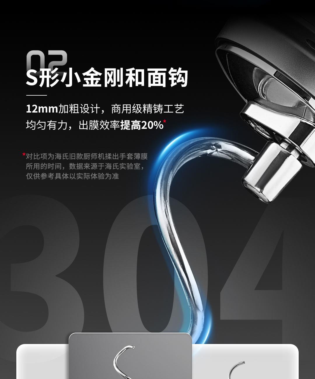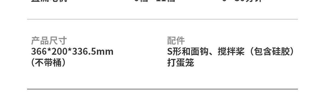 产品容积:5.5L 额定电源:220V~50HZ 功率:800W 时控区间:0-30分钟 产品档位:0-11档 9KG加厚铸铝机身+金属加宽底座设计,稳固机身高速不晃动 12mm加粗商用级,S形小金刚和面钩,出膜效率提升20% 防黑粉结构,阻隔99℅黑粉掉落 5.5L加大容量和面桶,家庭烘焙轻松应对 升级4.5英寸彩色触控屏,五大智能菜单+自定义双模式调控 顶置触控彩屏+侧方位旋钮调节,无需弯腰设定参数 升级专业降噪设计,独享安静烘焙空间