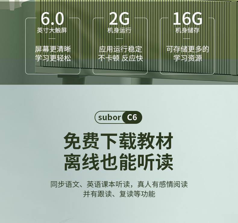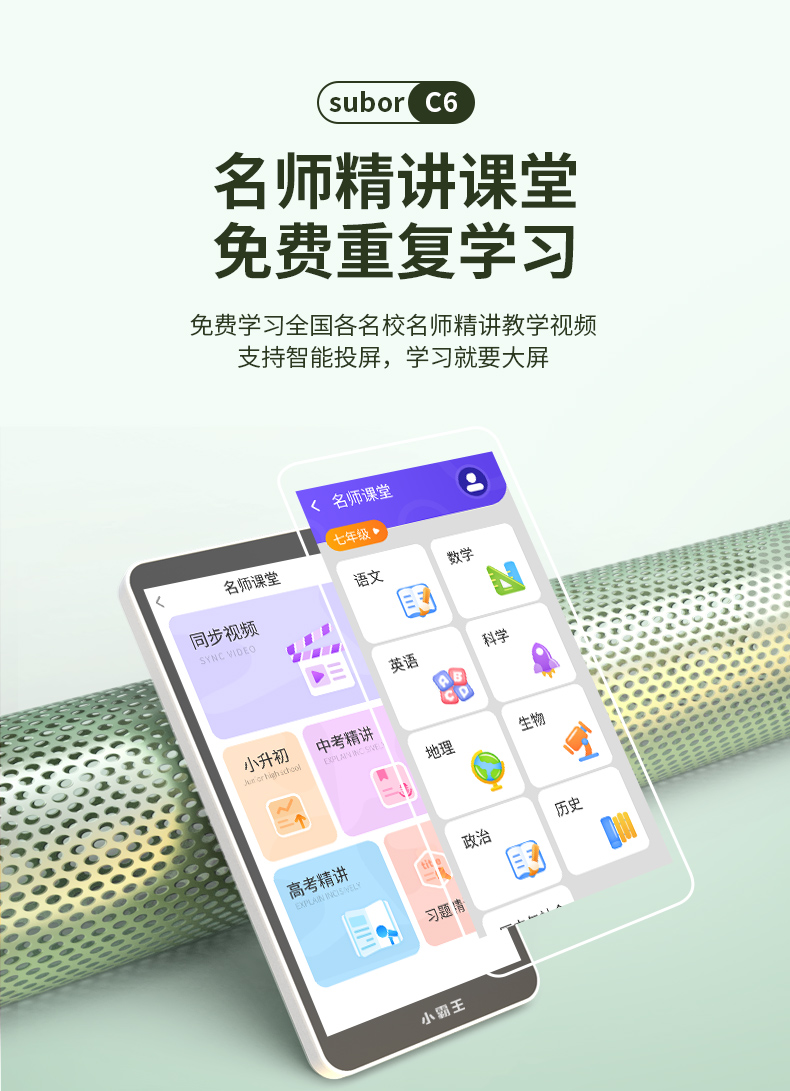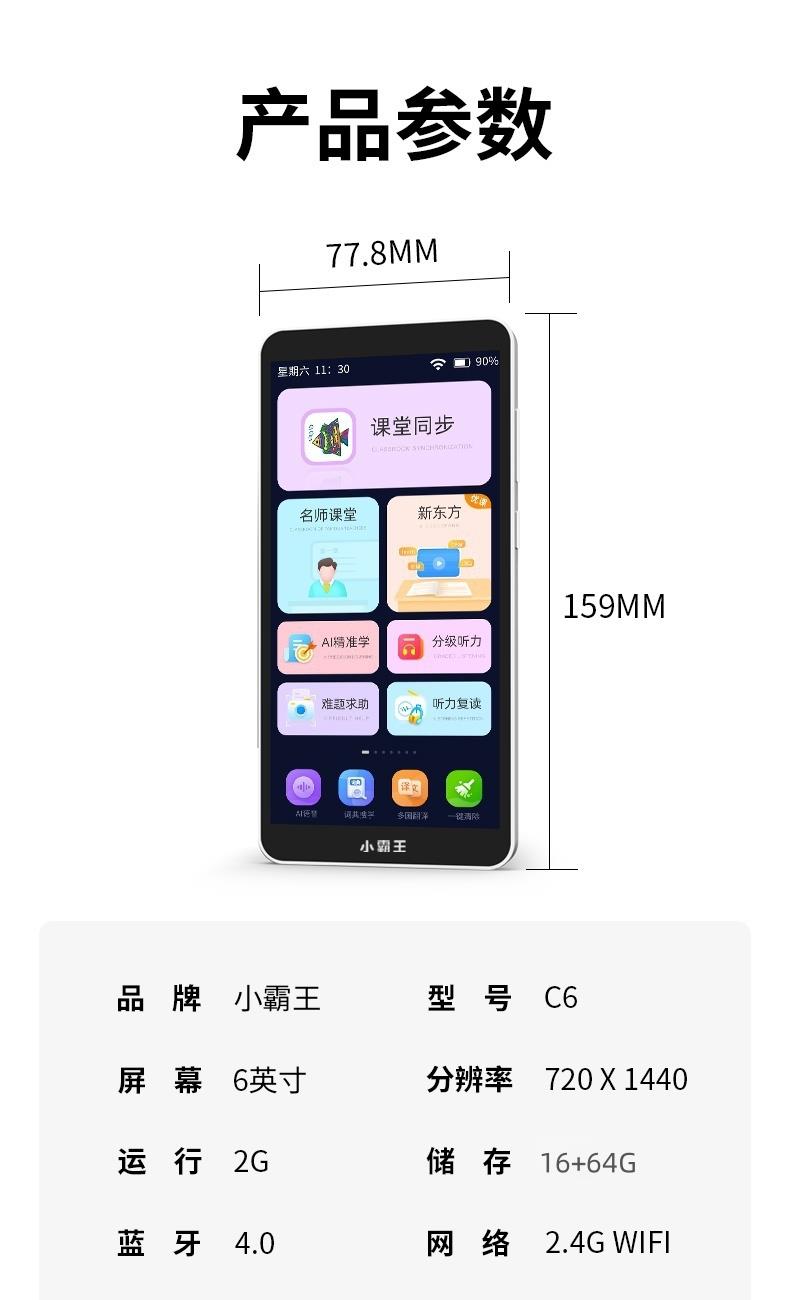 清单:学习机C6+充电线+说明书+包装盒 屏幕尺寸:6.0英寸 分辨率:720*1440 电池:2500mAh 内存和储存:16+64GB 支持拓展128G 摄像头:后置500W 网络:2.4GWiFi 产品尺寸:159*77.8mm 源于纳米盒APP,正版教材,原版真人发音,可免费在线吸在,正版教材免费试用;进阶课堂,进阶幼稚精讲知识视频,幼儿教育、小学提升、初中精讲、高中冲刺;同步AI学,查缺补漏巩固知识;手机一样大小,方便随身携带;贴合全面屏,视界清晰不刺眼;名师精讲课堂,免费重复学习;遇难题拍照上传,秒推送解析思路;同步课本训练,智能批改练习题;20种语言互译,一键语音翻译;告别手动输入,语音识别查询;海量听读资源,课内课外皆有
