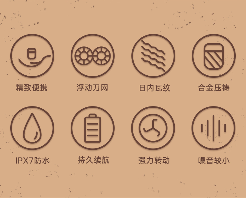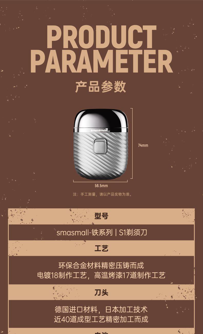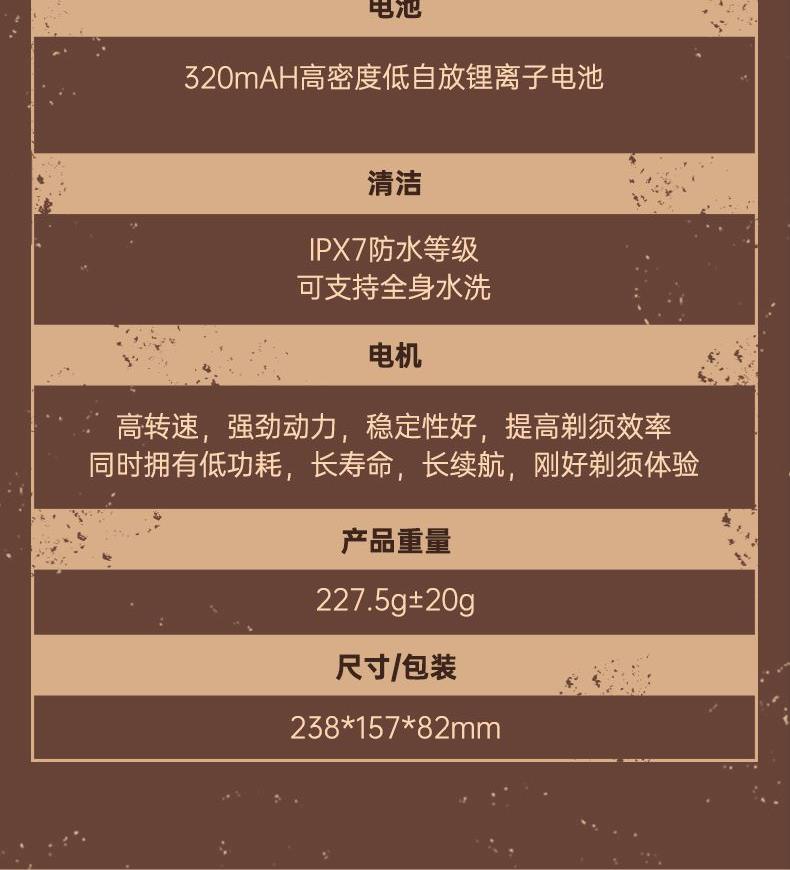 电池:320毫安 电池材质:高容量钴酸锂 充电接口:Tpye-C 续航时间:60分钟 充电时长:1小时 防水等级:ipx7级防水 刀片材质:进口钢材 内开放式刀头 产品重量单/整箱:405g/7290g