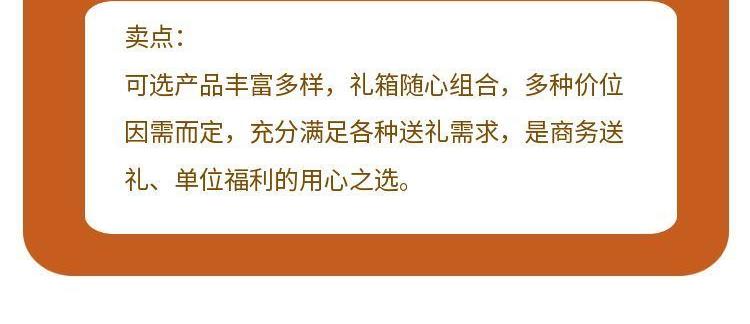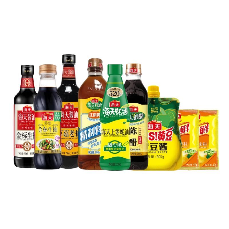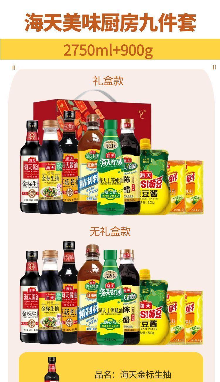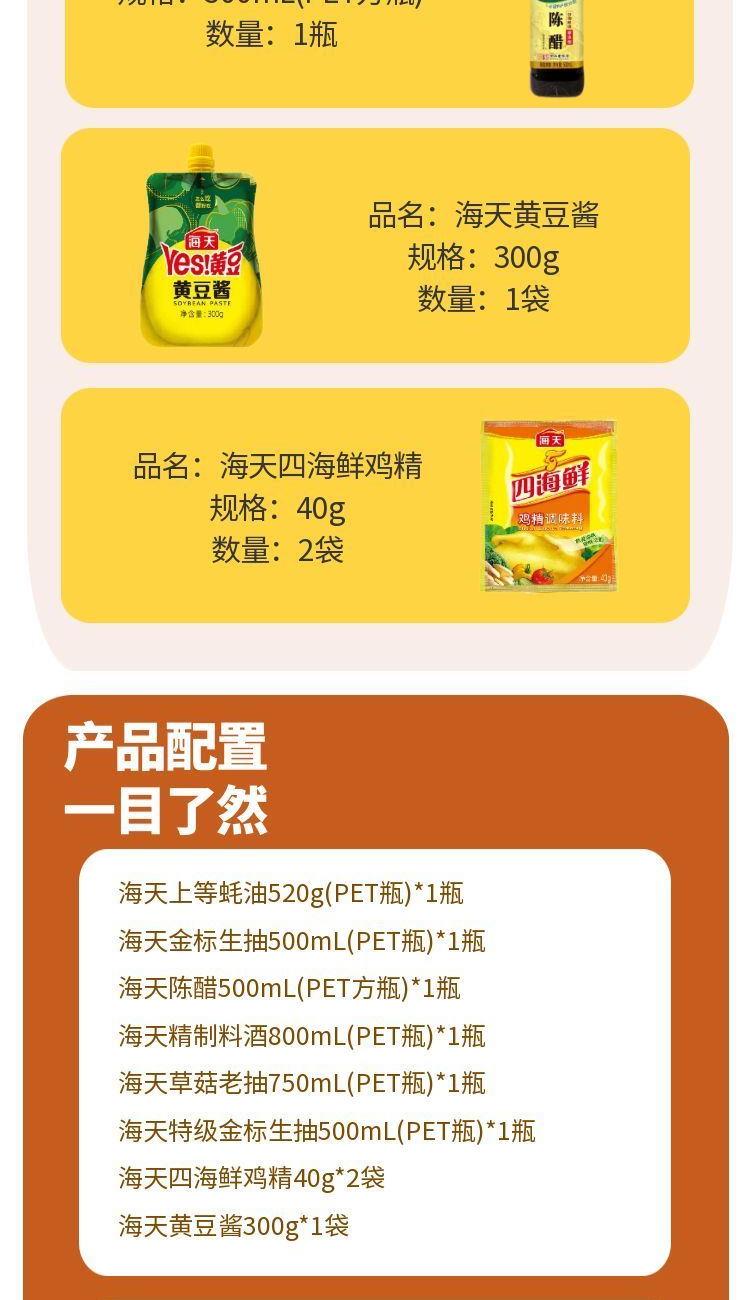 产品配置: 海天上等蚝油520g(PET瓶)*1瓶 海天金 标生抽500mL(PET瓶)*1瓶 海天陈醋500mL(PET方瓶)*1瓶 海天精制料酒800mL(PET瓶)*1瓶 海天草菇老抽750mL(PET瓶)*1瓶 海天特级金 标生抽500mL(PET瓶)*1瓶 海天四海鲜鸡精40g*2袋 海天黄豆酱300g*1袋 卖点: 可选产品丰富多样,礼箱随心组合,多种价位因需而定,充分满足各种送礼需求,是商务送礼、单位福利的用心之选。