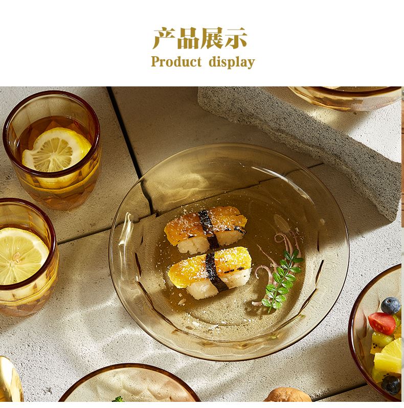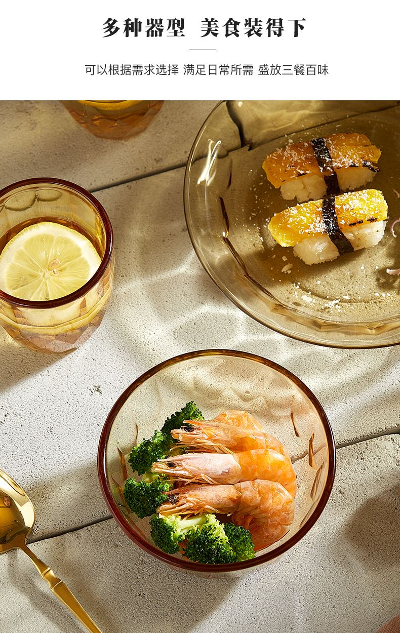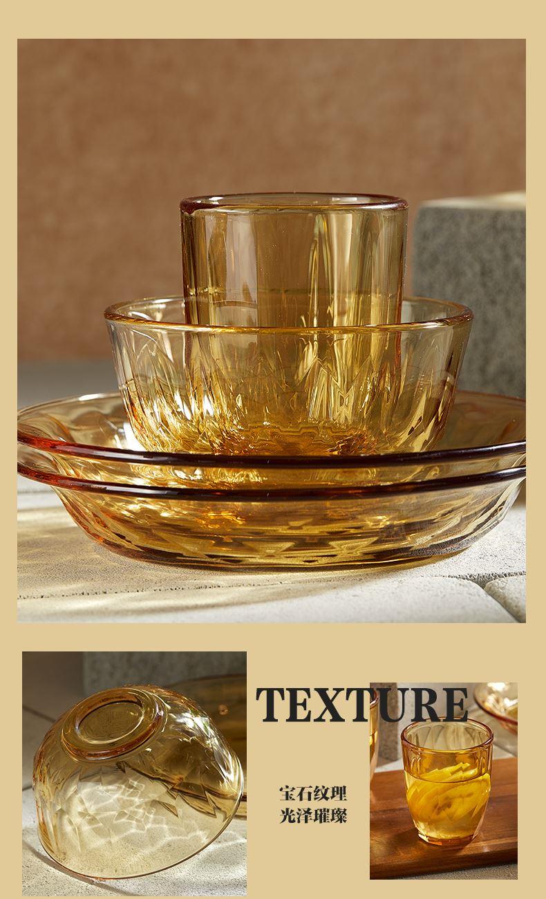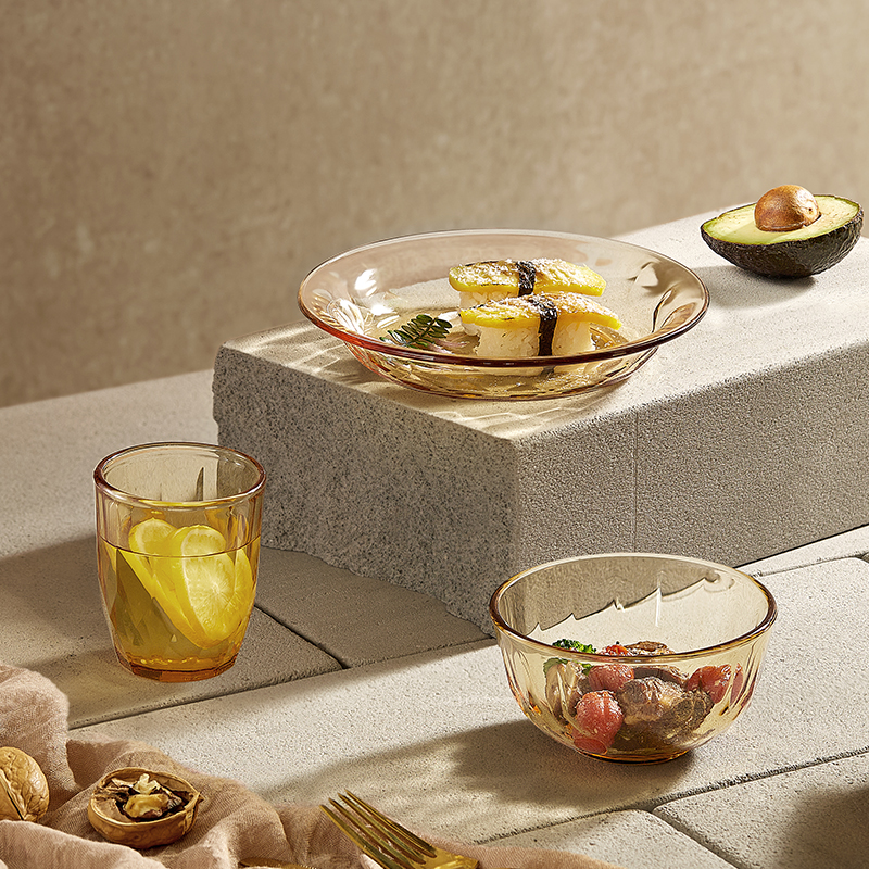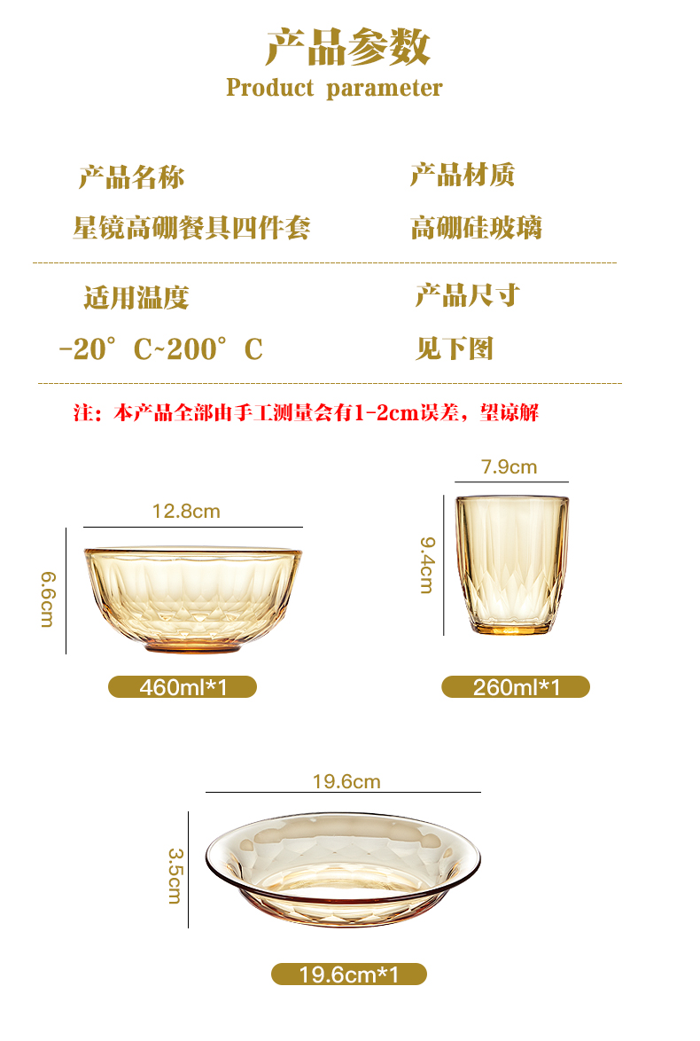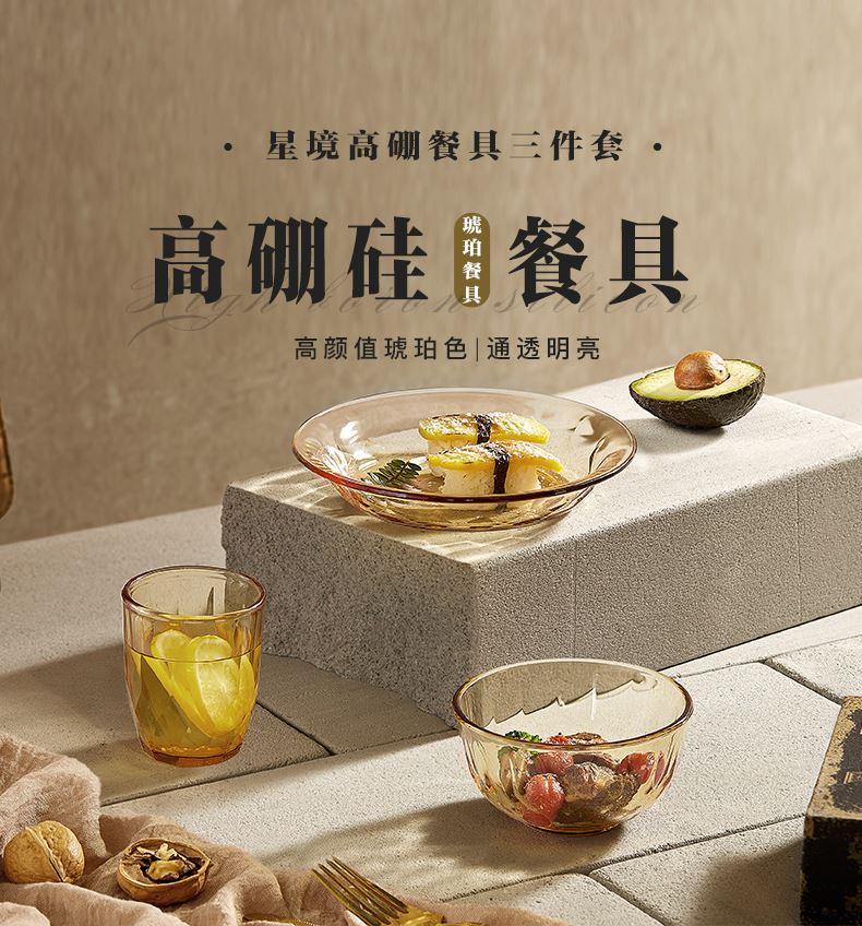 适用温度:-20°C-200°C 材 质:高硼硅玻璃 产品参数:小碗460ml*1、 杯260ml*1、 盘196mm*1 彩盒尺寸:343*91*215mm 外箱尺寸:57.3*35.5*44.9cm 产品卖点:1.产品采用高硼色料玻璃材质,颜色与生俱来,永不退色。烤箱、微波炉、冰箱冷冻放心使用。2.星境高硼餐具设计理念,用线条勾勒几何切面,以面为境折射时光、徜徉星空。3.触感温润,质感光滑,为您的餐桌增添一抹高雅;