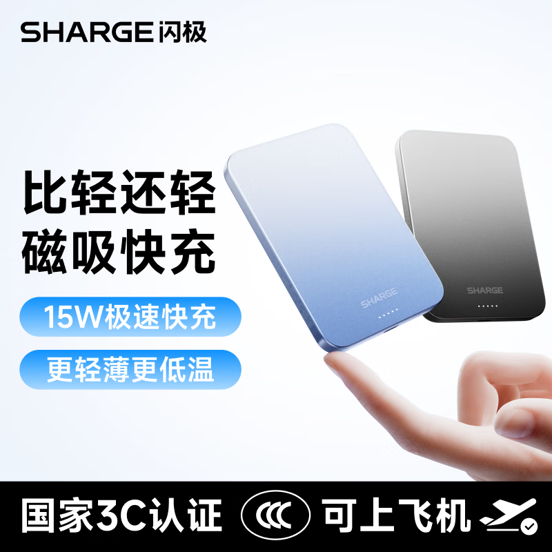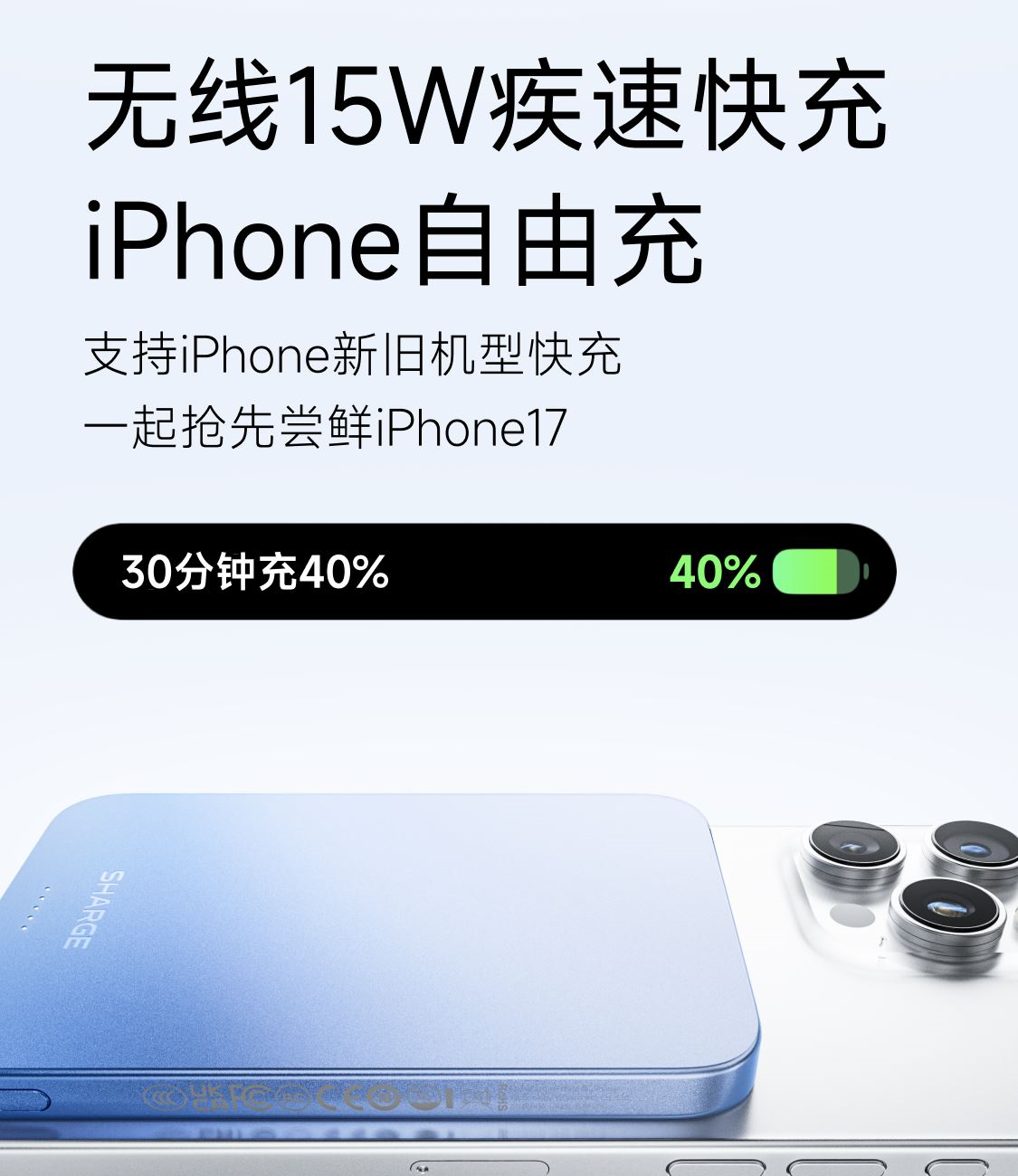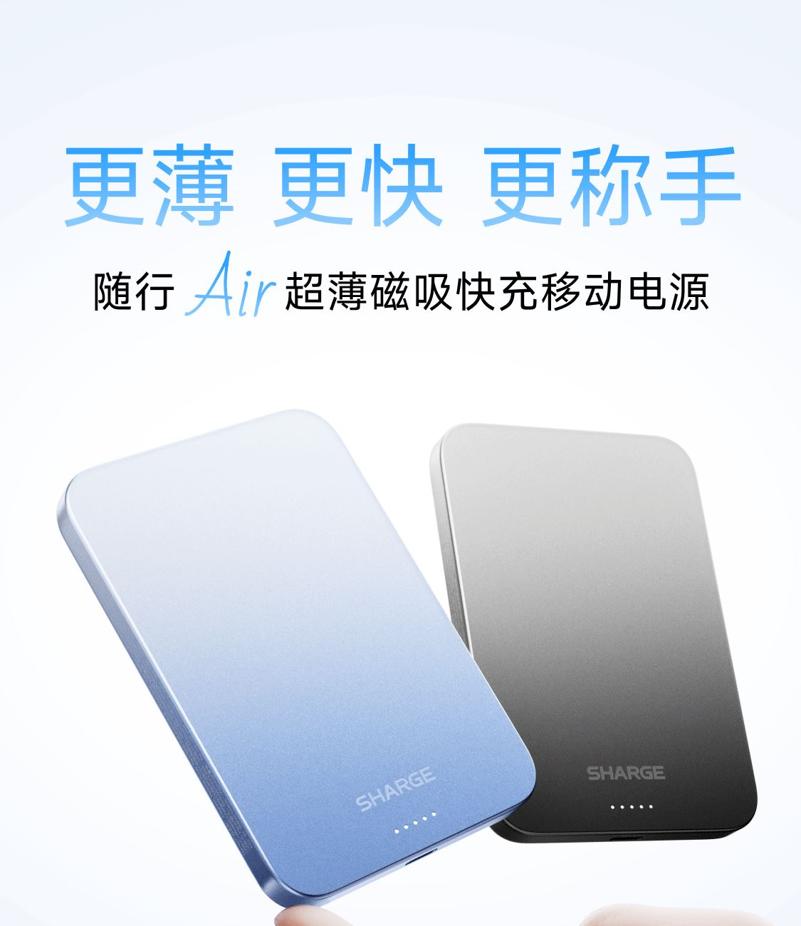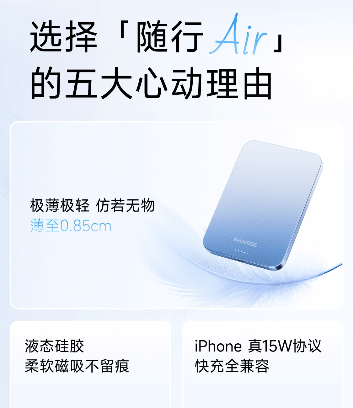 10000mAh,磁吸无线充电源 无线15W+有线20W,石墨烯散热,低温快充 轻奢铝合金材质+液态硅胶磁吸面,不伤手机 高密度聚合物电芯, 新国标3C认证 兼容PD3.0/PPS/QC/FCP/SCP等快充协议 渐变阳极氧化工艺,高颜值 17颗苹果同源磁铁,稳稳吸附