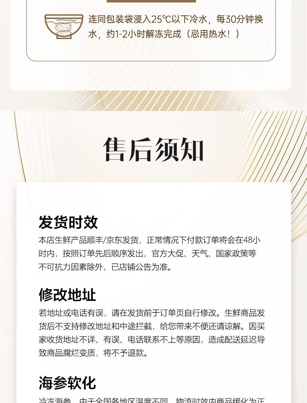 规格:1500克/(24-36头) 卖点: 京润堂大连即食海参选自黄金海域北纬39°的辽参,海域环境好,水质清洁、温度适宜,海参品质高。选取参龄5年以上的辽参,富含多种营养成分,如高蛋白含量,海参粘多糖, 维生素和多种微量元素,具有调节体质、抗疲劳、抗肿瘤等潜在功效。