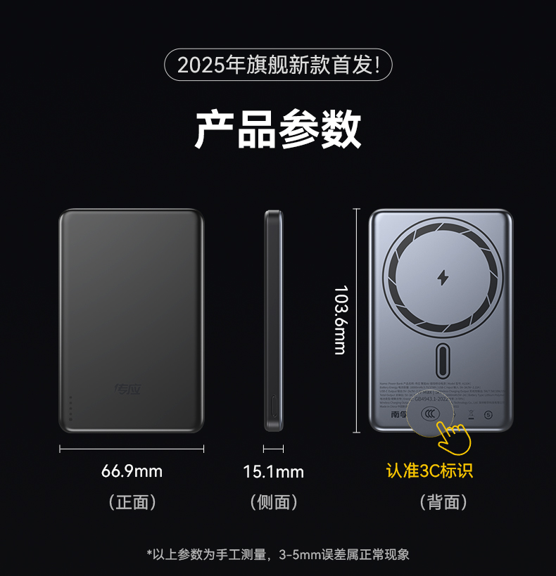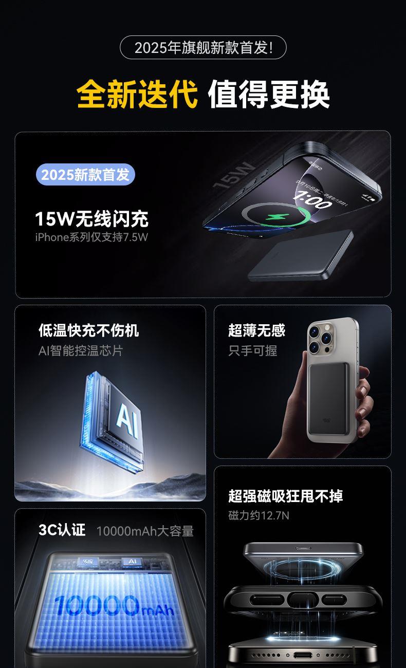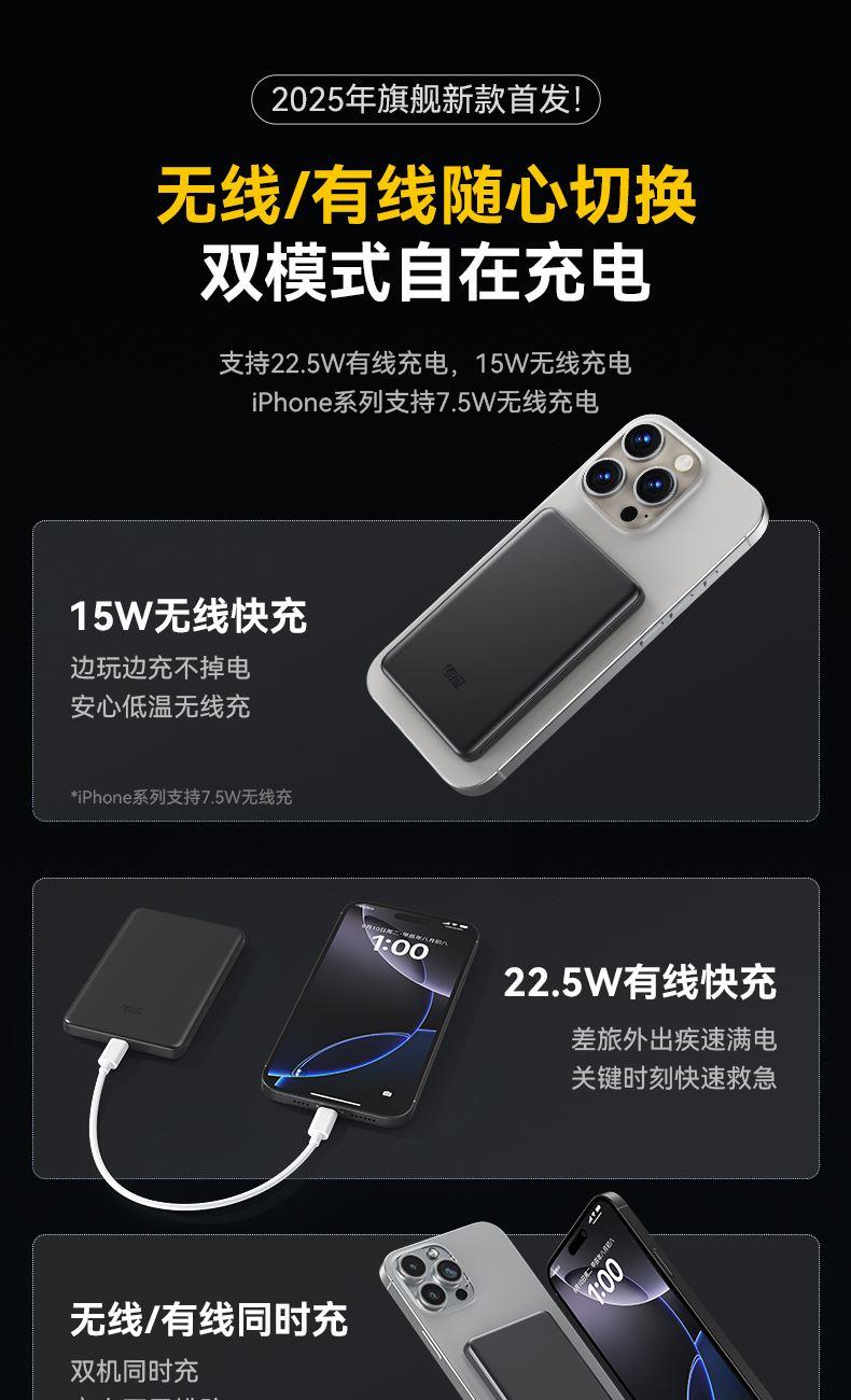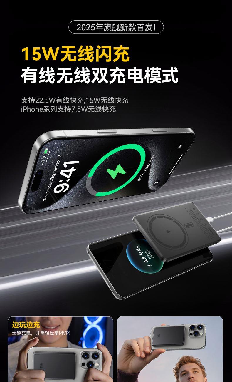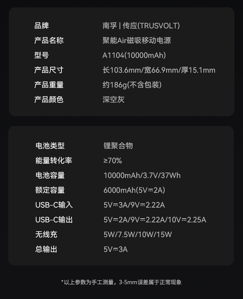 型号:黑色/白色:A1104 输出功率: 18W 有线输出:22.5W 无线输出:15W 产品颜色:深空灰/珍珠白 材质:金属外壳 电池容量:10000mAh 输出接口:Type-C 电芯:聚合物锂离子
