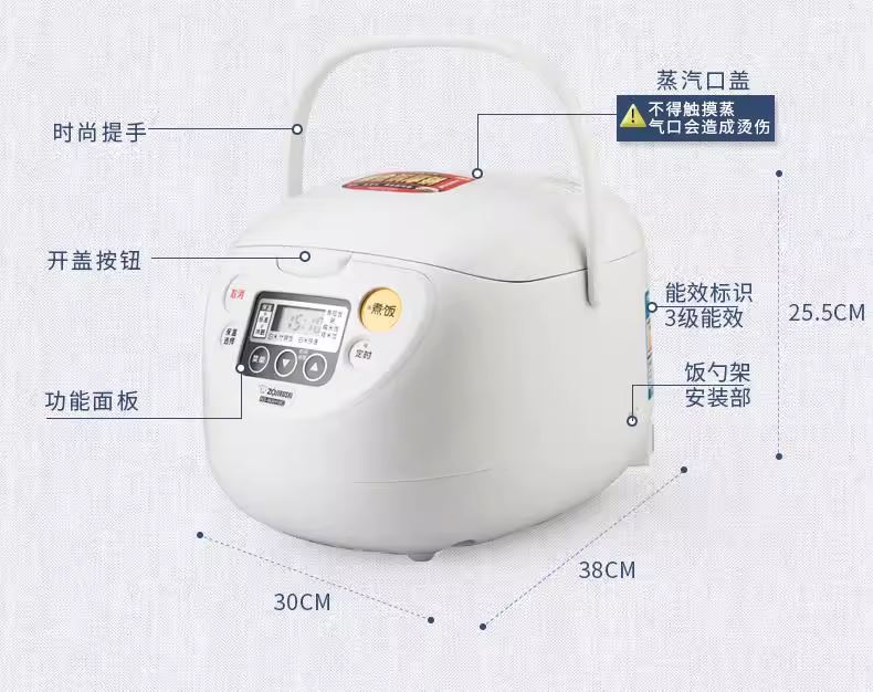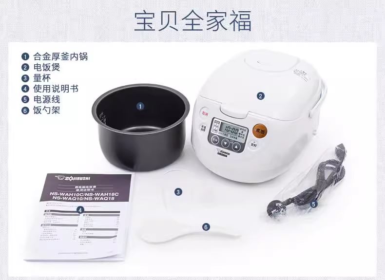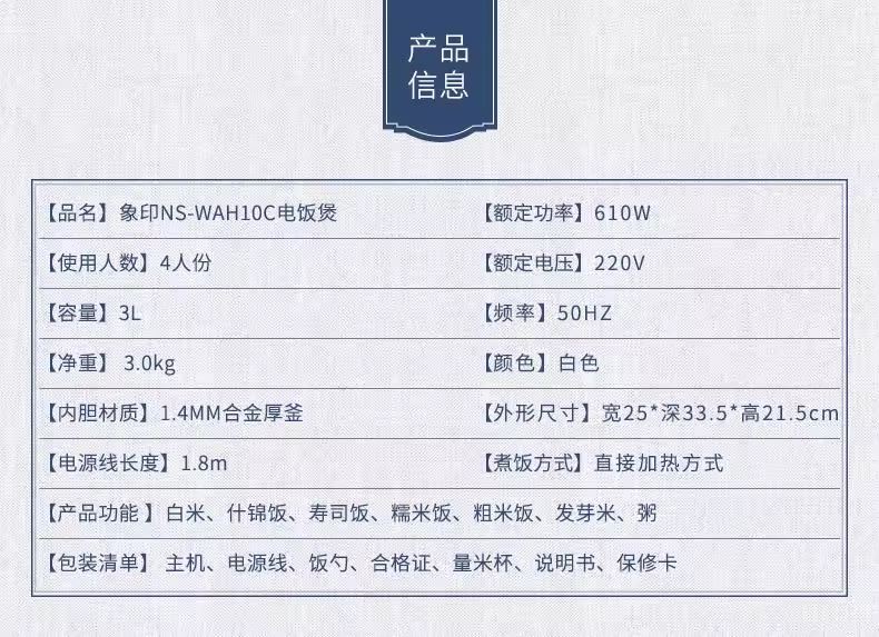 品 牌:象印ZOJIRUSHI 型 号:NS-WAH10C 颜 色:白色 容 量:3L 类 型:电饭煲 适合人数:4-6人 输入功率:641W 重 量:约3KG 产 地:中国