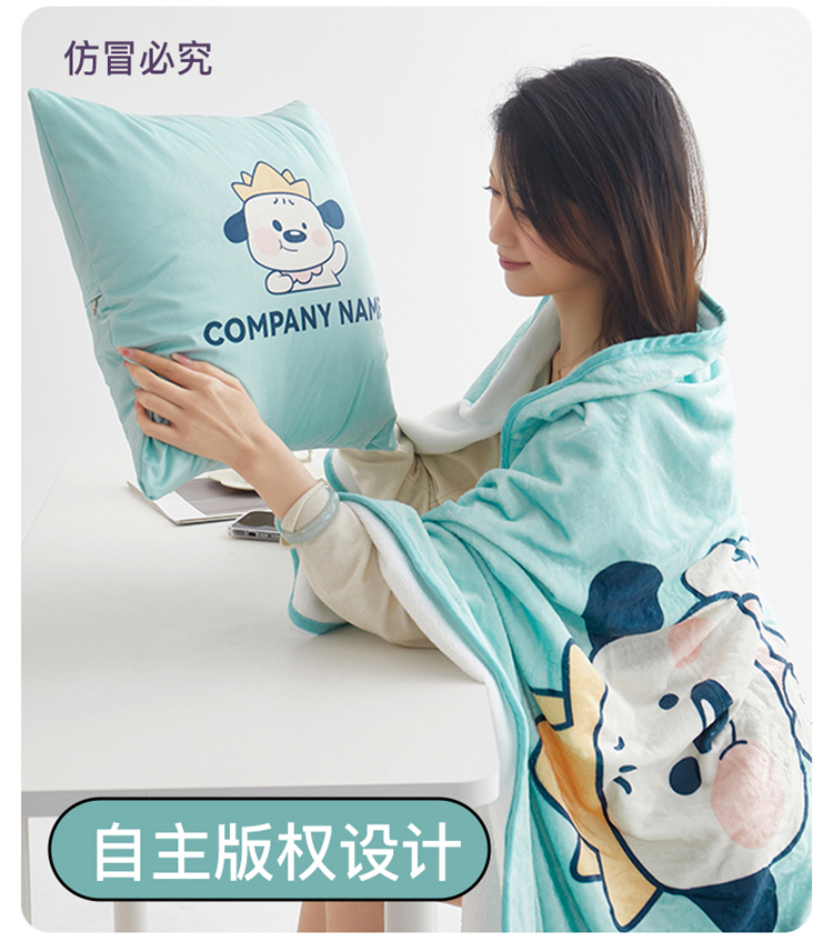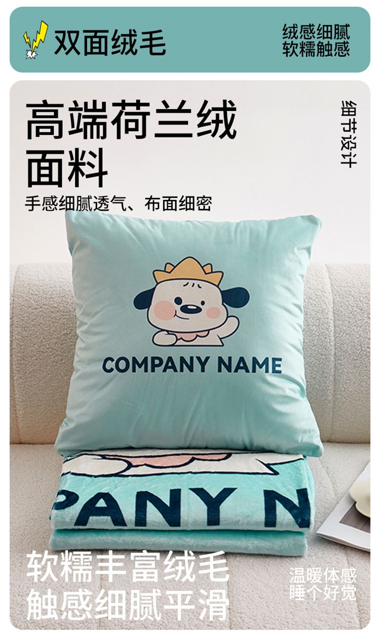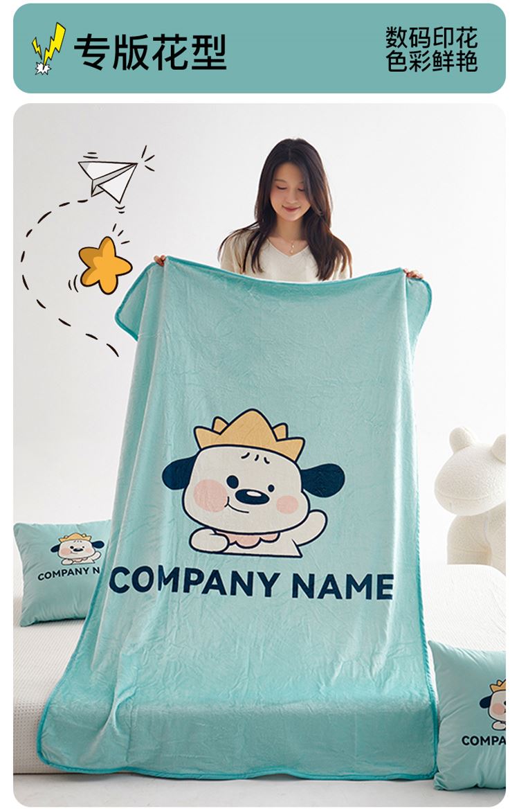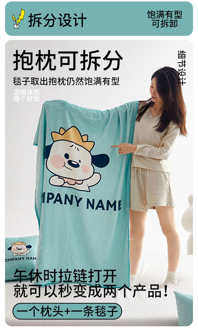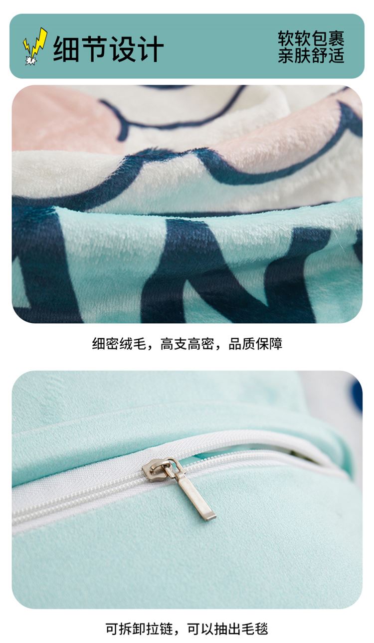 绒毯采用高克重金貂绒面料,大版数码印花工艺,彰显独特青春美学。毯子全部采用立体小包边工艺设计,更加彰显品质!支持水洗、机洗,各种洗,不褪色、不起球,不起静电!并且本款采用可拆卸式设计,毯子取出抱枕仍然饱满有型,午休时拉链打开就可以秒变成两个产品!一个枕头+一条毯子。