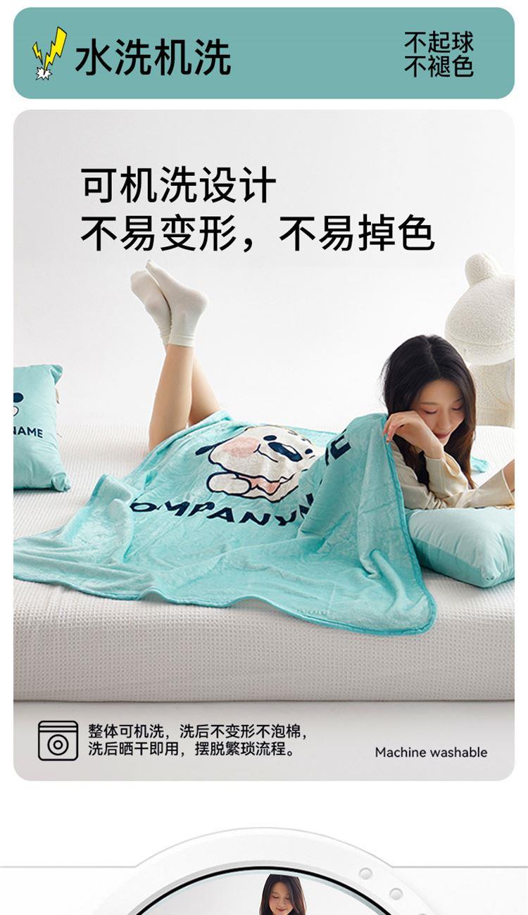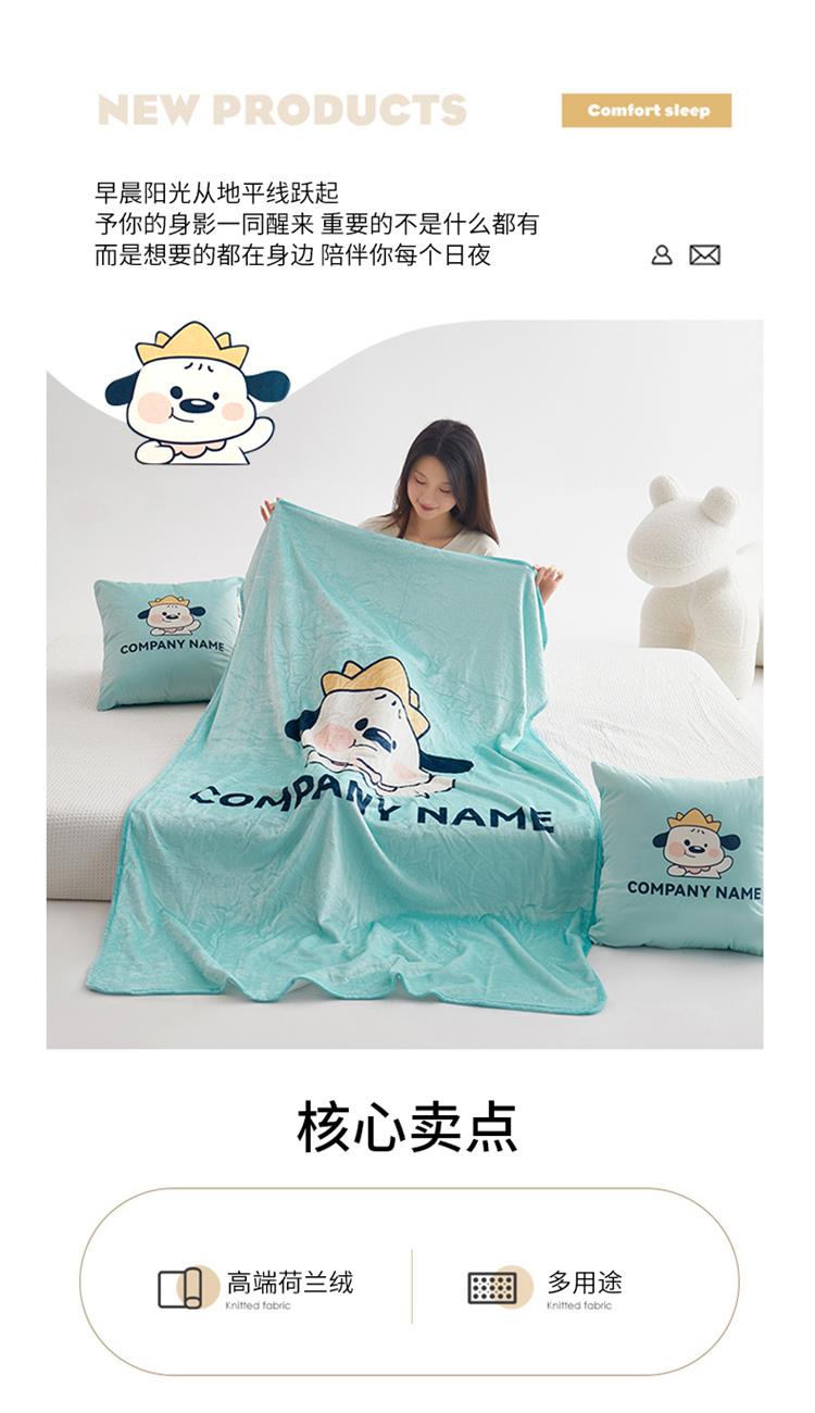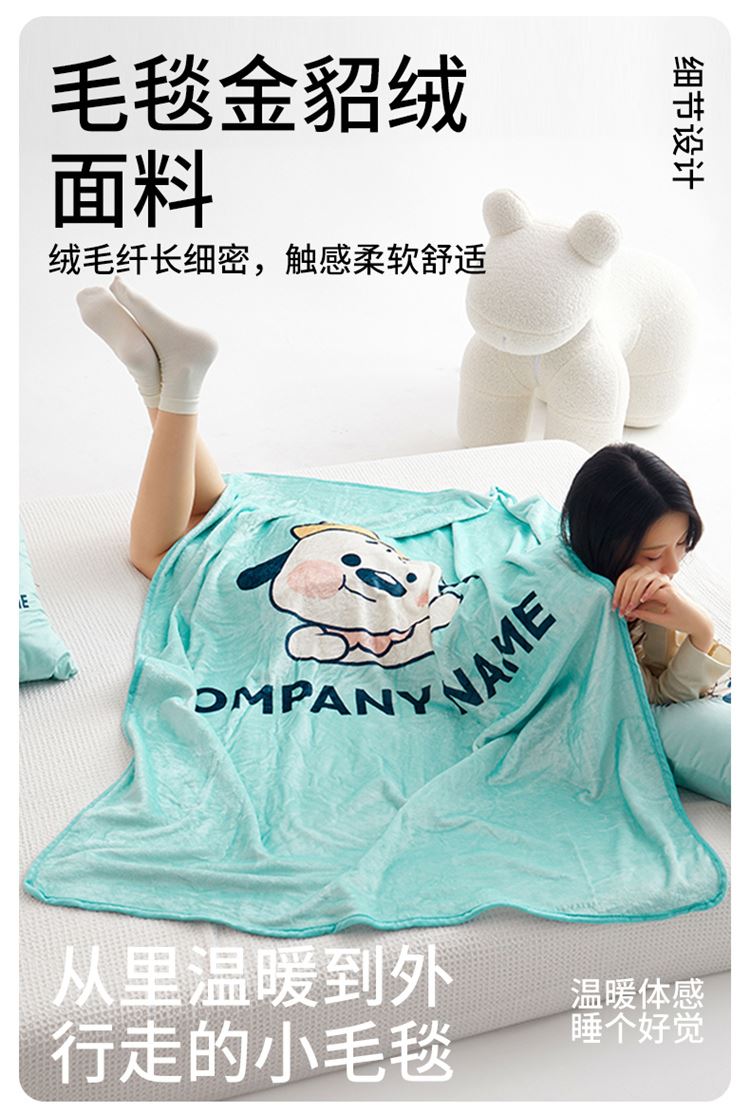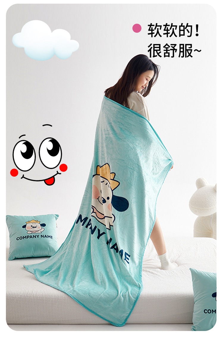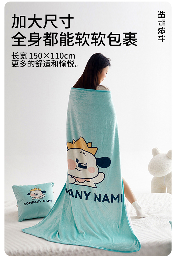 绒毯采用高克重金貂绒面料,大版数码印花工艺,彰显独特青春美学。毯子全部采用立体小包边工艺设计,更加彰显品质!支持水洗、机洗,各种洗,不褪色、不起球,不起静电!并且本款采用可拆卸式设计,毯子取出抱枕仍然饱满有型,午休时拉链打开就可以秒变成两个产品!一个枕头+一条毯子。