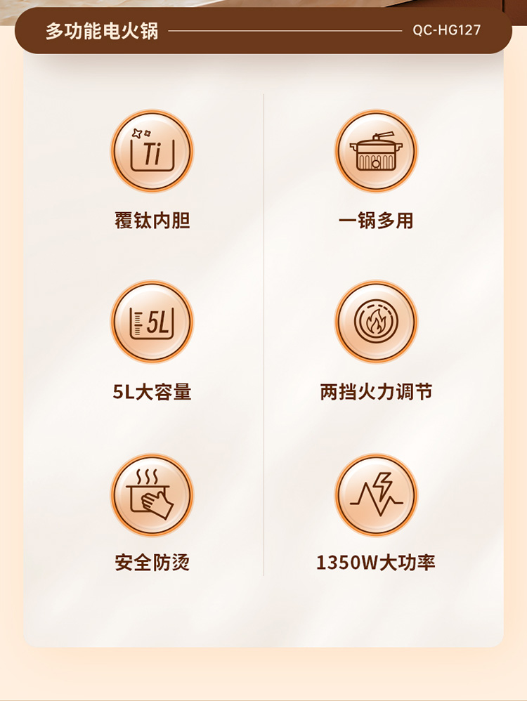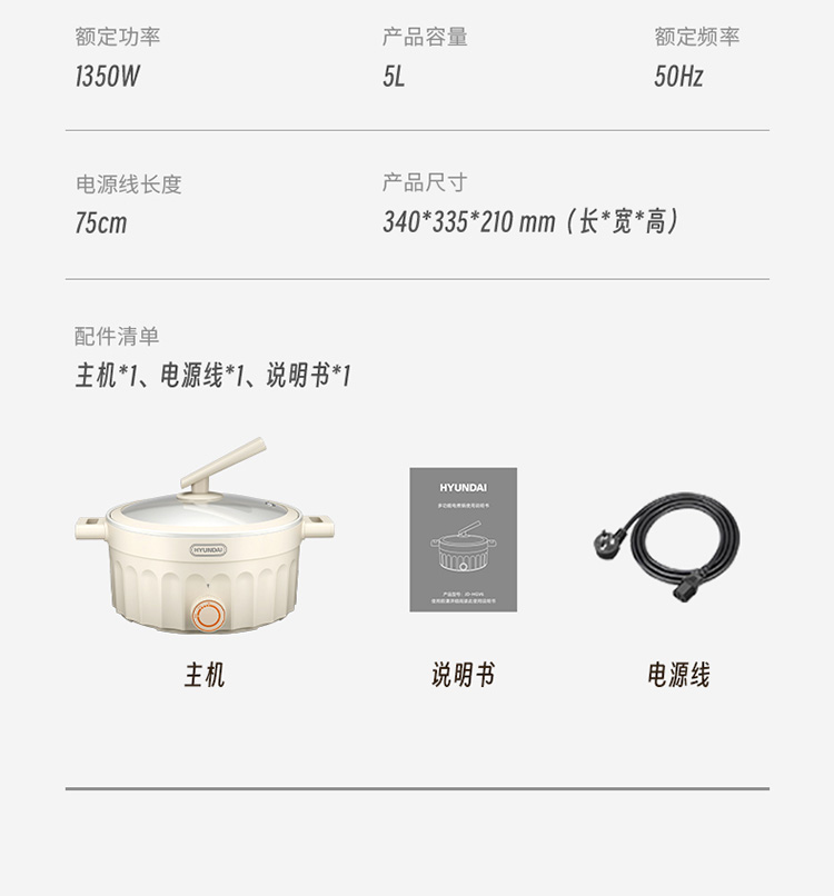颜色:米黄色 ,产品净重 :2.0kg ,毛重:2.2kg 额定功率(W):1350W 容量:5.0L 产品尺寸:365*295*190mm 包装尺寸:335*335*210mm 1、升级钛涂层内胆,5L大容量,两档火力调节,可煎、炒、炸,煮,火锅样样精通; 2、两挡旋钮调火,小火750W慢煮,大火1350W速热,满足不同烹饪需求; 3、一锅多能,样样精通,一锅多用:煮、炖、焖、炸、火锅; 4、5L大容量,团圆聚餐,亲友组局,过节大餐,都可以大饱口福; 5、把手+手柄+锅身均采用防烫材质。