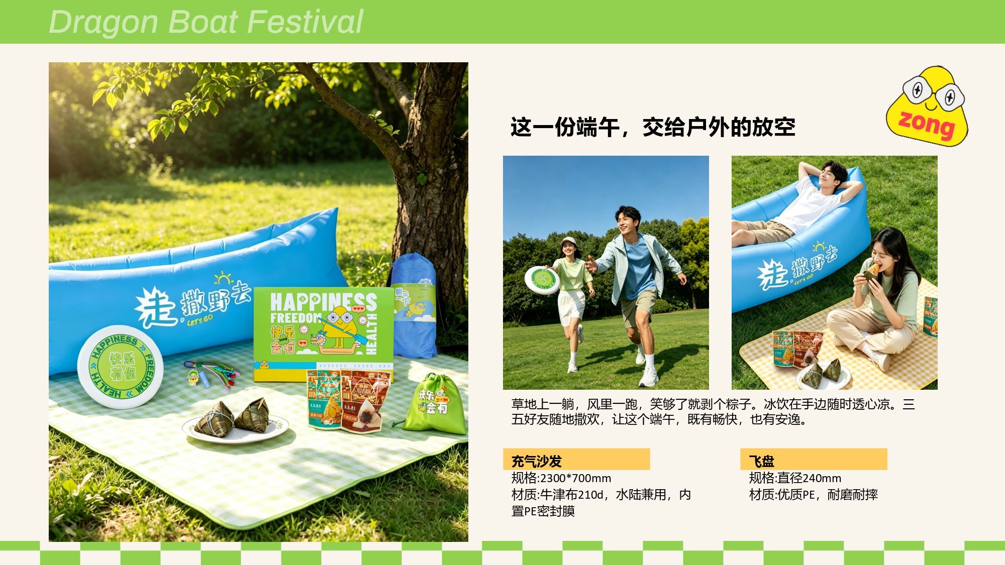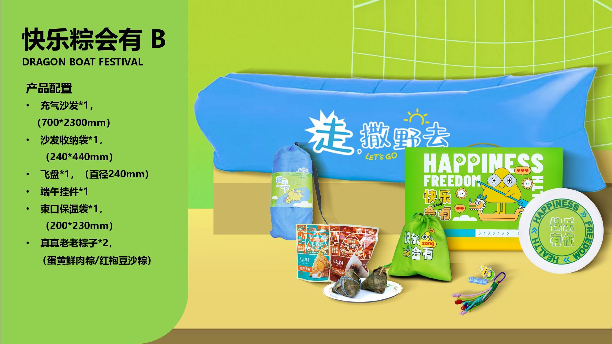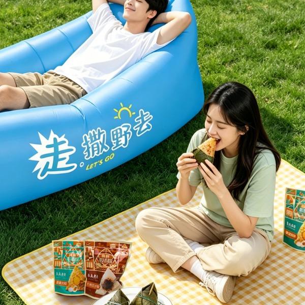 产品配置 充气沙发*1, (700*2300mm) 沙发收纳袋*1,(240*440mm) 飞盘*1,(直径240mm) 端午挂件*1 束口保温袋*1,(200*230mm) 真真老老粽子*2, (蛋黄鲜肉粽/红袍豆沙粽)