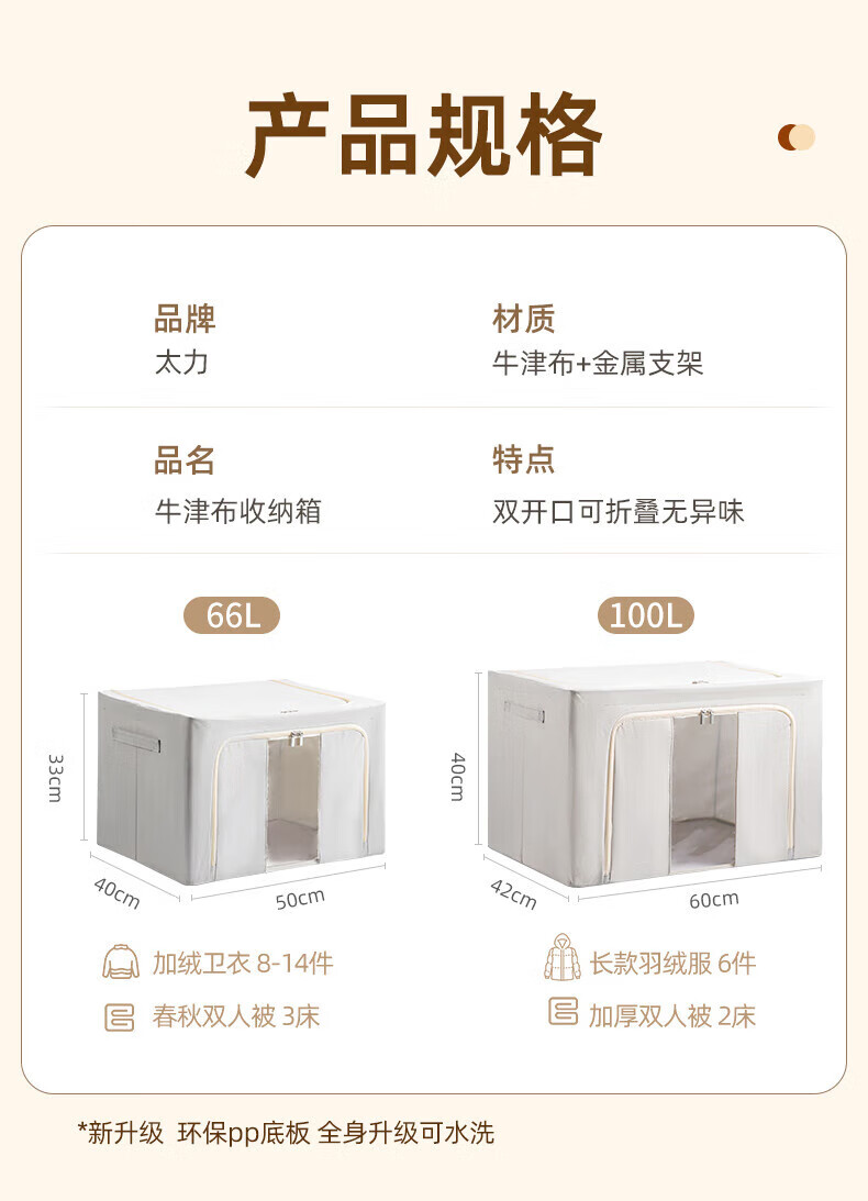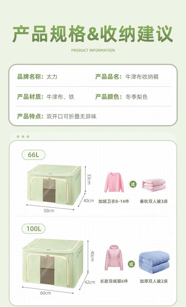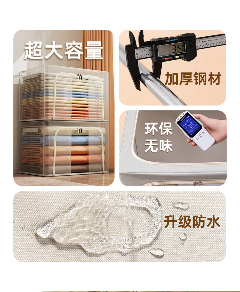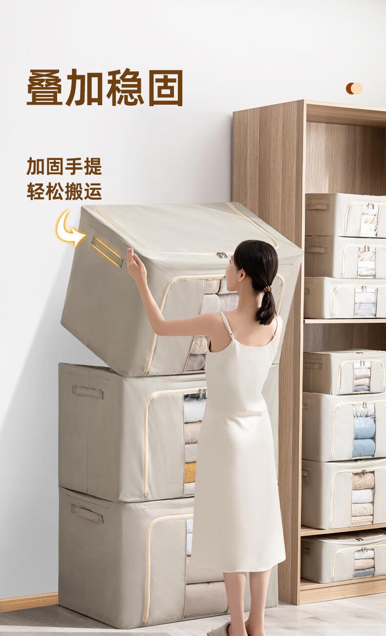 50*40*33cm(1个) 产品尺寸:50*40*33cm(1个) 材质:牛津布 适用对象:衣服,棉被,书籍,玩具 类别:外袋 适用场景:卧室,家居 颜色:宝石蓝,香芋紫,极光粉,米灰色,冬梨色 功能:便携,收纳 产品描述:一箱多用,水洗不变形,叠加稳固
